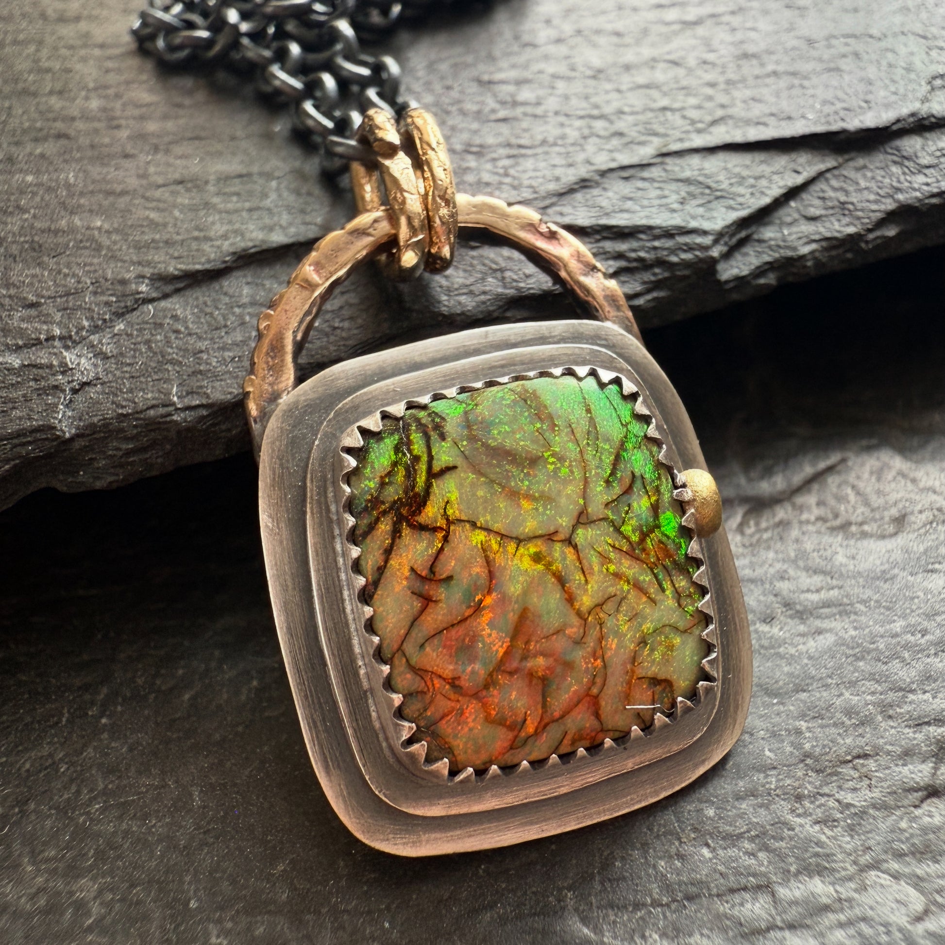 Featuring a colourful Monarch opal set in fine silver and layered setting of sterling silver. The pendant hangs from gold bronze links and a dark sterling silver chain. The chain is 18” approximately.