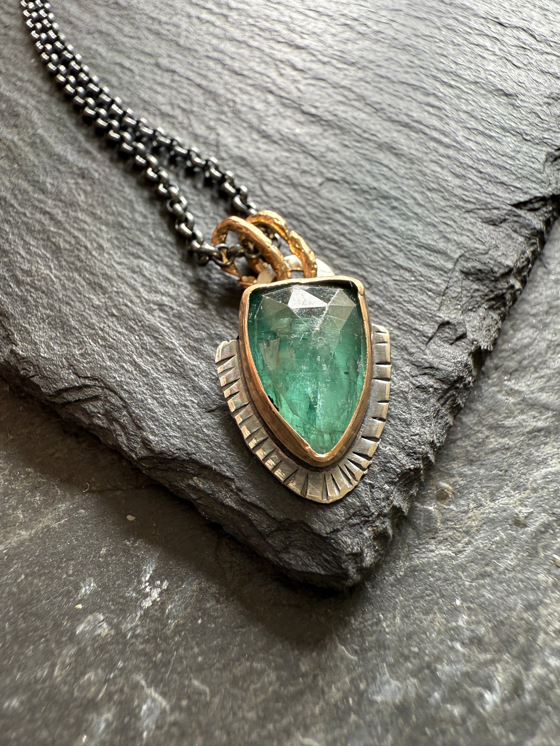 Featuring a beautiful emerald green kyanite stone. The gemstone is set in 14k gold fill on sterling silver. The pendant hangs from a pretty 18” lightly oxidised sterling chain and gold bronze links. The pendant measures 20mm x 14mm approximately.