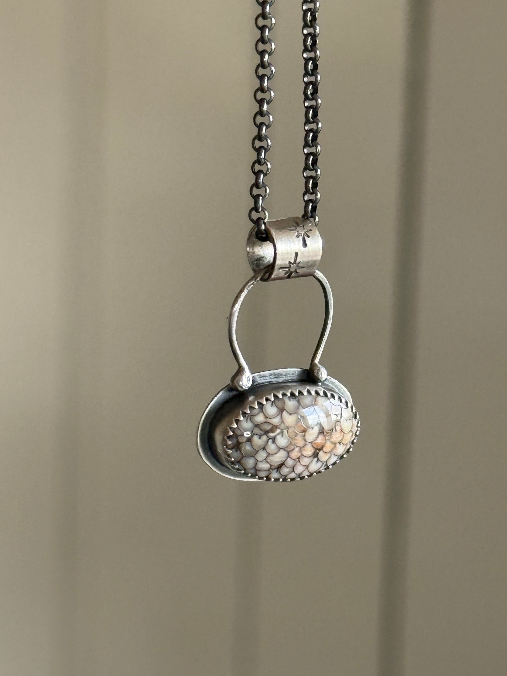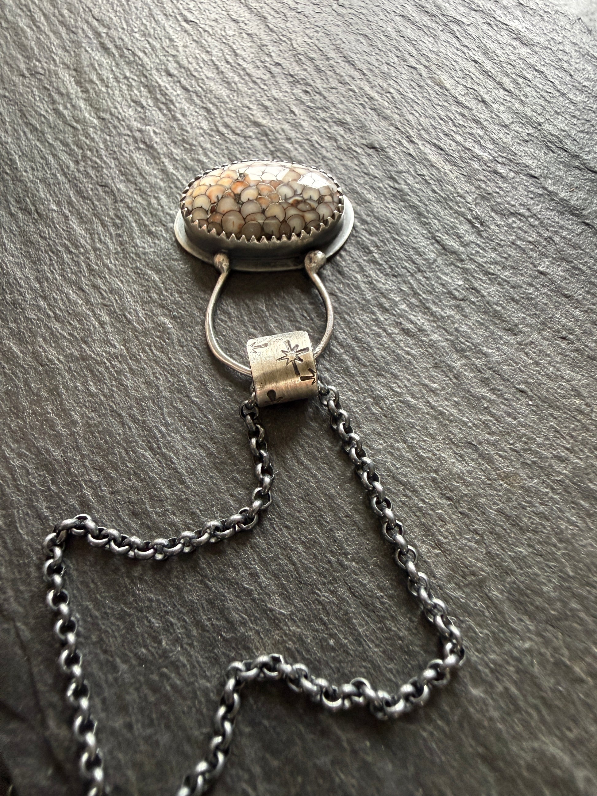 Featuring a fossilised snakeskin pendant set in fine and sterling silver, a hand forged bail and a dark oxidised sterling silver 18” chain with a hand oxidised hook closure. The stone measures 19mm x 10mm.