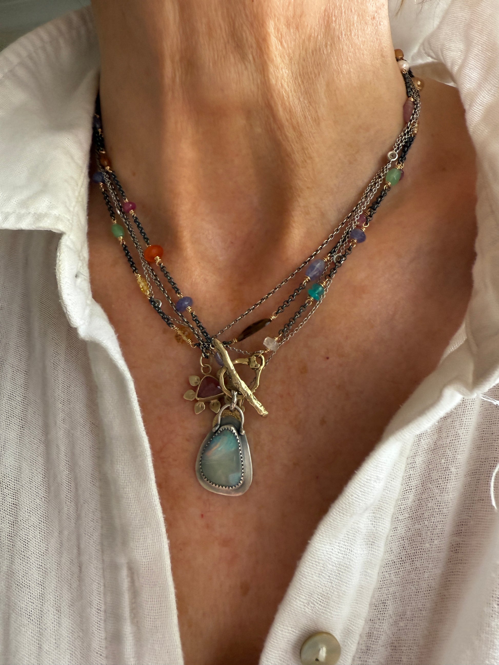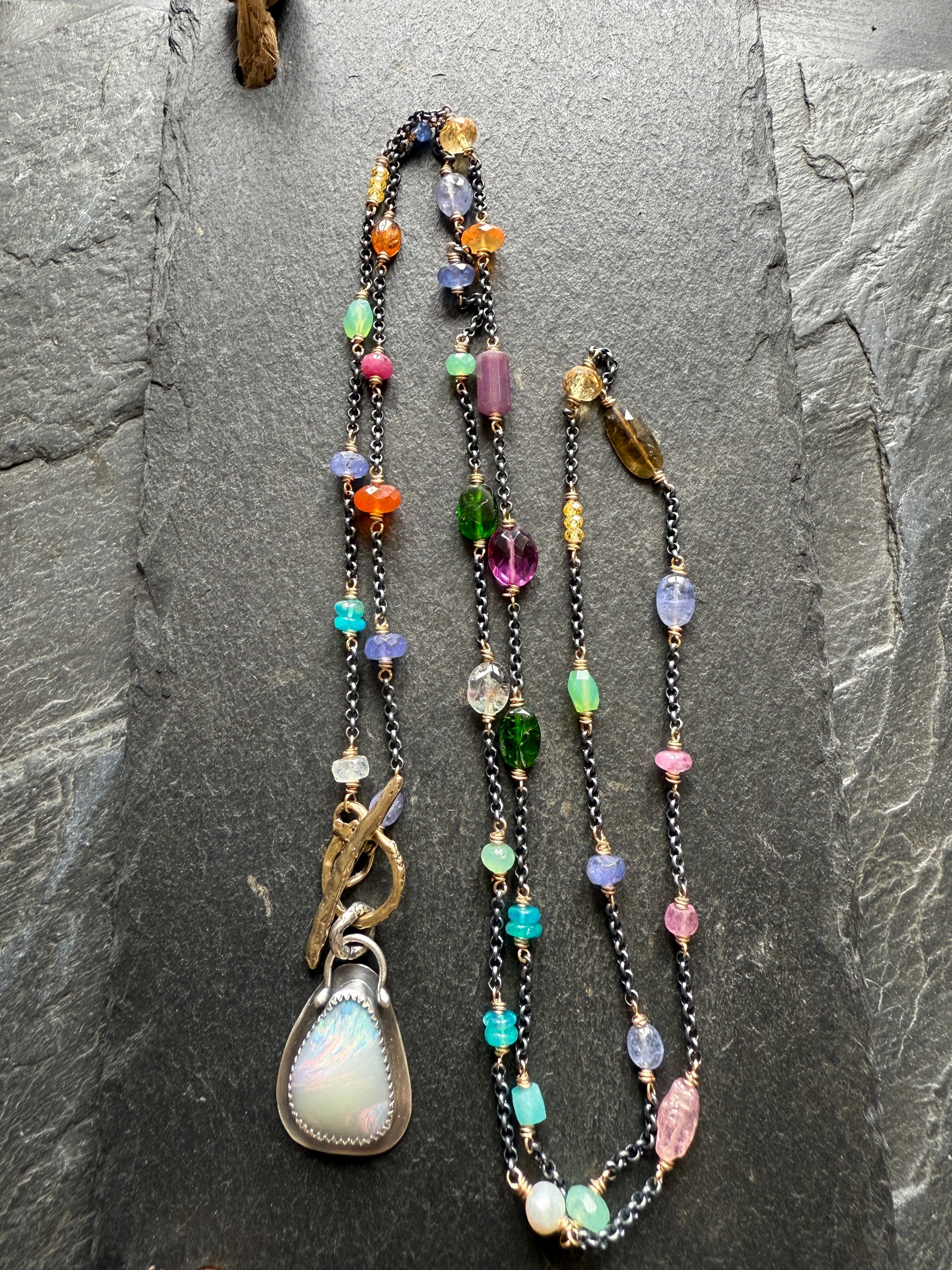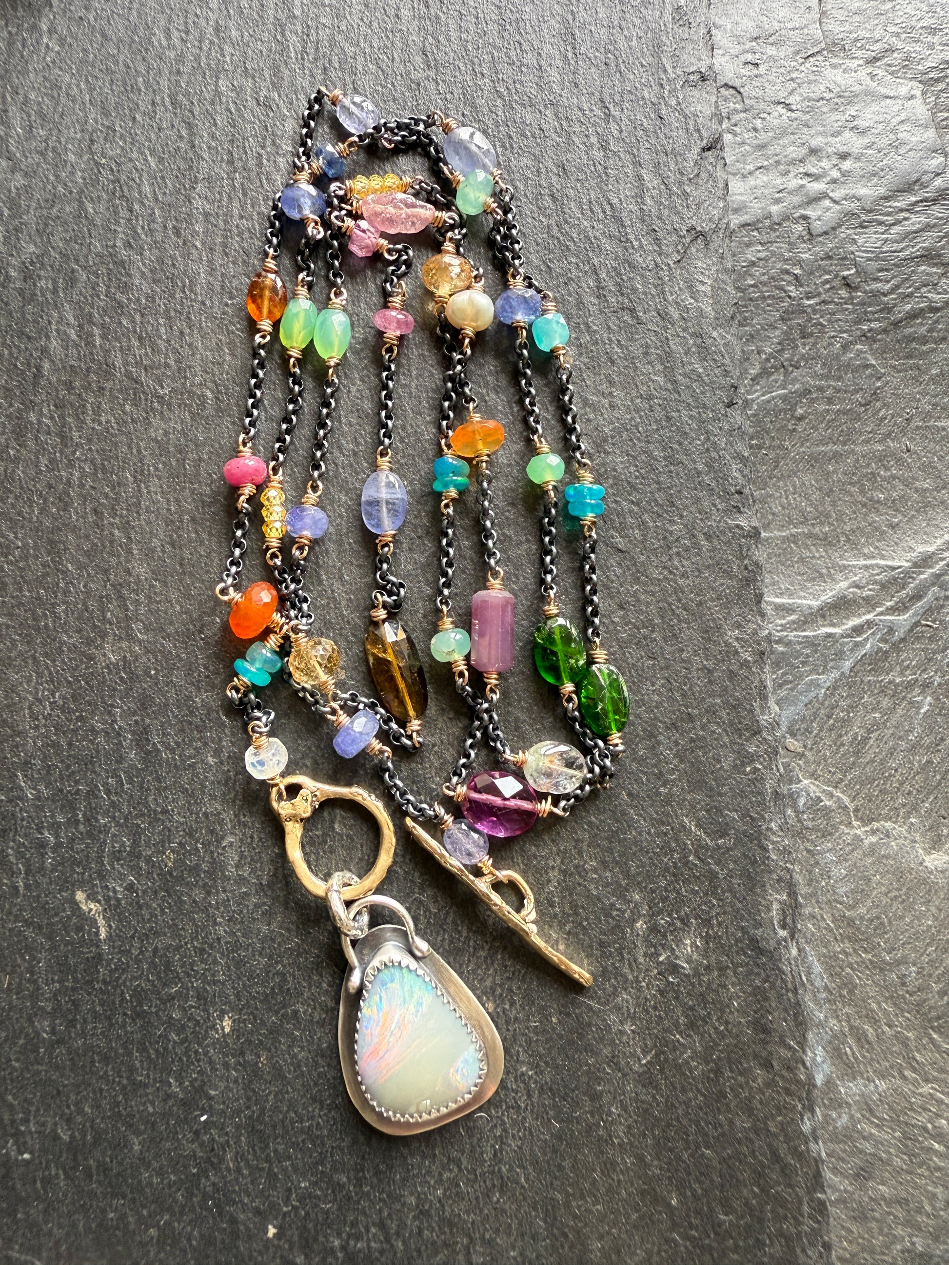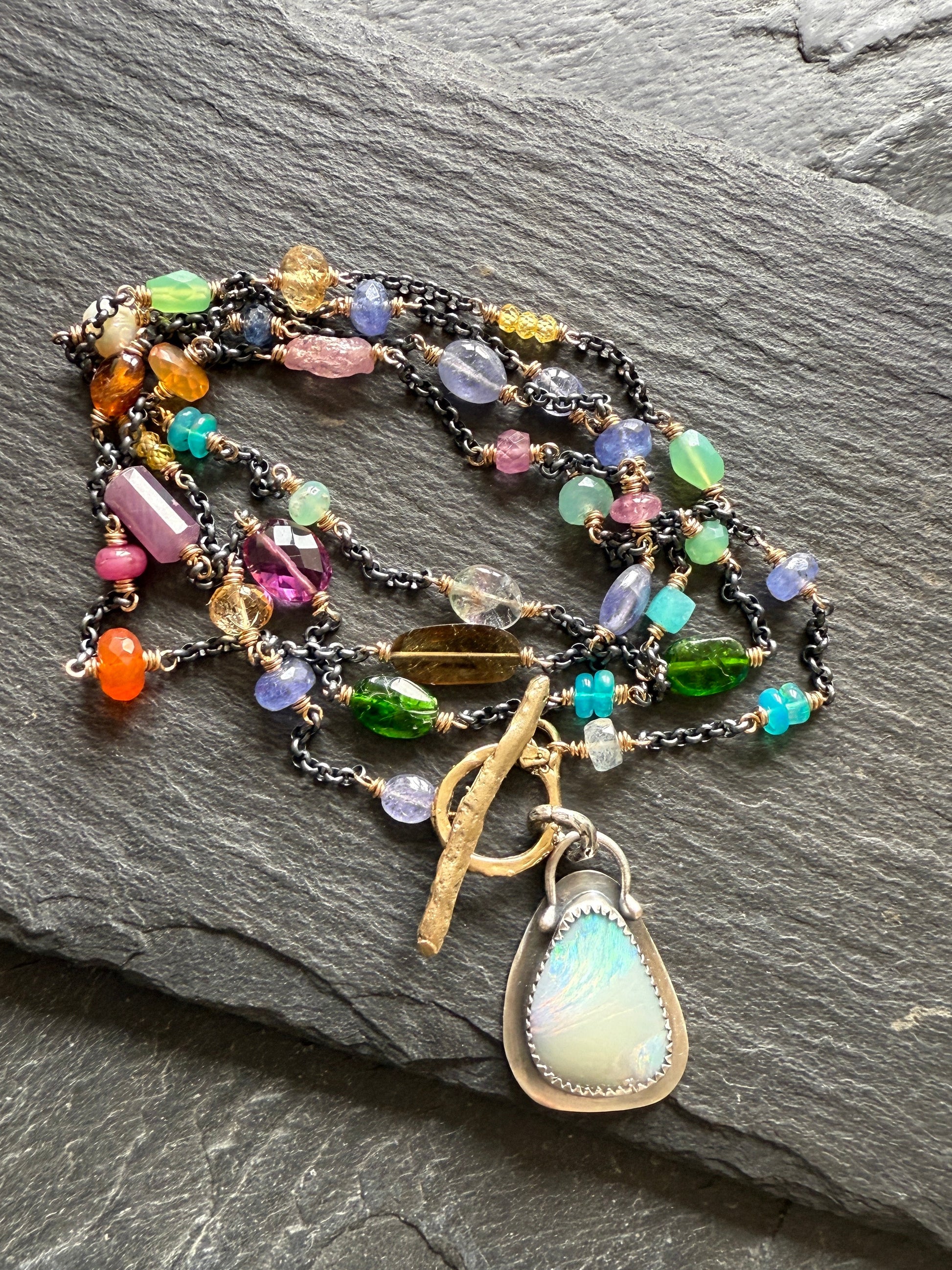 Featuring a boulder opal charm set in sterling, with and a plethora of glorious gemstones, wire wrapped in 14K gold fill wire on a darkly oxidised sterling silver chain. This versatile piece can be worn in different ways from a long boho necklace, a layered doubled necklace or even a bracelet (to fit 6 - 6.25” wrist). This beauty measures 35 inches approximately. The opal hangs from a gold bronze toggle and link.
