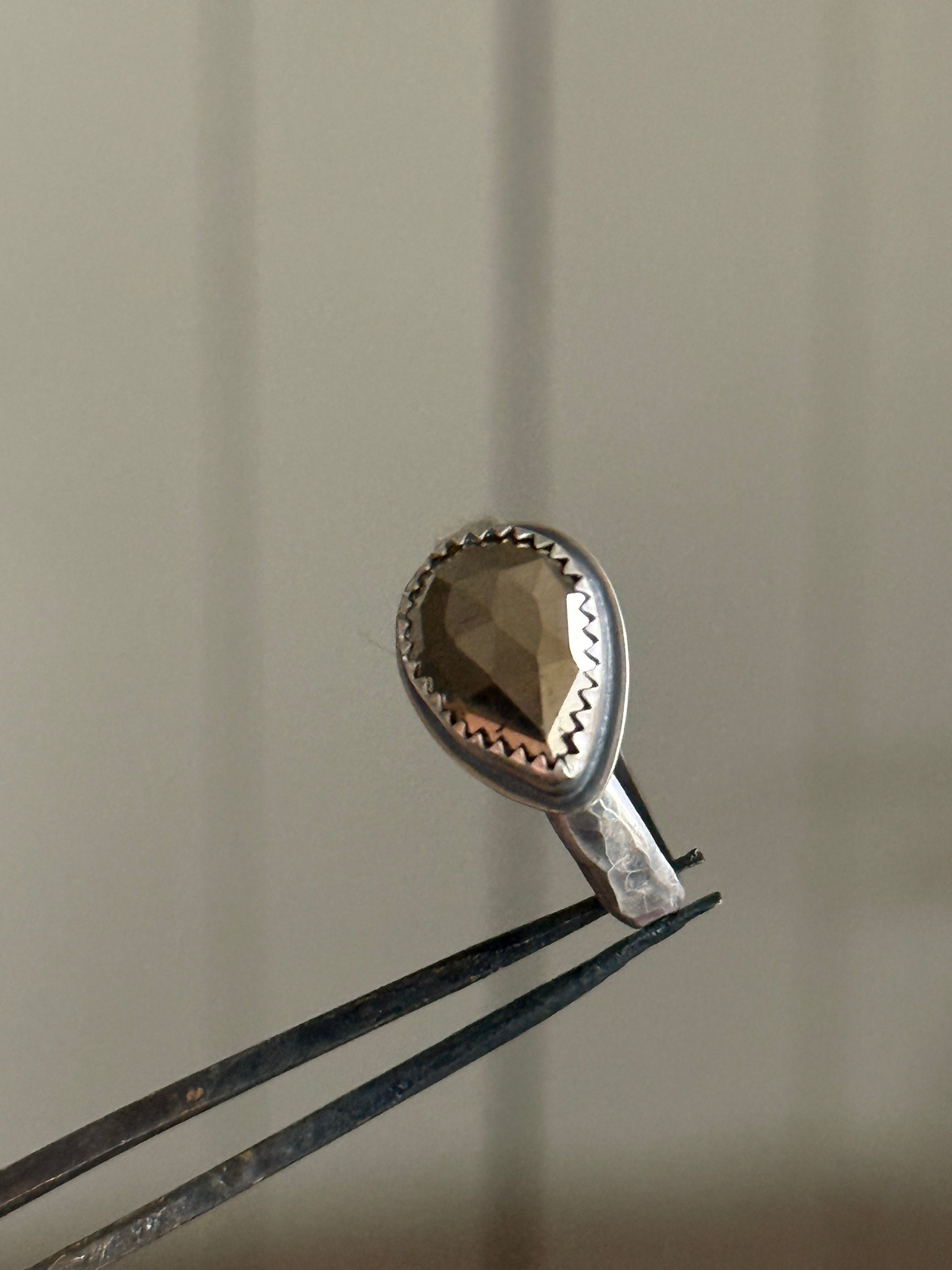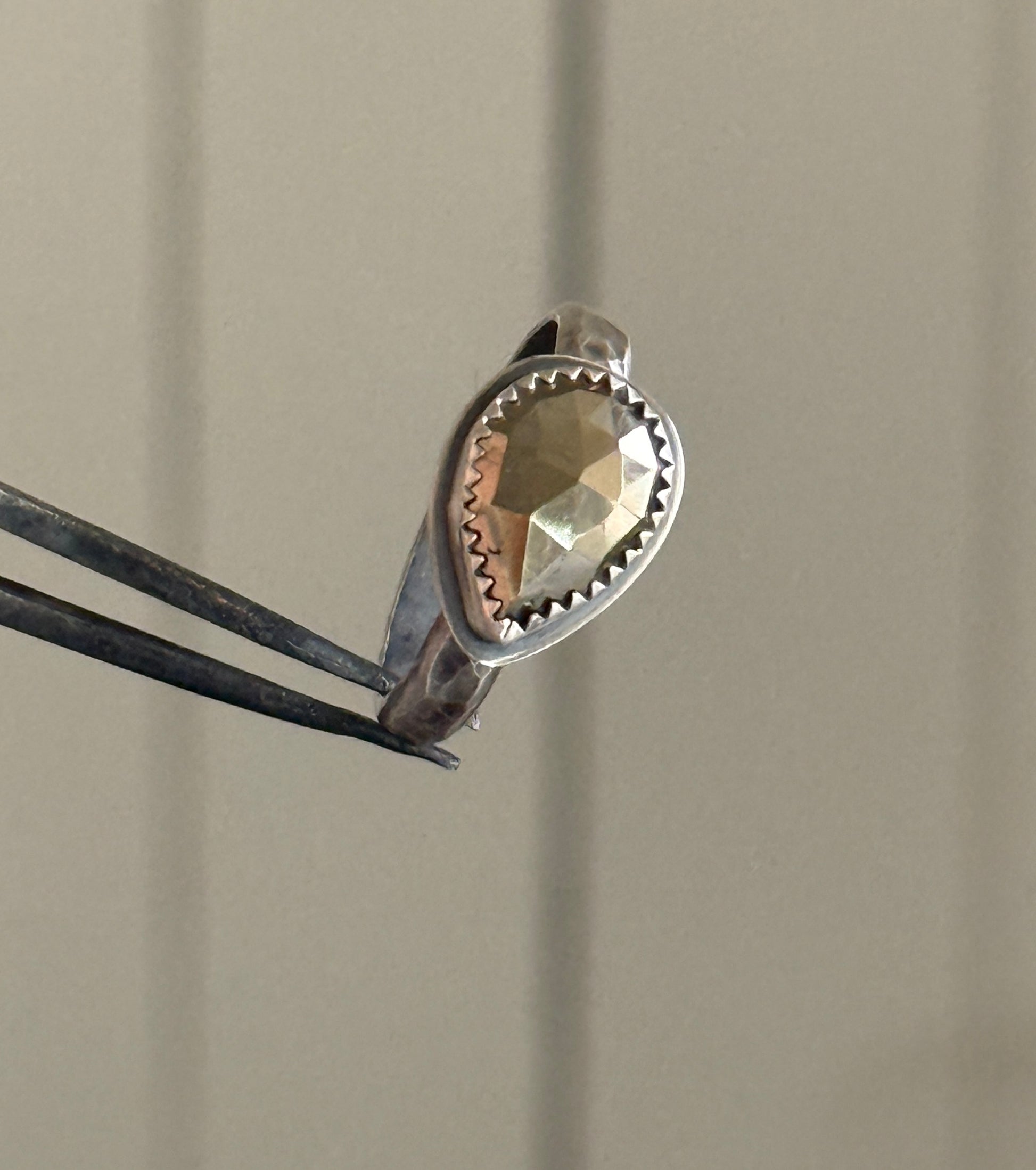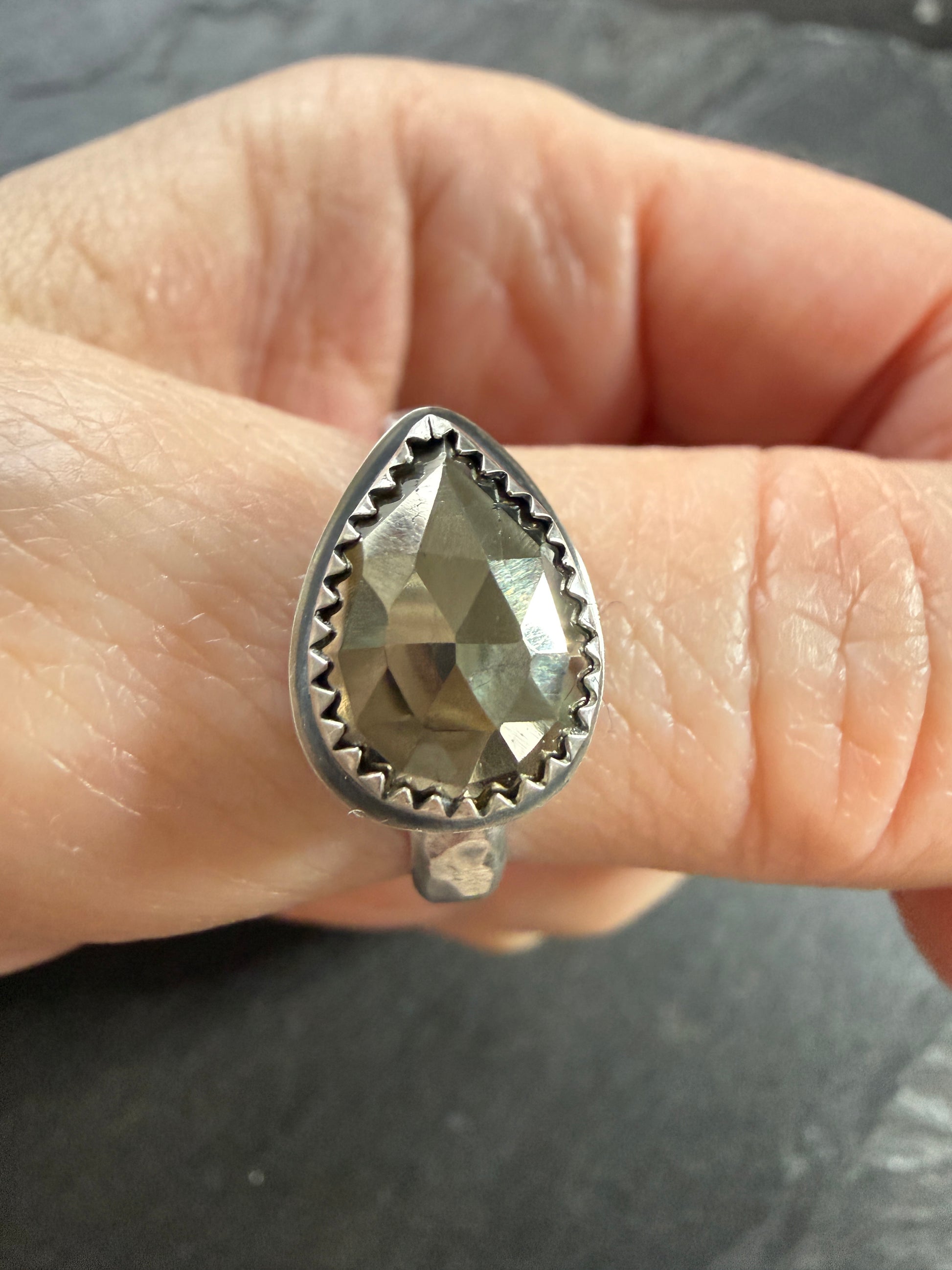 Golden Pyrite ring, faceted for maximum sparkle, set in fine and sterling silver. The band is hammered and texturized, oxidised and lightly polished. Size is a US 8 UK P 1/2.