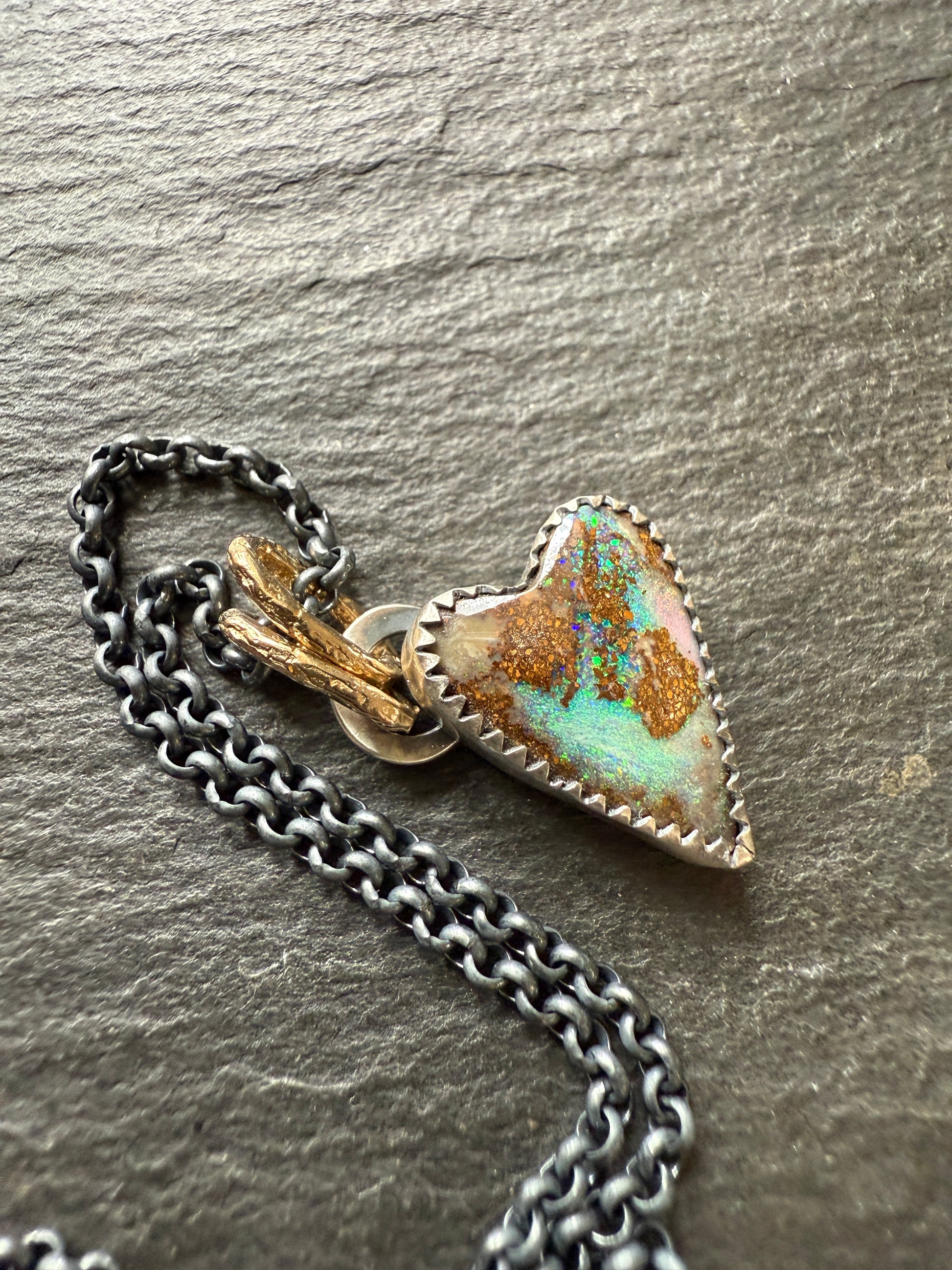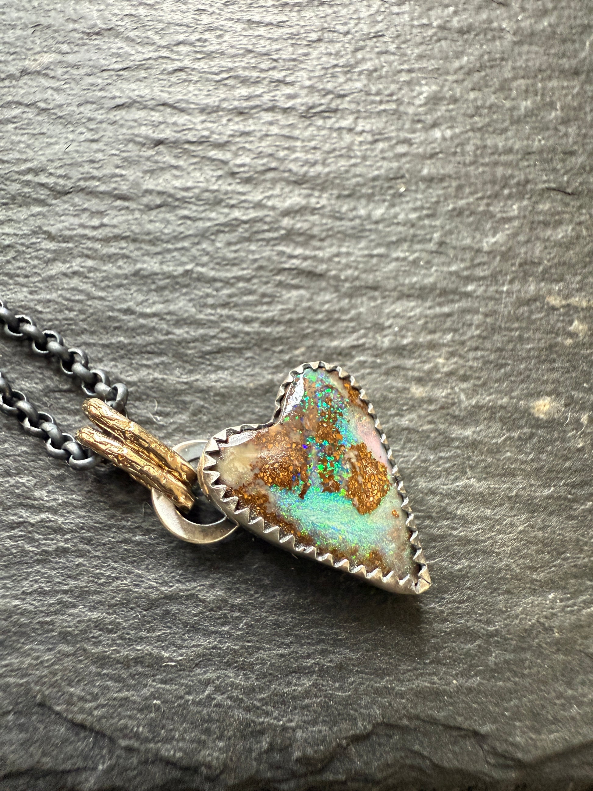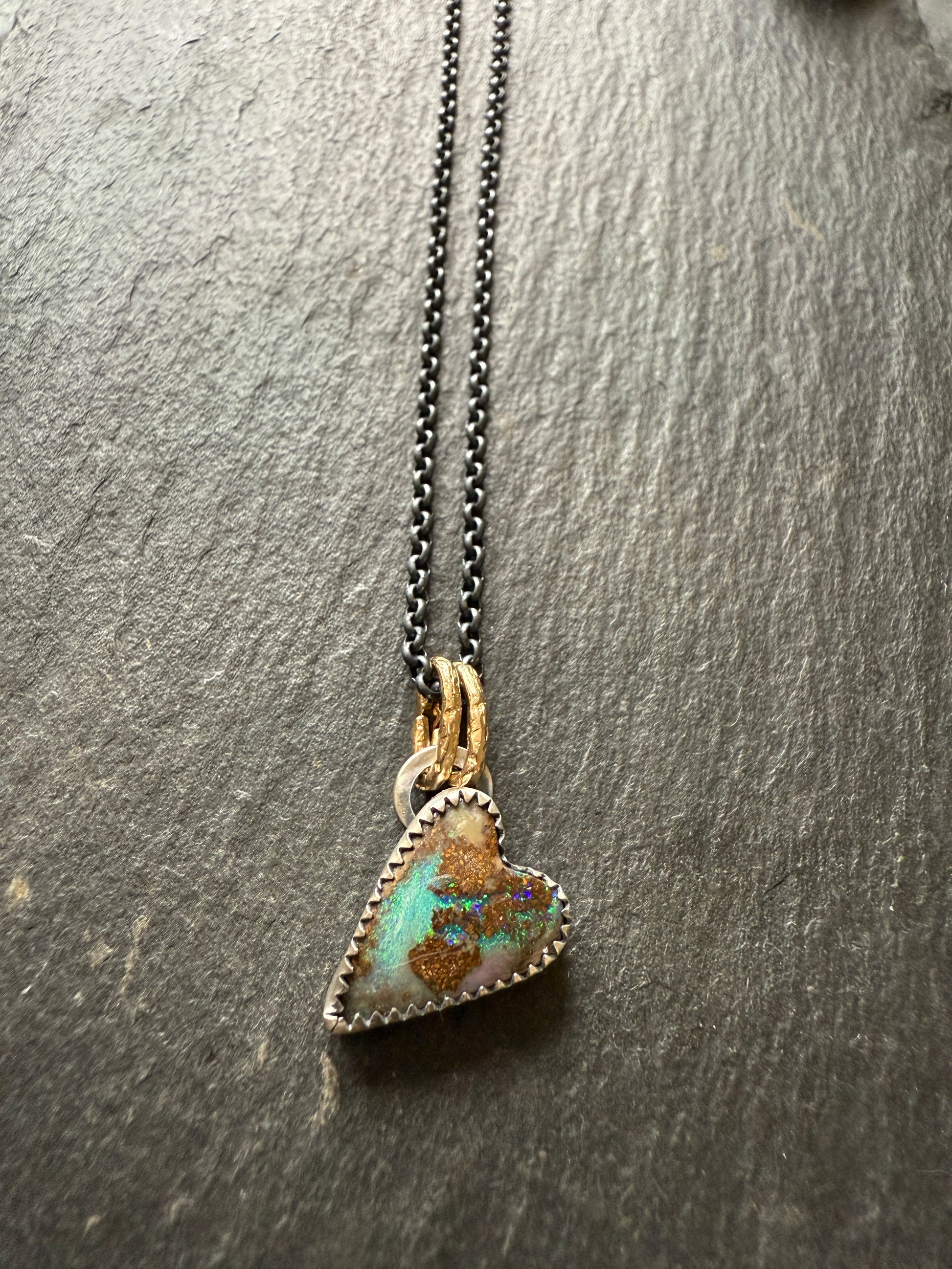 Featuring a gorgeous boulder opal shaped into a heart. The little beauty has green colour play and has been bezel set in fine and sterling silver, Oxidised and lightly polished, she hangs from a dark oxidised sterling 18” chain.