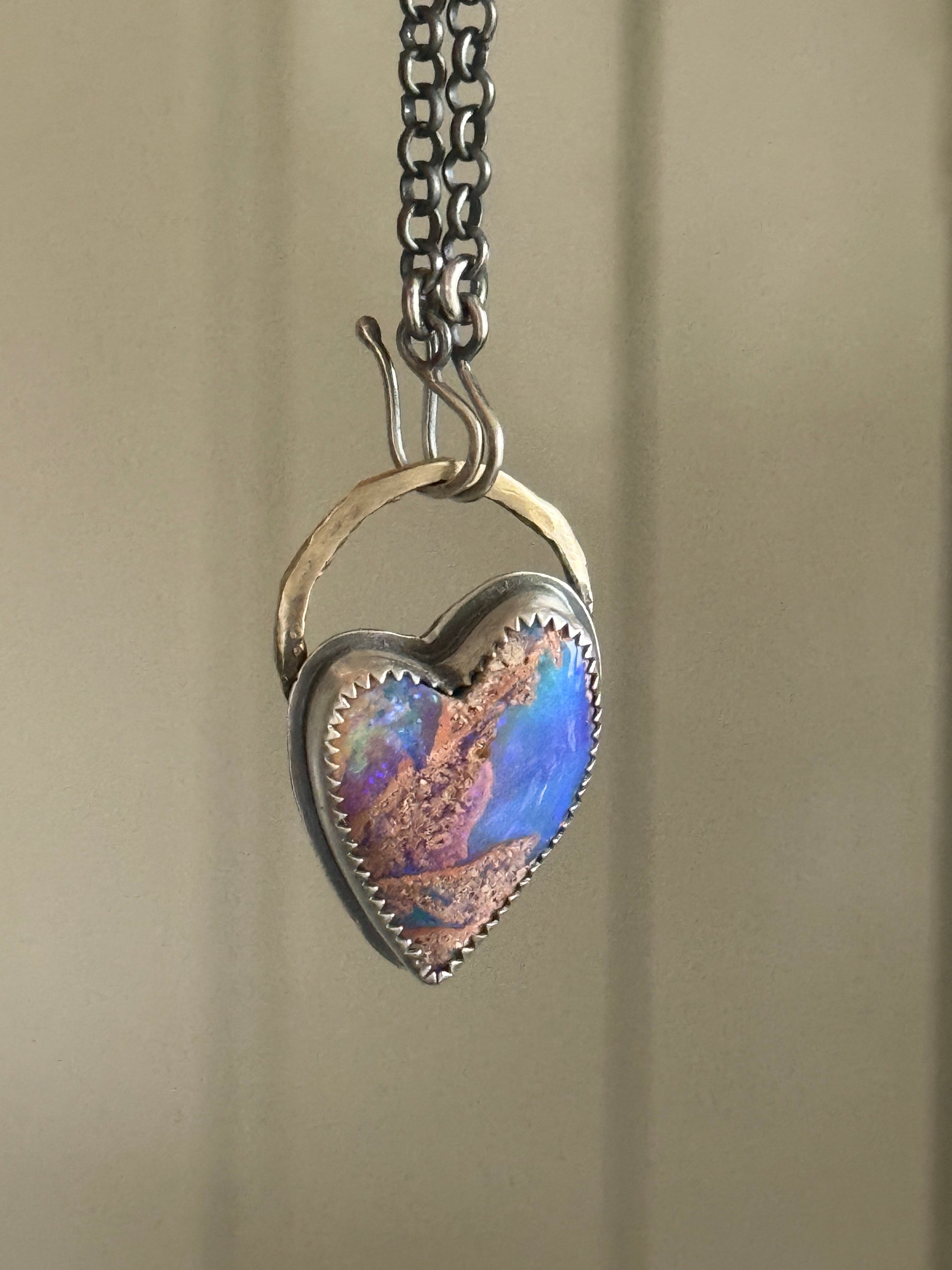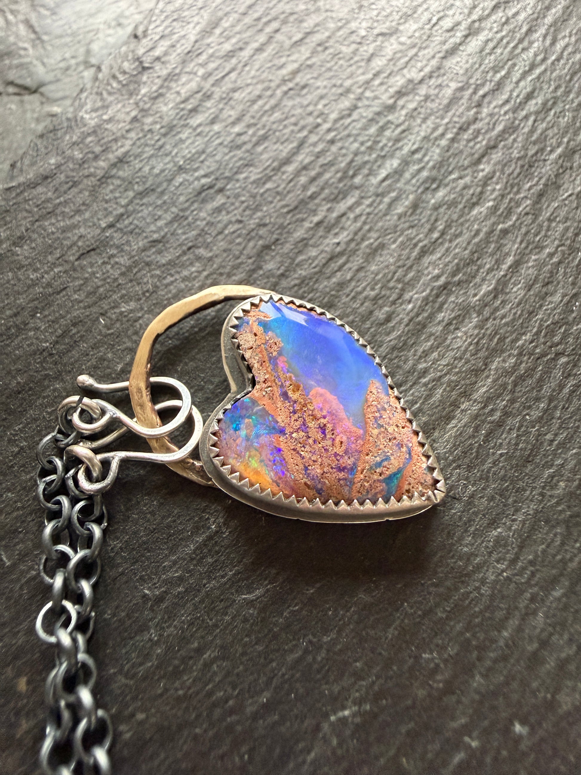 Featuring a stunning Boulder Opal heart pendant set in fine and sterling silver with a gold bronze link. The pendant hangs from a dark oxidised 18” sterling silver with hand forged hooks. The stone measures 22mm x 16mm and is 7.25 cts.