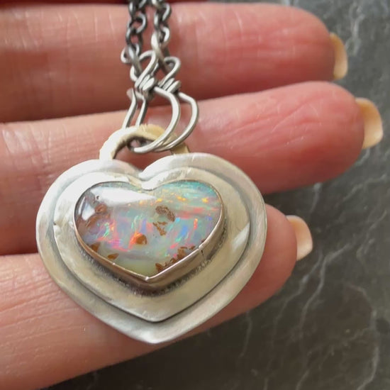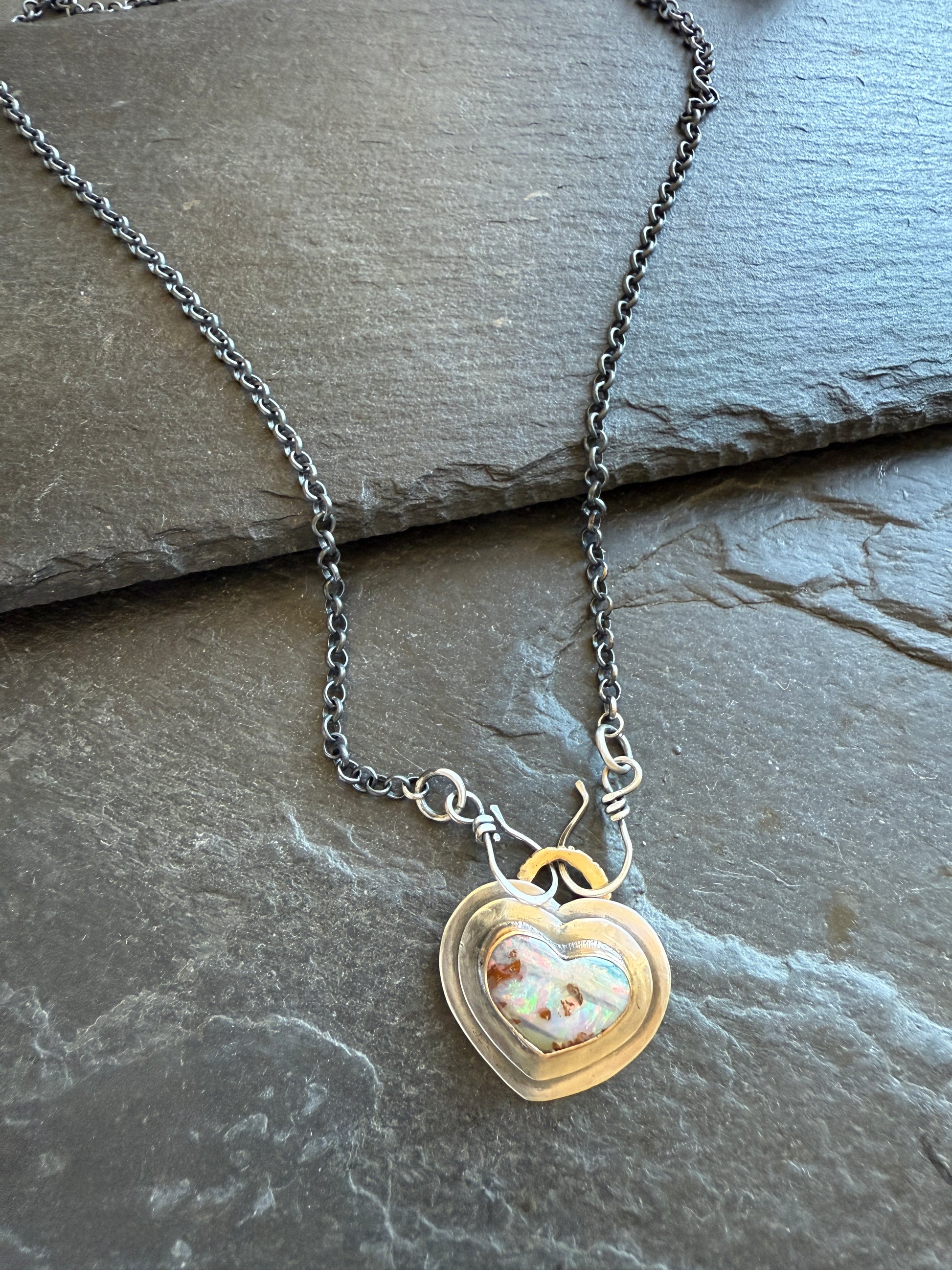 Featuring a heart boulder opal, bezel set in 24k gold fill and layered sterling silver with a gold bronze link. The pendant hangs from an 18” dark oxidised chain with hand forged hooks. Designed to front fasten. This chain can also be used with other of your own pendants. Stone measures 14mm x 10mm. The pendant measures 25mm x 25mm.