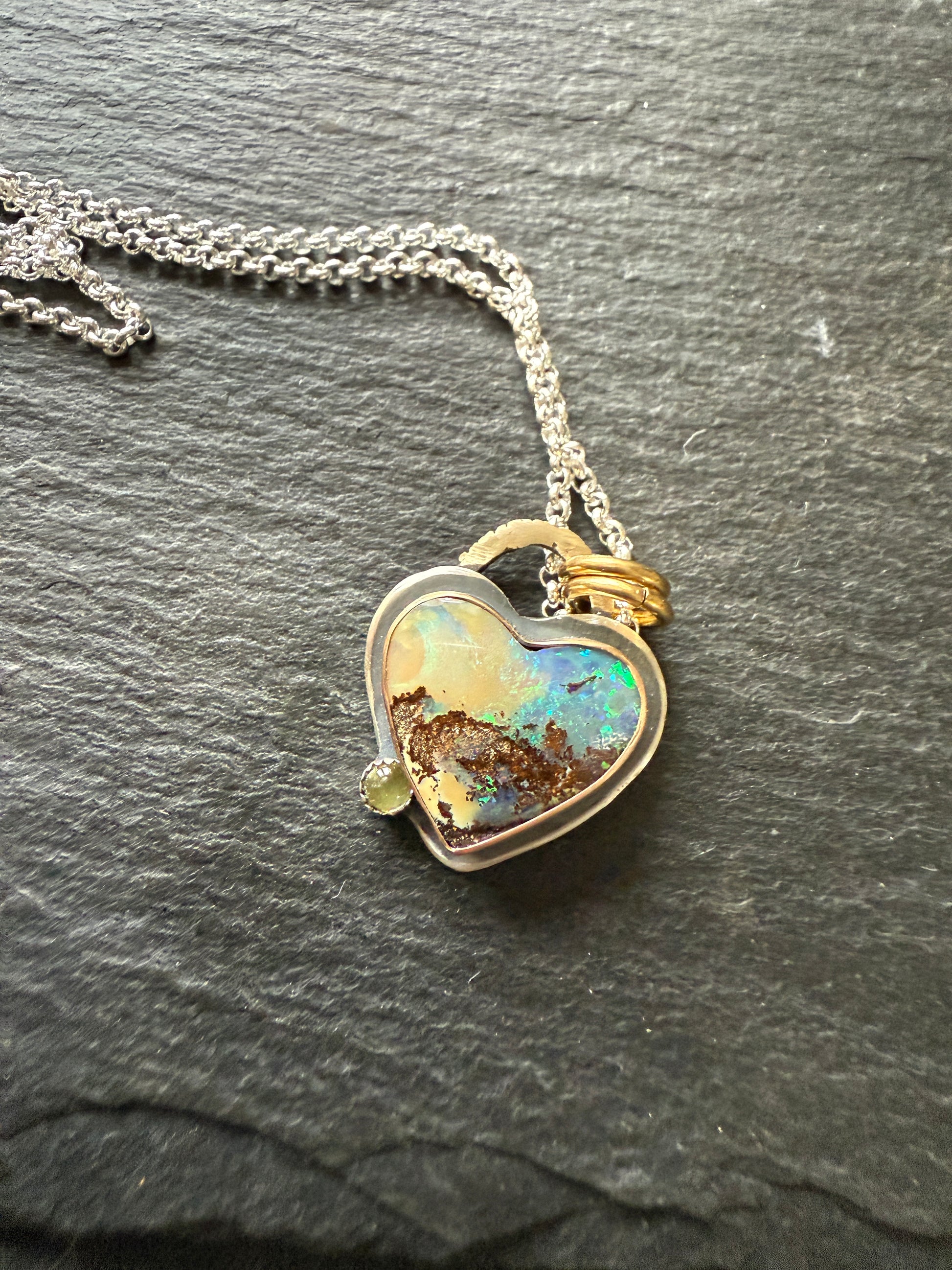 Featuring a beautiful heart opal set in 14k gold fill on sterling silver. This opal has blue, green and purple colour play. I have accented this beauty with a dinky amethyst. This pendant hangs from is a shiny sterling silver (can be oxidised should you wish) and is 18”. The stone measures 13 mm x 15mm approximately and is 5.55 cts.