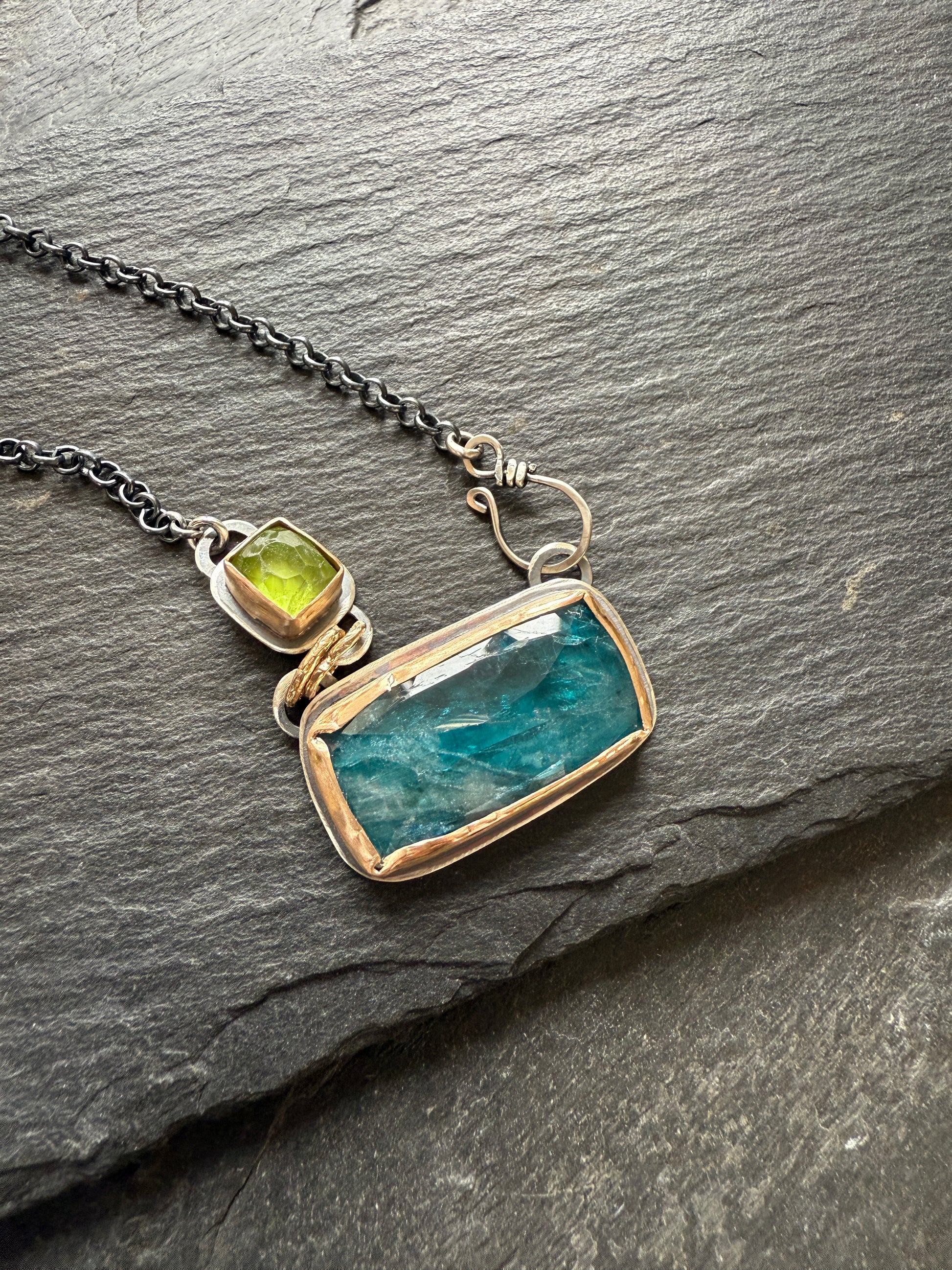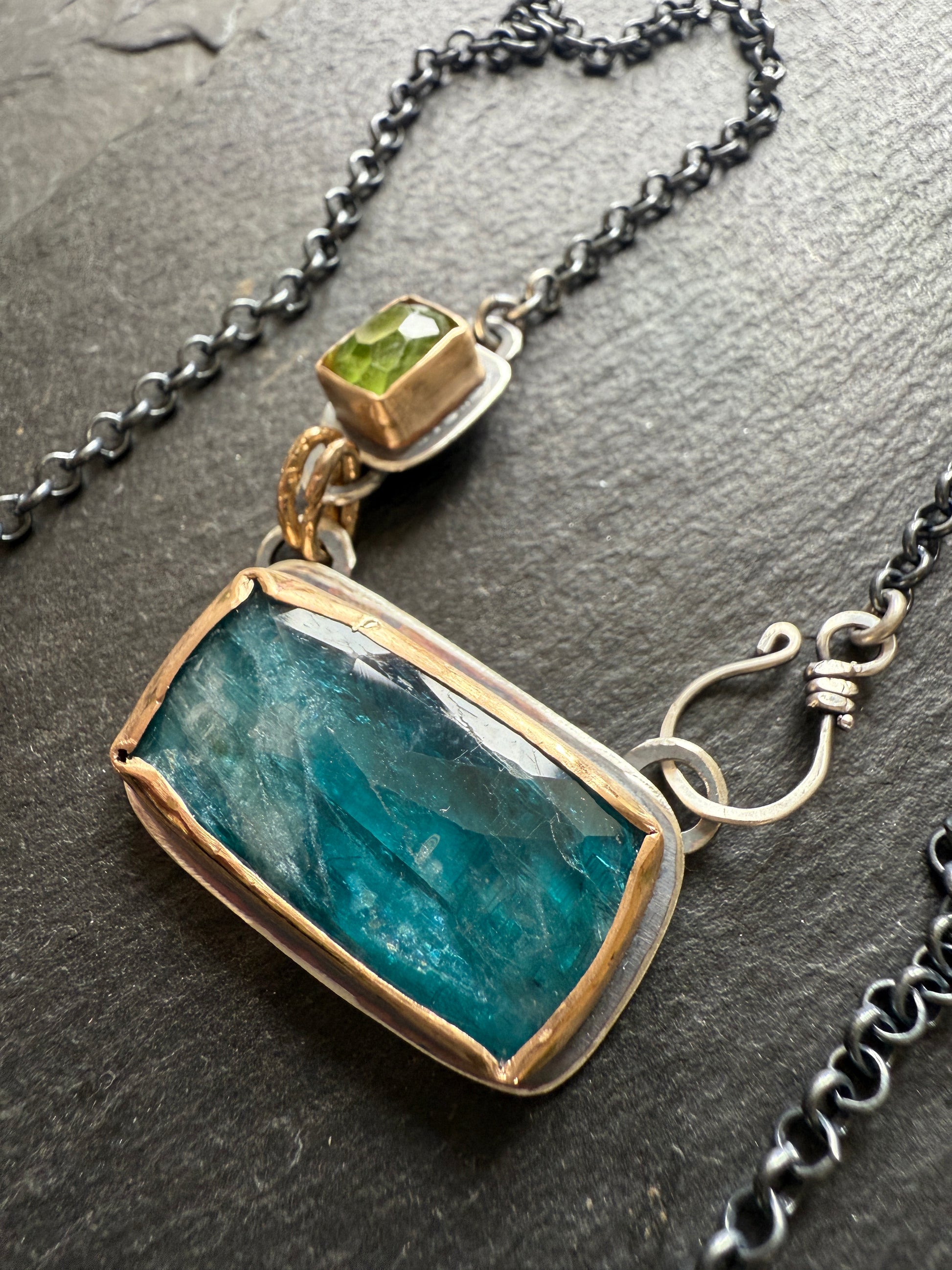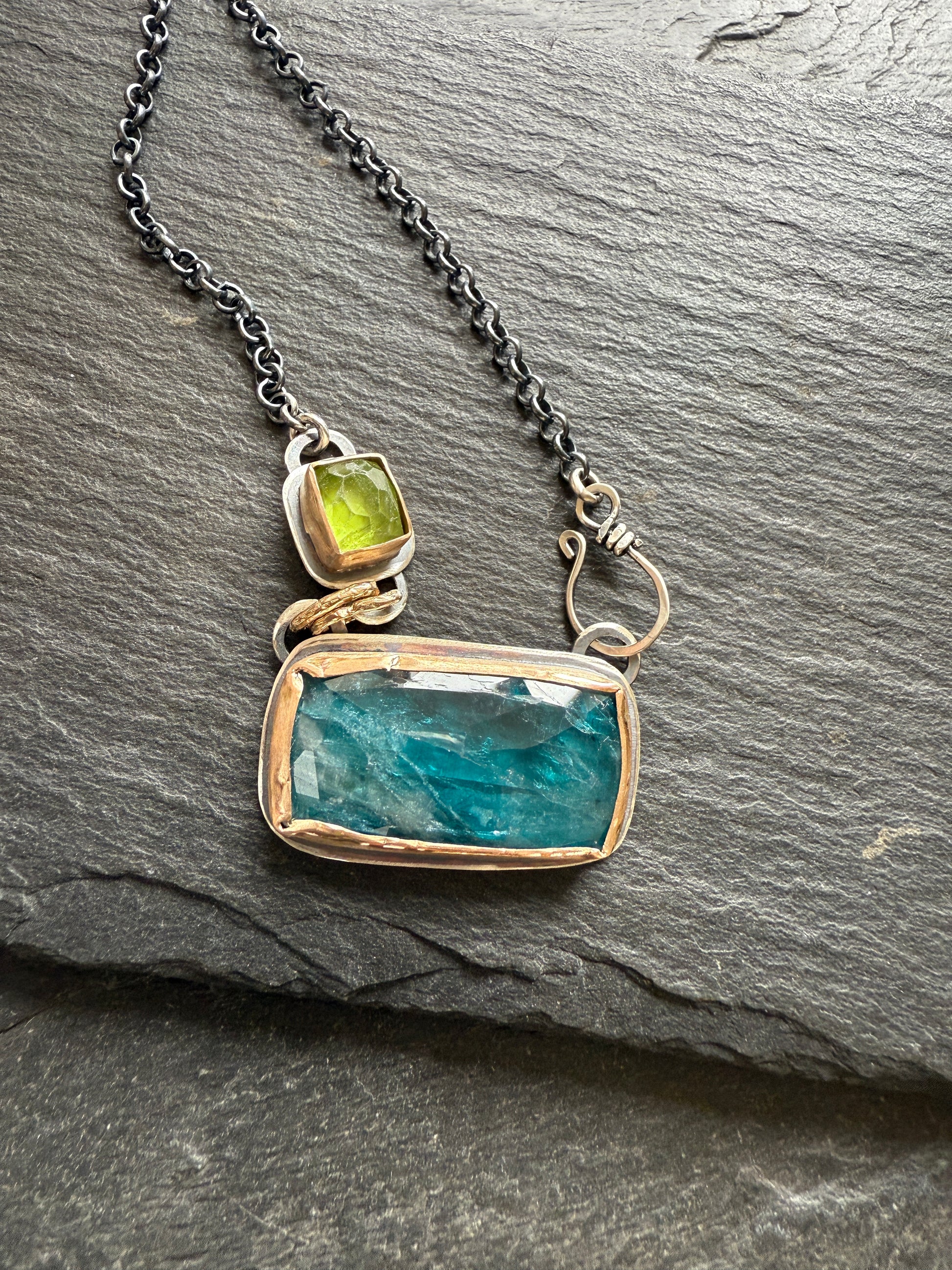 Featuring a Gorgeous kyanite gemstone in a lovely teal hue with natural inclusions, and a faceted peridot. These lovely stones are set in a rustic setting with 14k gold fill wire on sterling silver, then oxidised and lightly polished. The pendant hangs from a dark oxidised silver chain with a hand forged hook. The chain is 15.5” in length, so great for layering. The pendant measures 32mm.