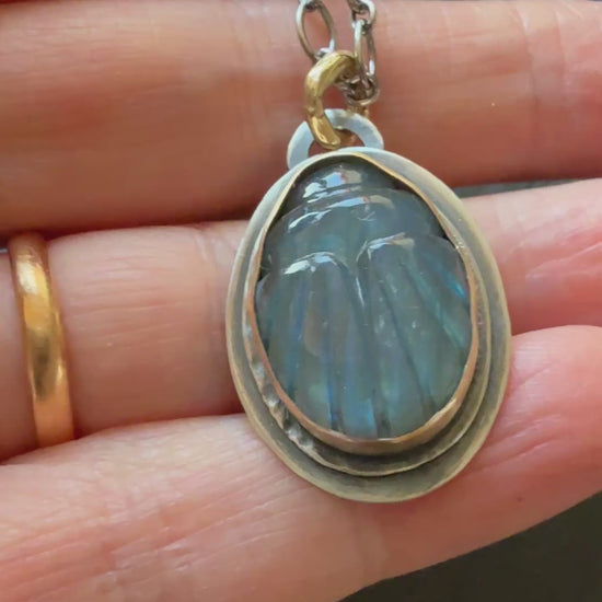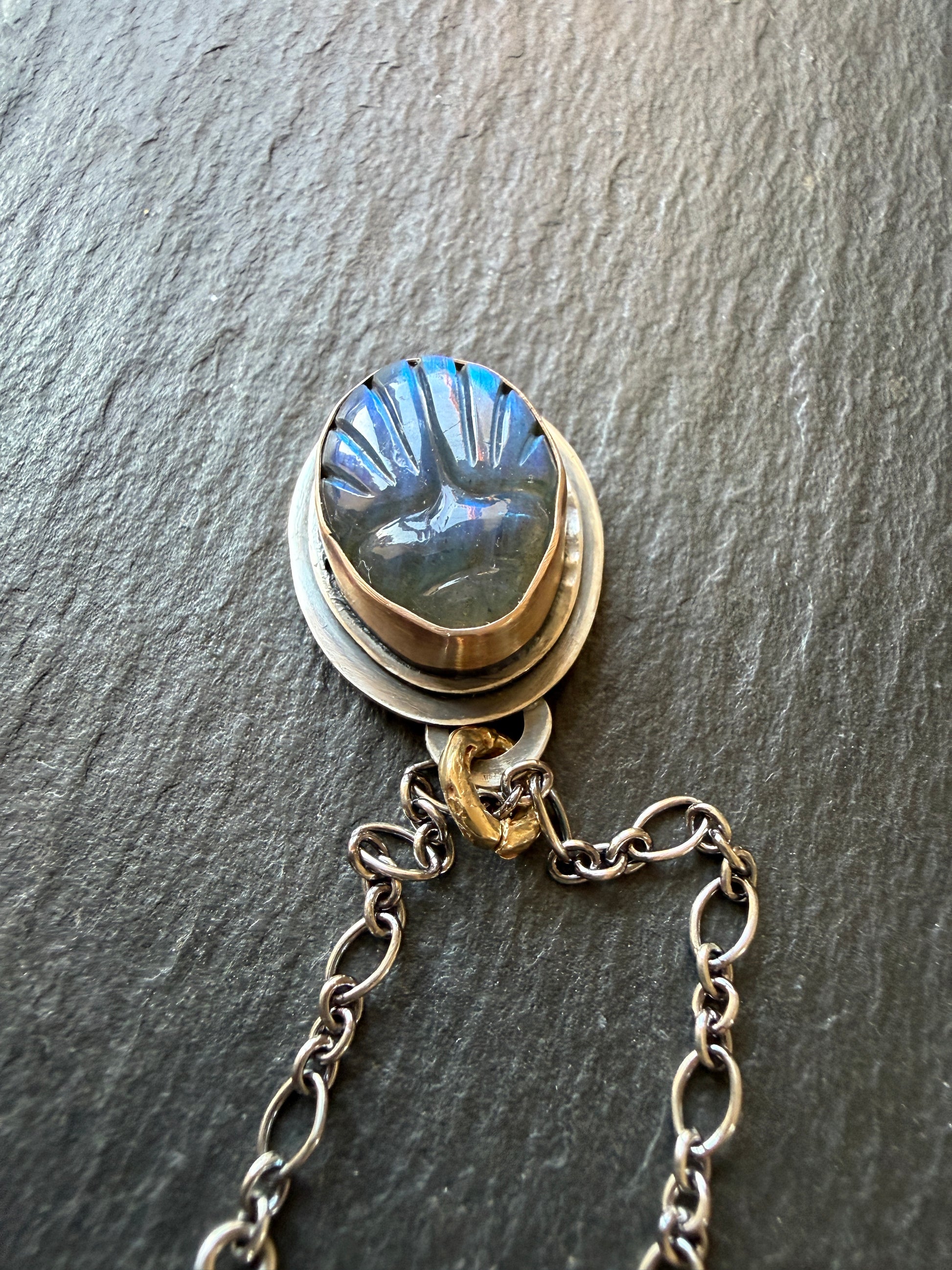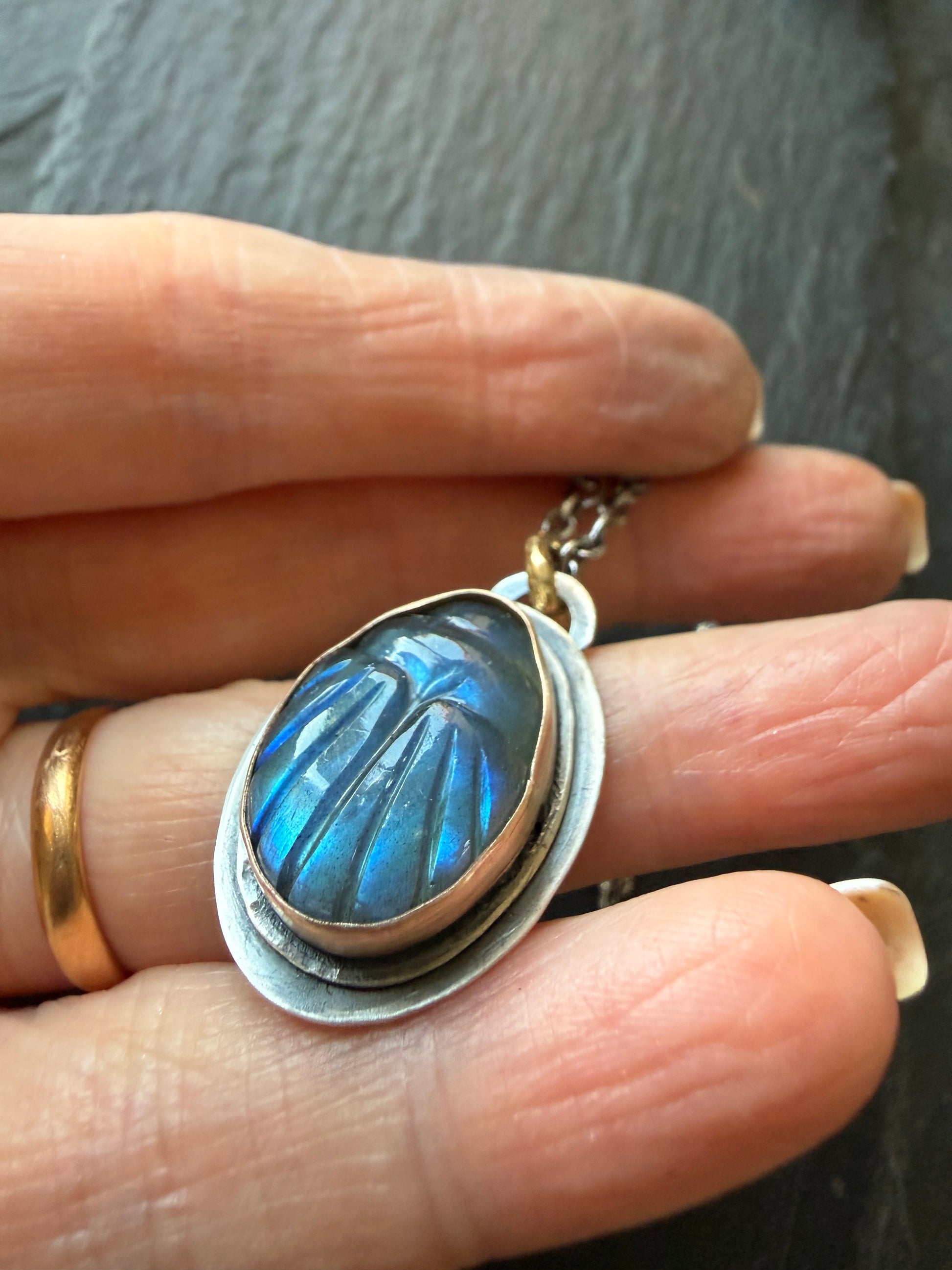 This an adorable flashy Labradorite scarab. This beauty is set in 14k gold fill on sterling silver with a gold bronze link. The chain is a dark oxidised, 18” Sterling silver. The stone measures 18mm x 12mm approximately.