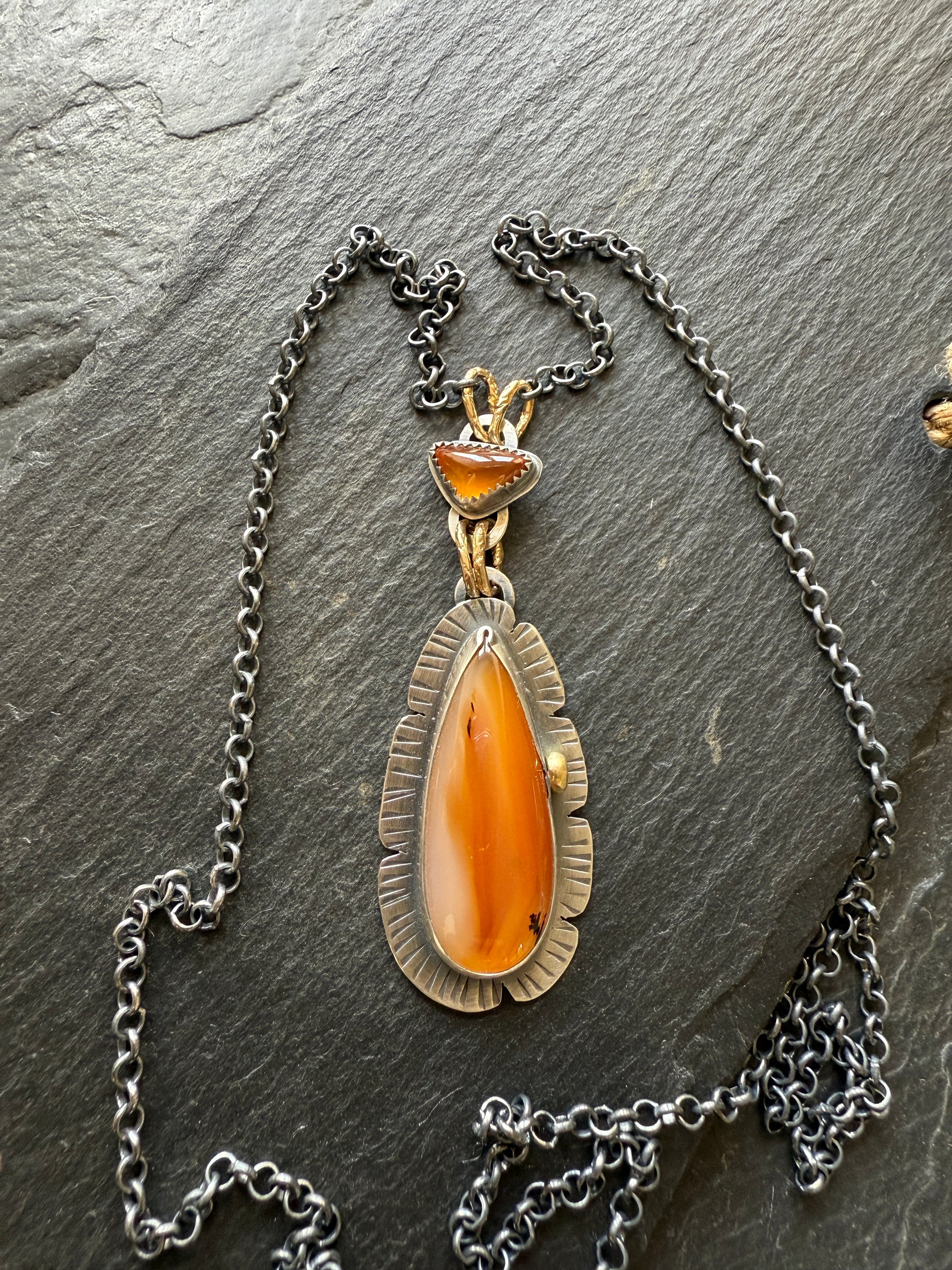 Featuring a beautiful orange hued agate and orange garnet pendant, set in fine and sterling silver and accented with an 18k gold accent. This piece has been oxidised and lightly polished to create an antiqued finish. The pendants hang from gold bronze links. The pendant length is 60mm, excluding the setting, the agate measures 32mm x 14 mm, the garnet is 20x 6mm. All approximate.