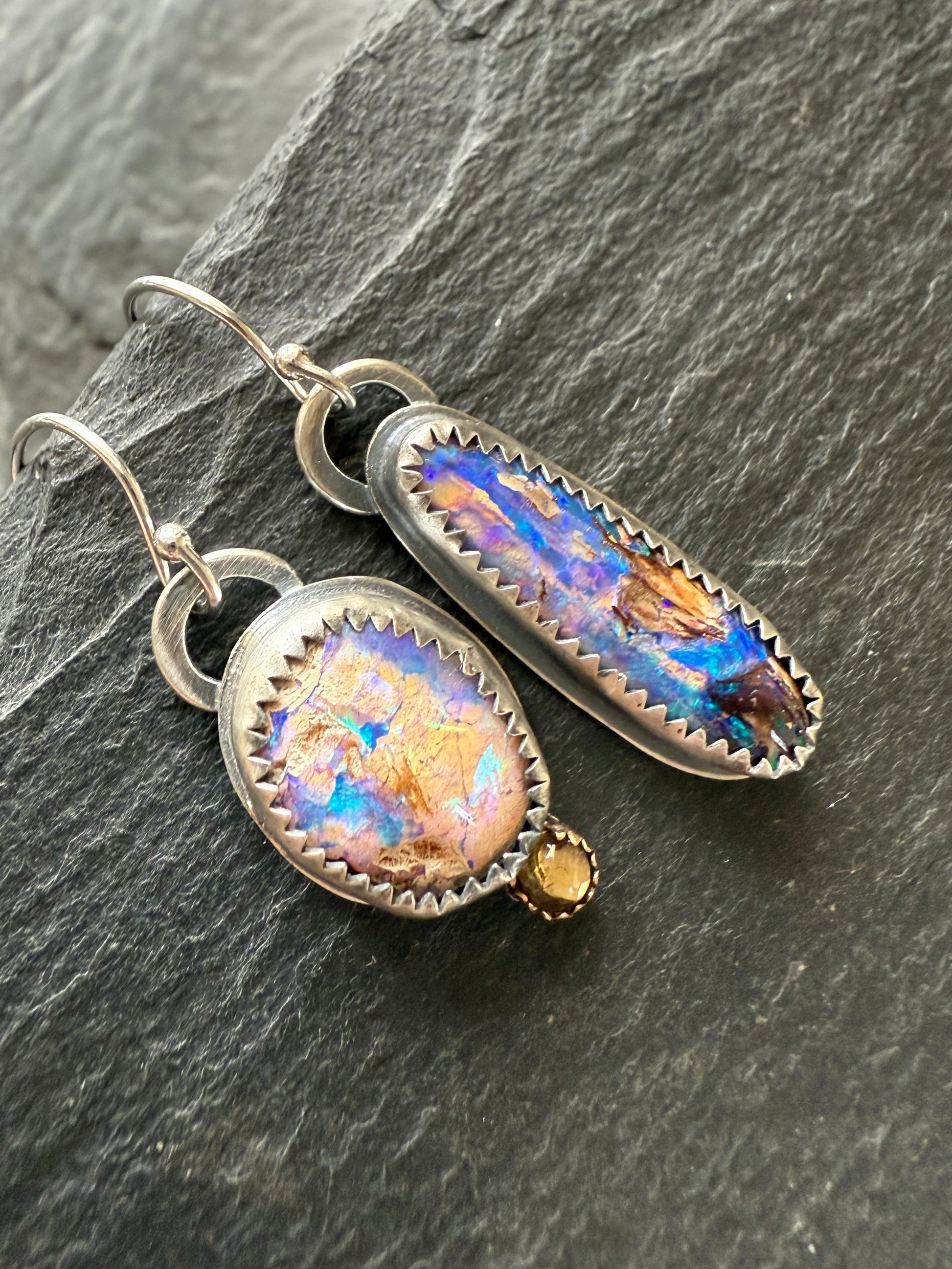 Featuring modern rustic mismatched boulder opal earrings. I have bezel set these beauties in re-cycled sterling silver, then oxidised, hammered and polished to a rustic patina. The smaller stone is accented with a citrine gem encased in 14k gold.