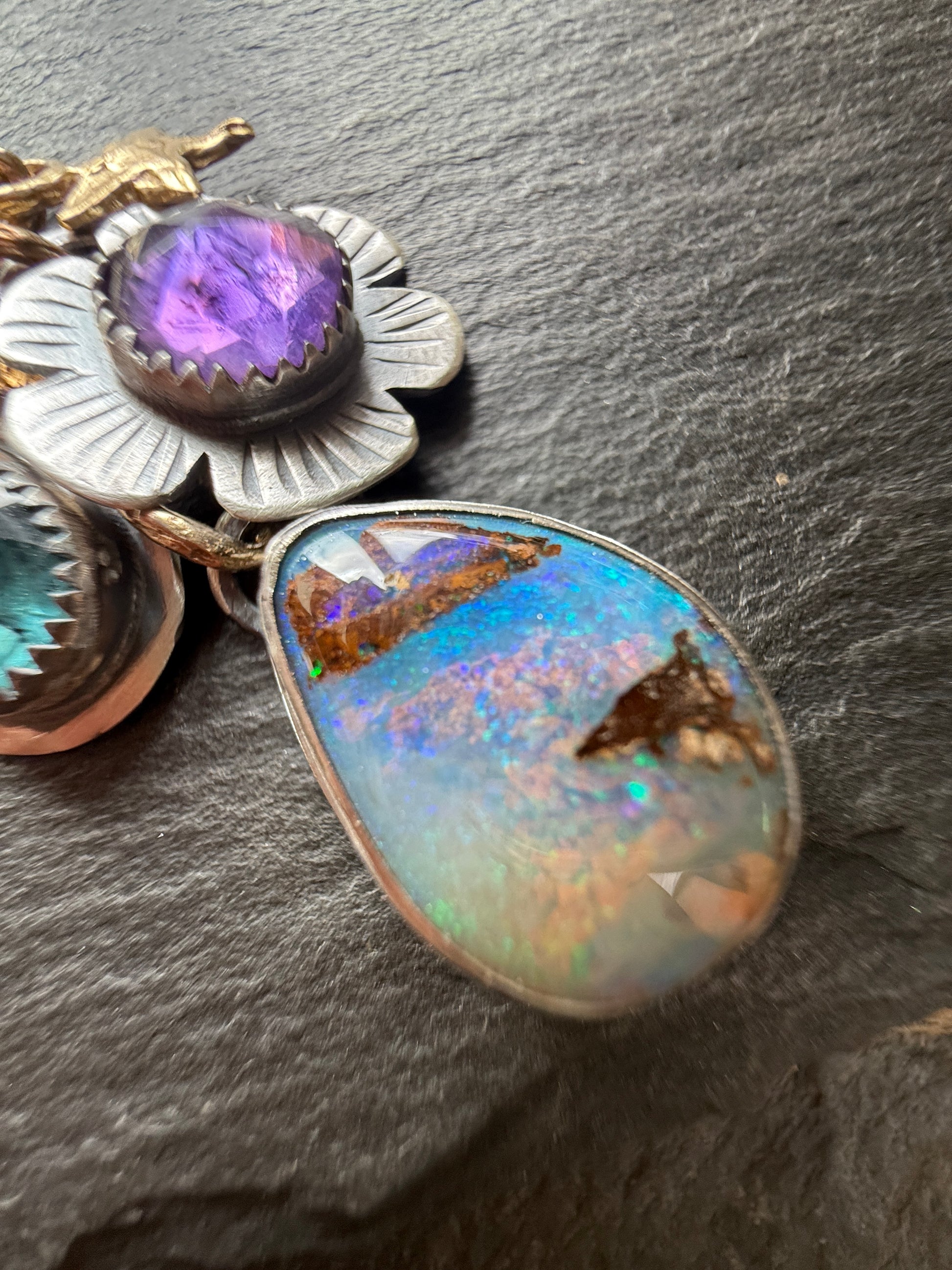 Featuring a charm pendant necklace in which I have bezel set a gorgeous boulder opal, an amethyst and a moss kyanite. These beautiful gems are set in fine and sterling silver. The pendants hangs from gold bronze links and a sterling chain with a gold bronze star charm. The opal measures 15mm x 11mm. The Sterling chain is 20”.