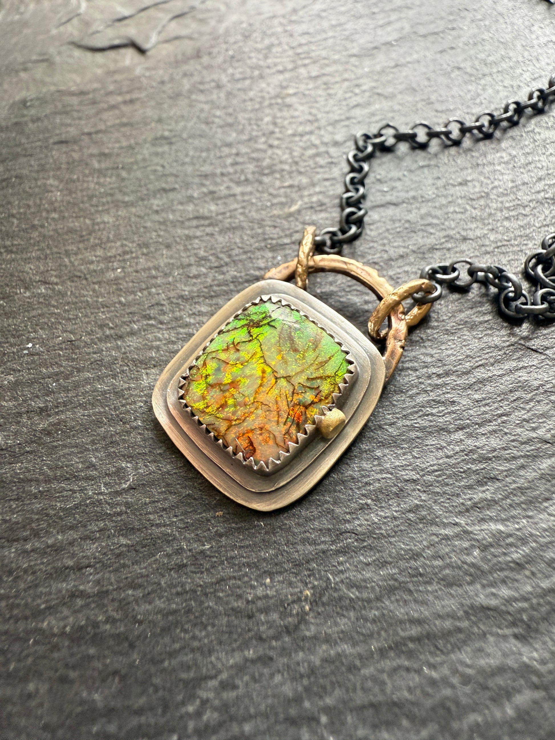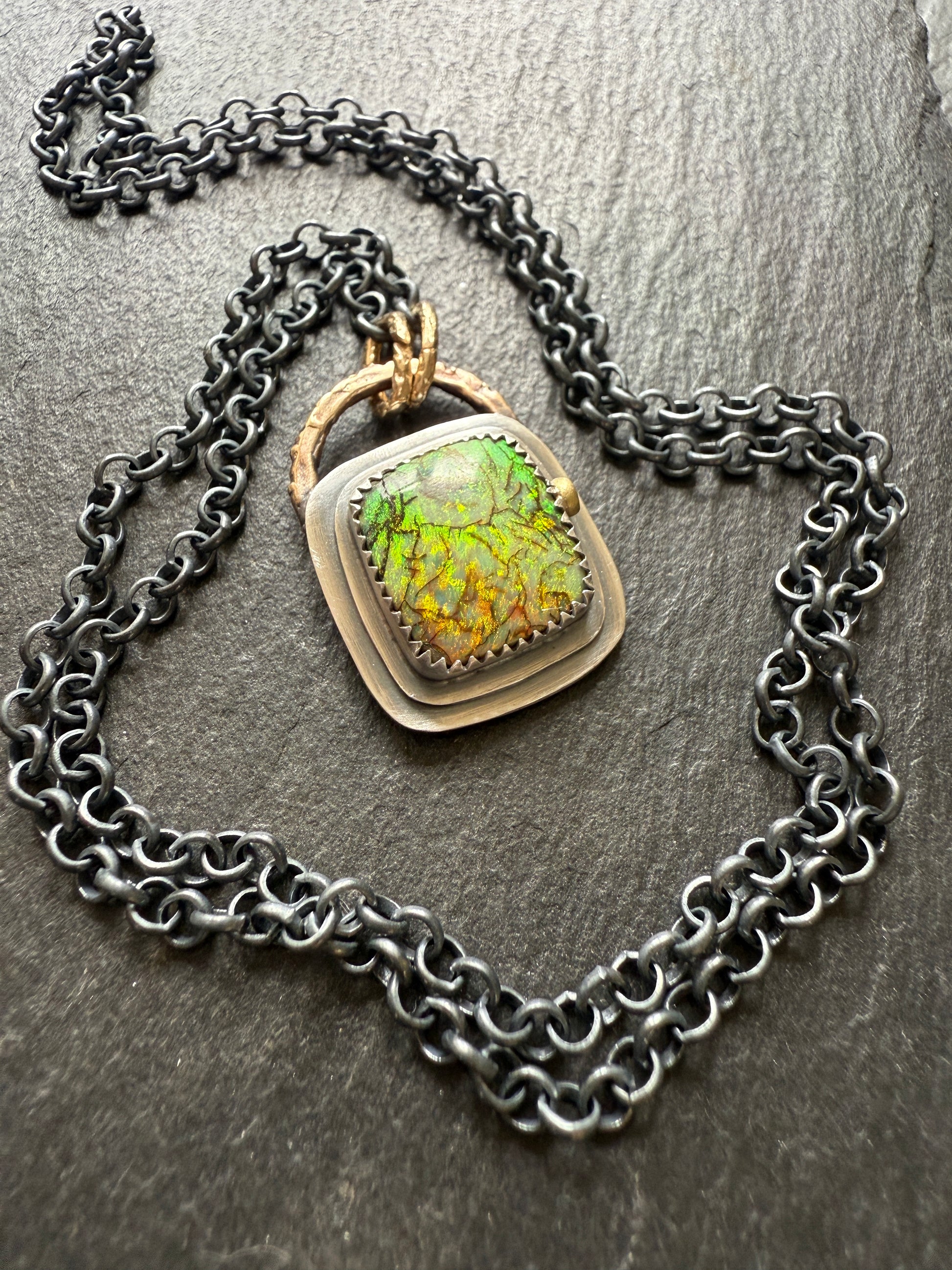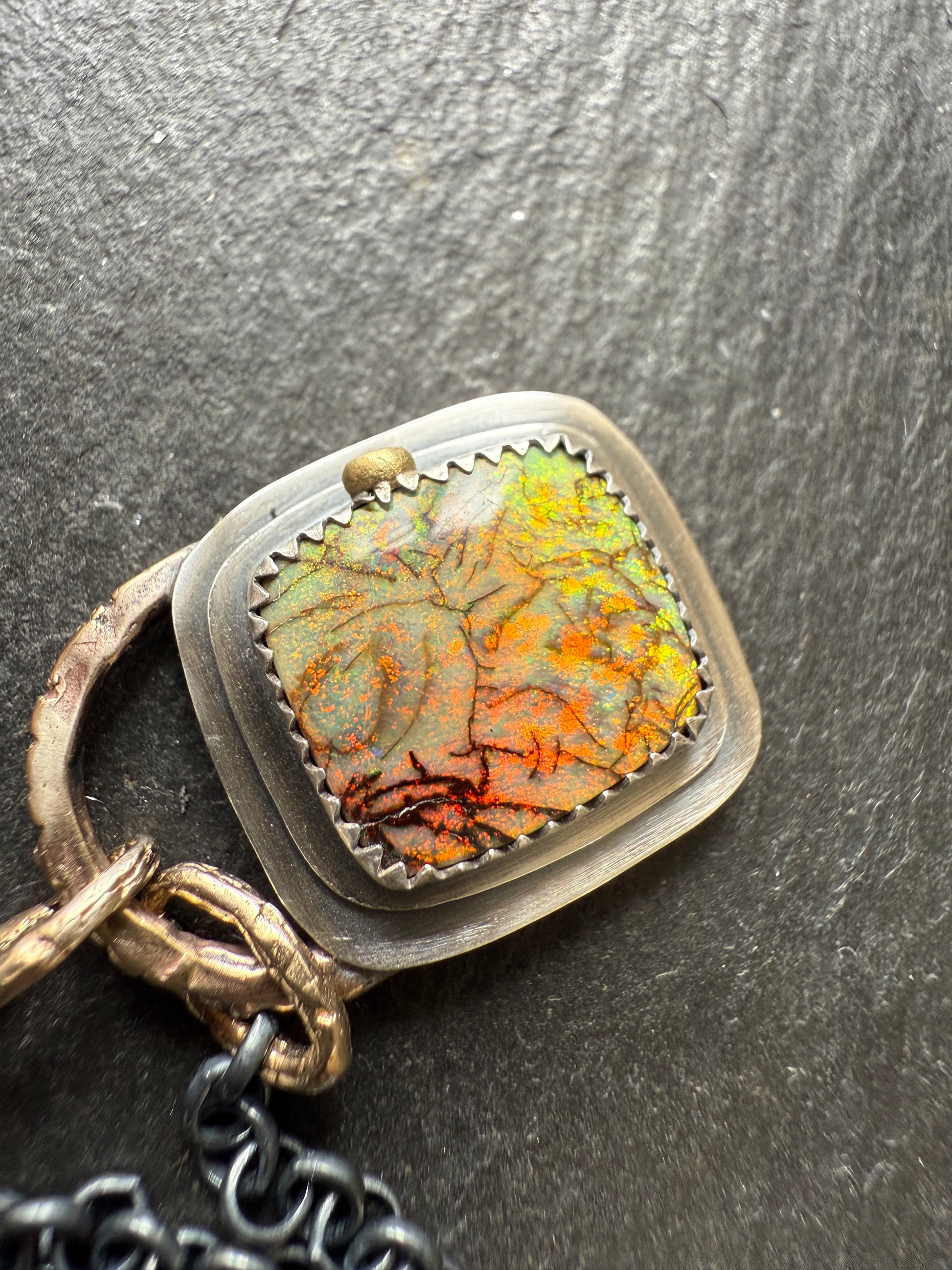 Featuring a colourful Monarch opal set in fine silver and layered setting of sterling silver. The pendant hangs from gold bronze links and a dark sterling silver chain. The chain is 18” approximately.