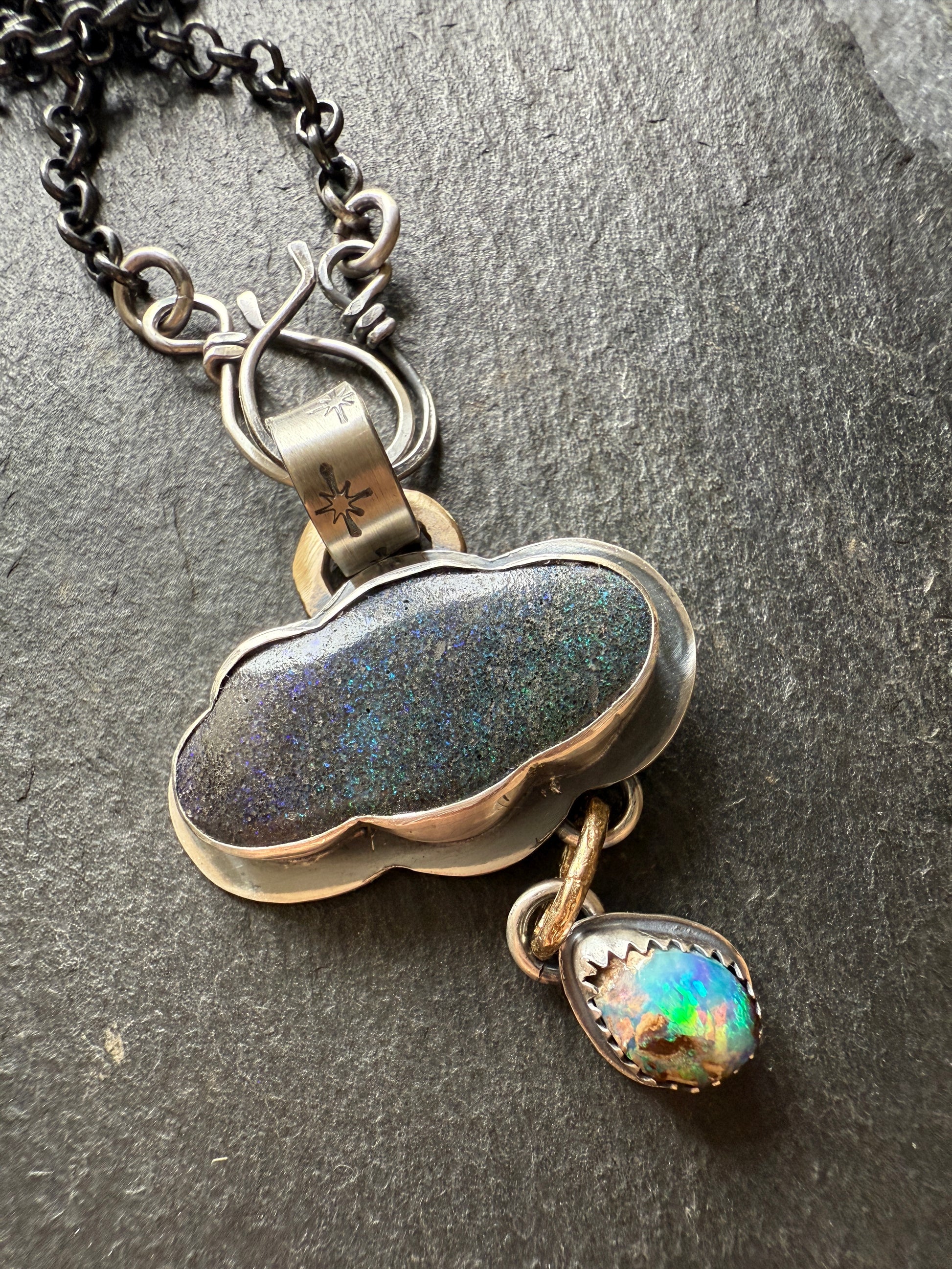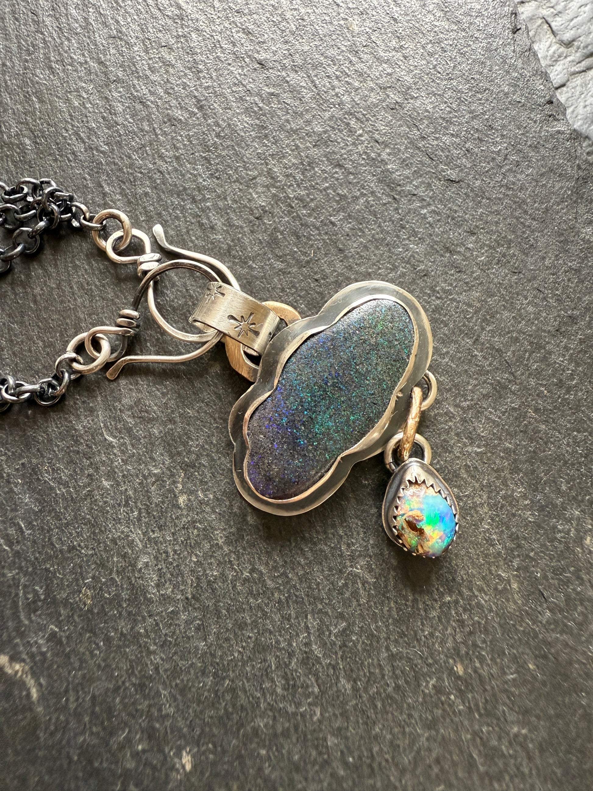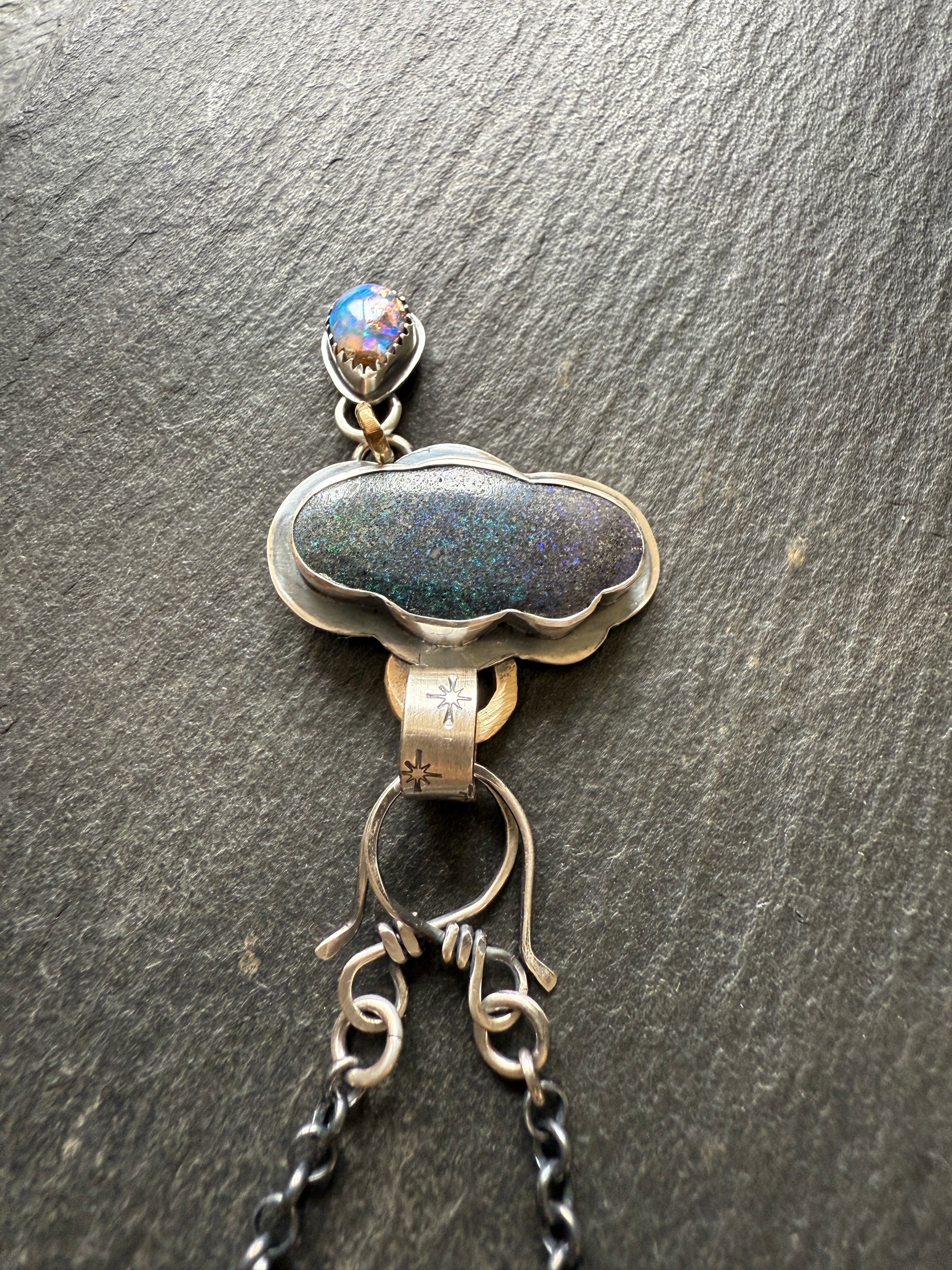 Featuring a gorgeous moody opal shaped into a cloud with green, blue and purple speckles and a dainty fiery opal droplet. This opals are set in fine and sterling silver The pendants hang from a hand forged bail stamped with stars, gold bronze links and sterling hand forged hooks along with a dark 18” oxidised sterling chain. A sterling star charm hangs from a hook.