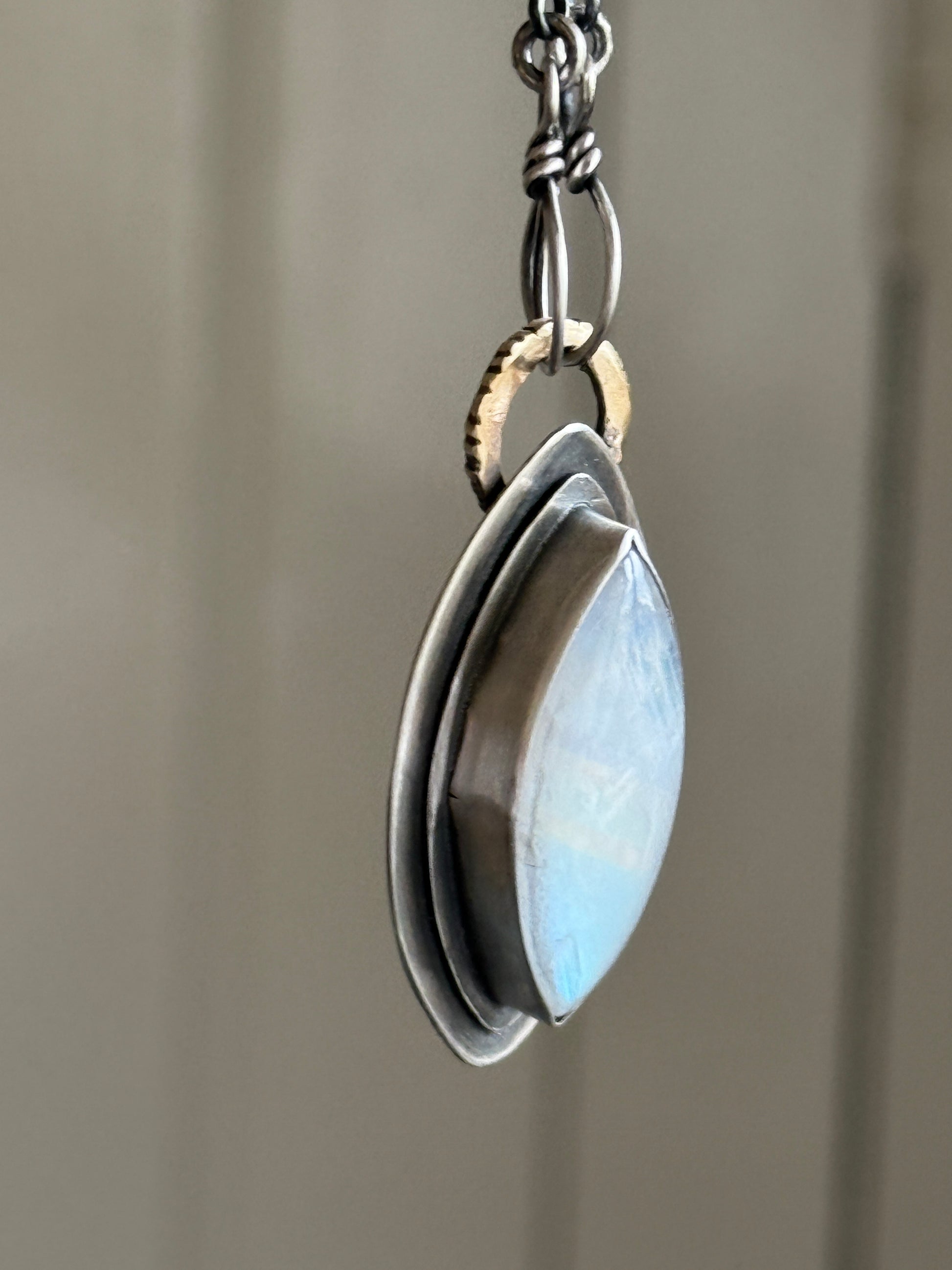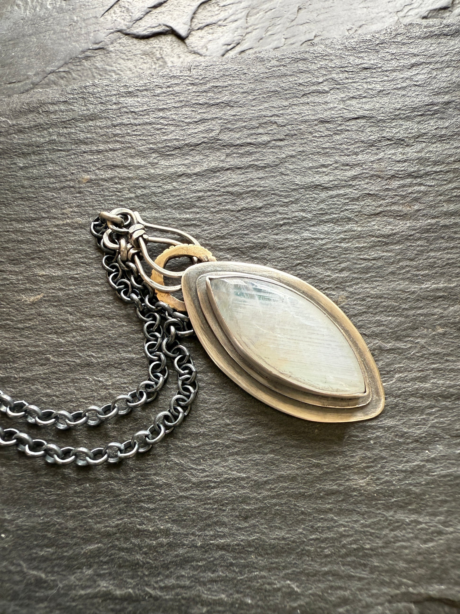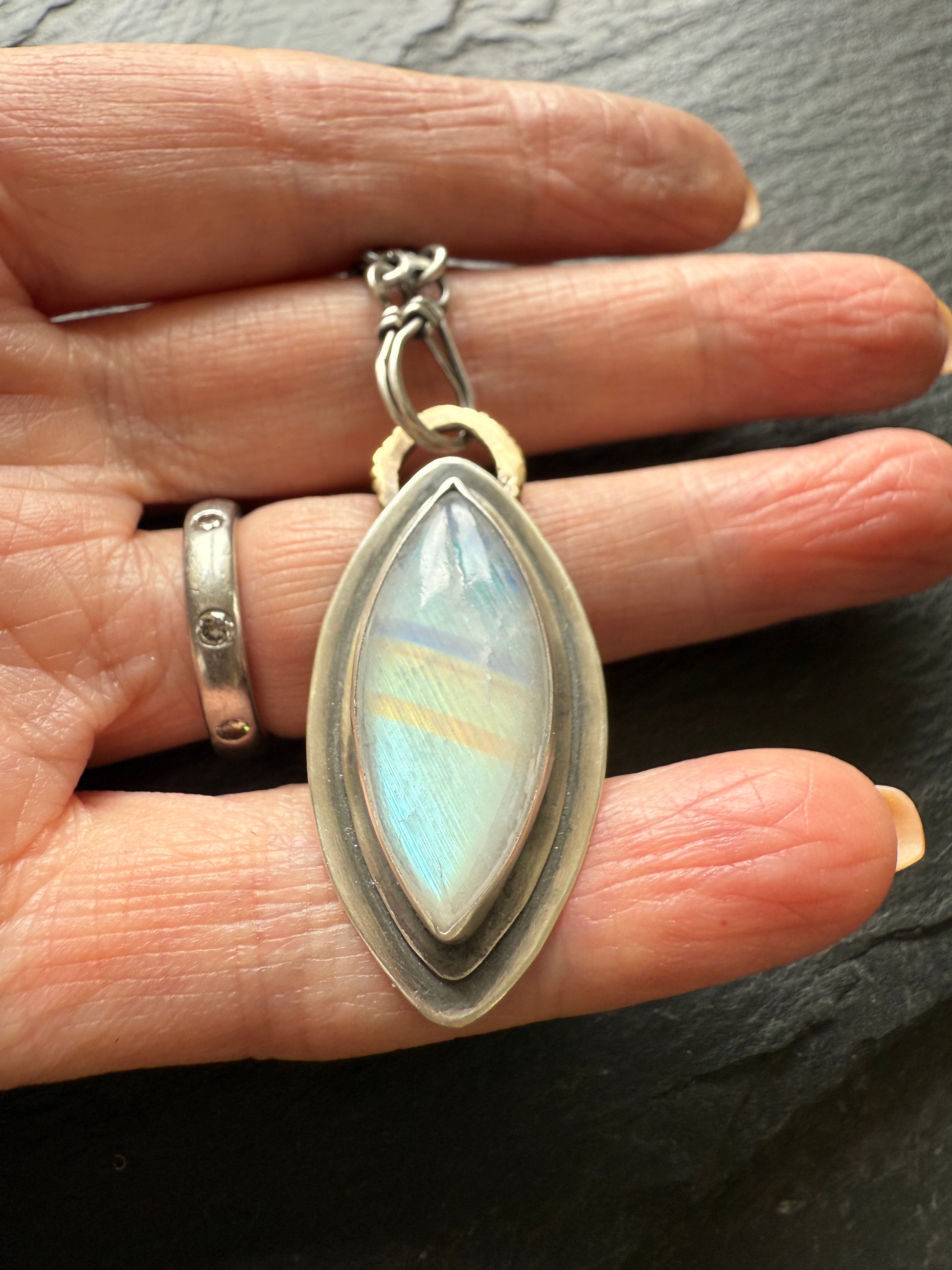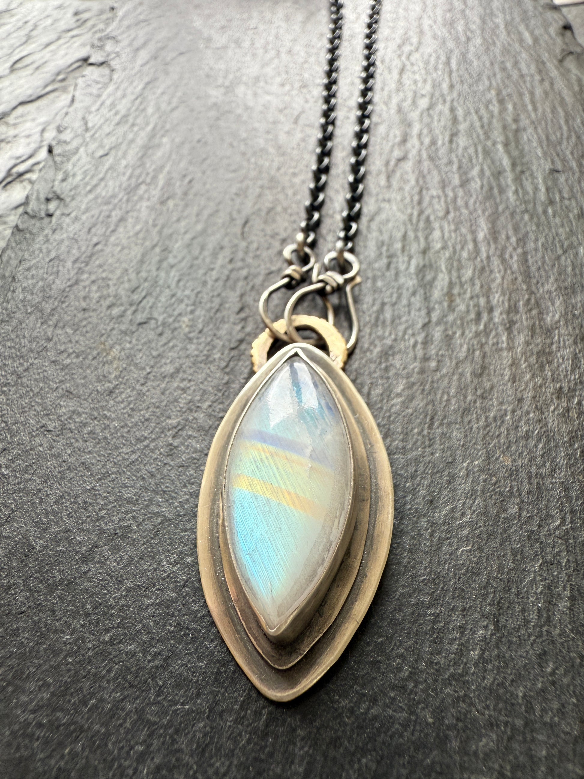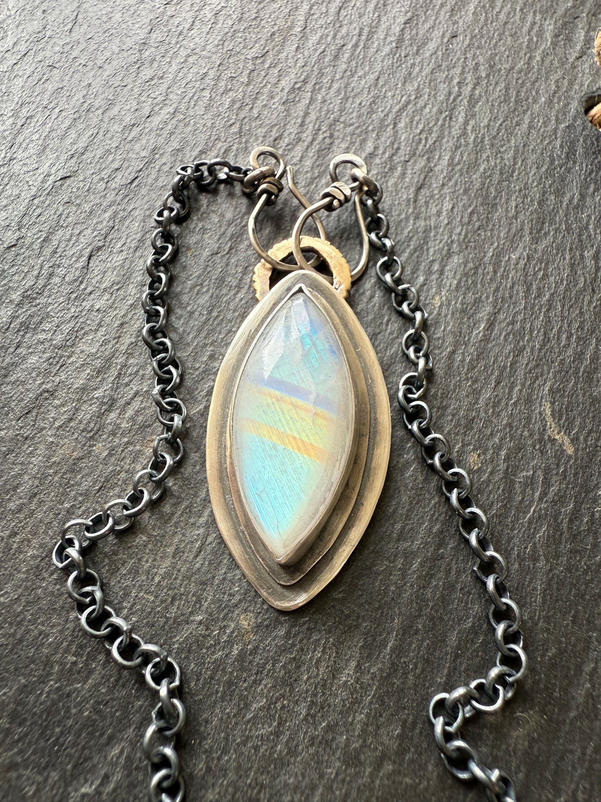Featuring a colourful moonstone set in fine and sterling silver with a gold bronze link. This beauty hangs from an 18” oxidised sterling silver chain. The stone measures 26mm x 12mm, the pendant is 37mm x 20mm approximately.