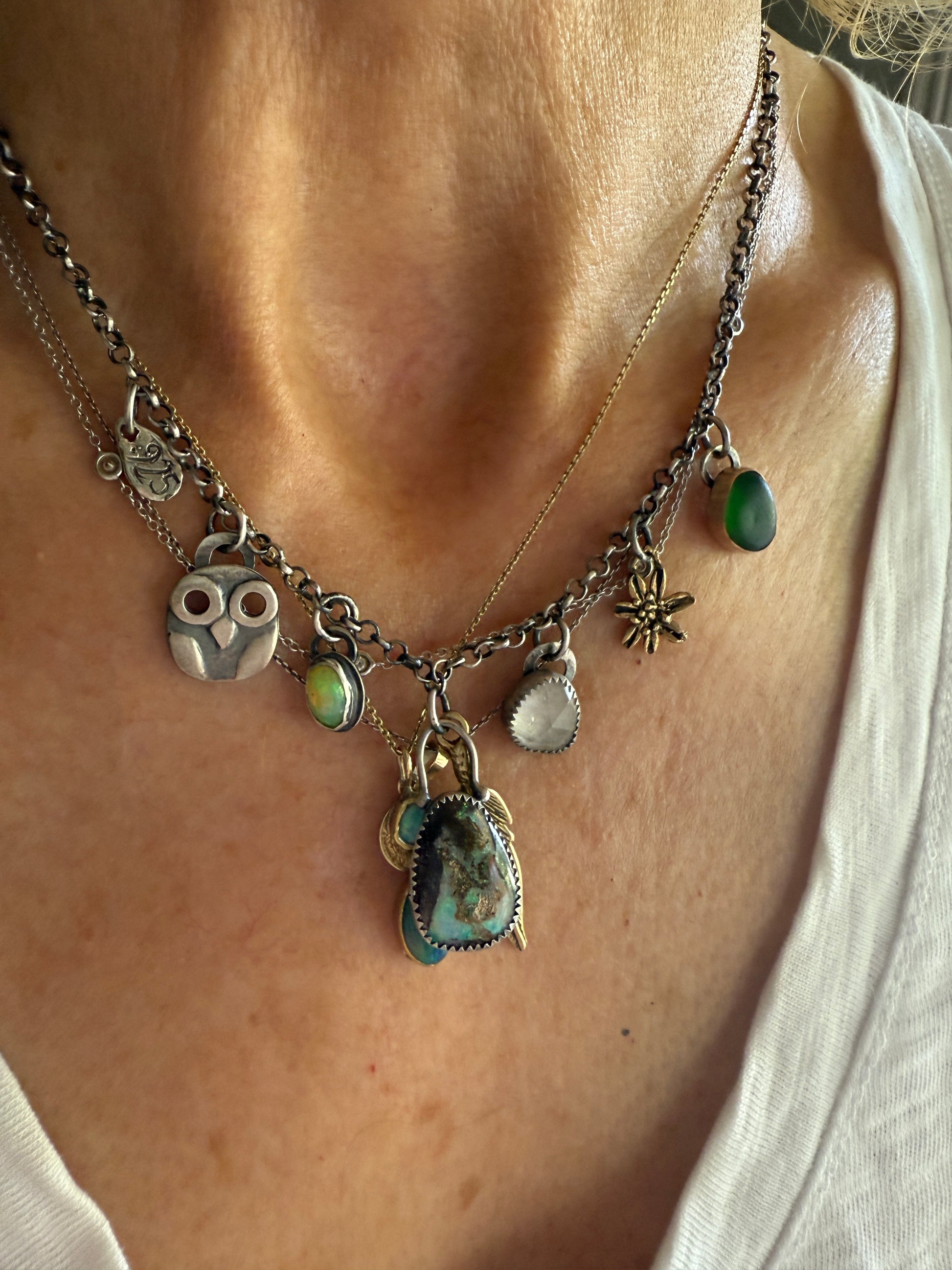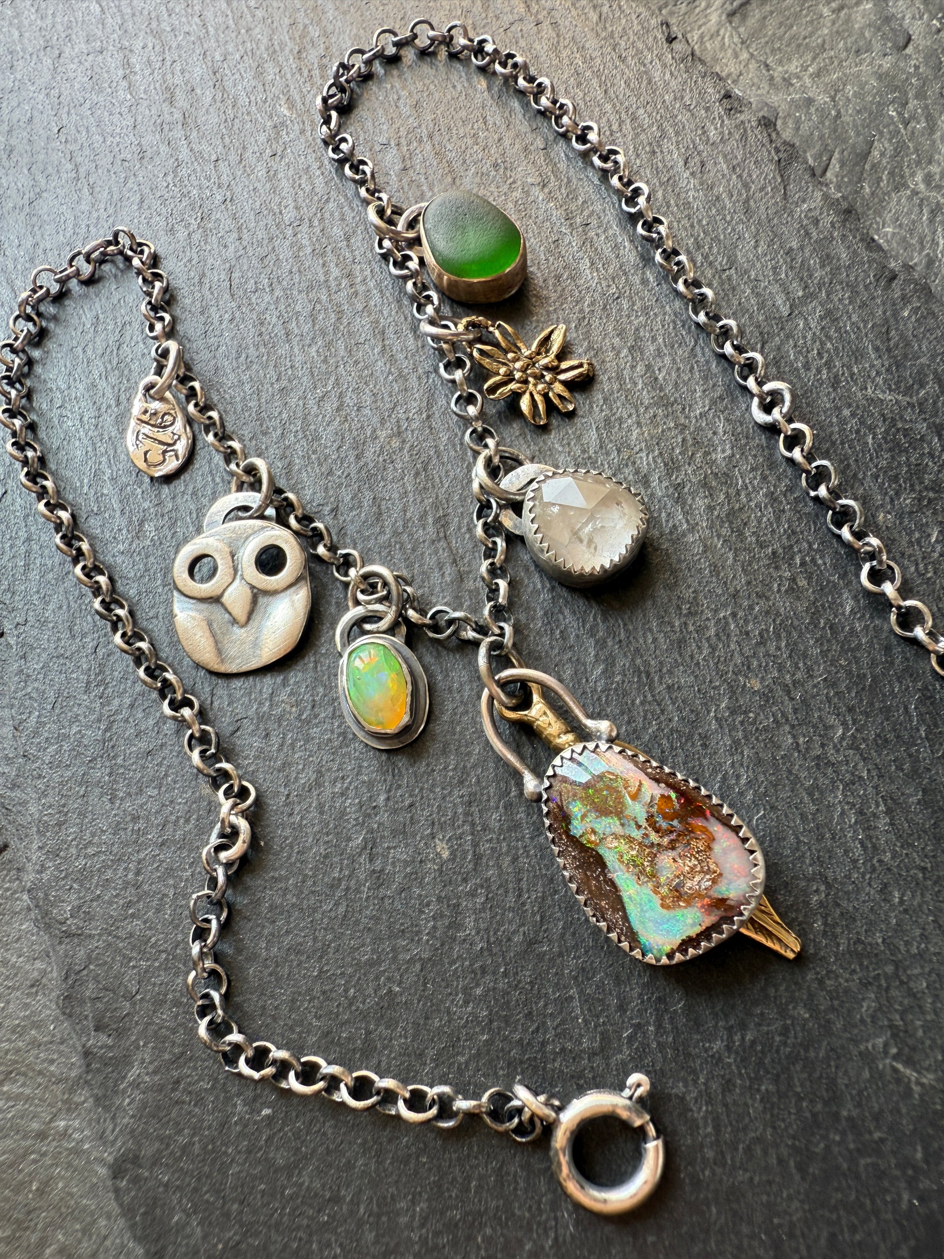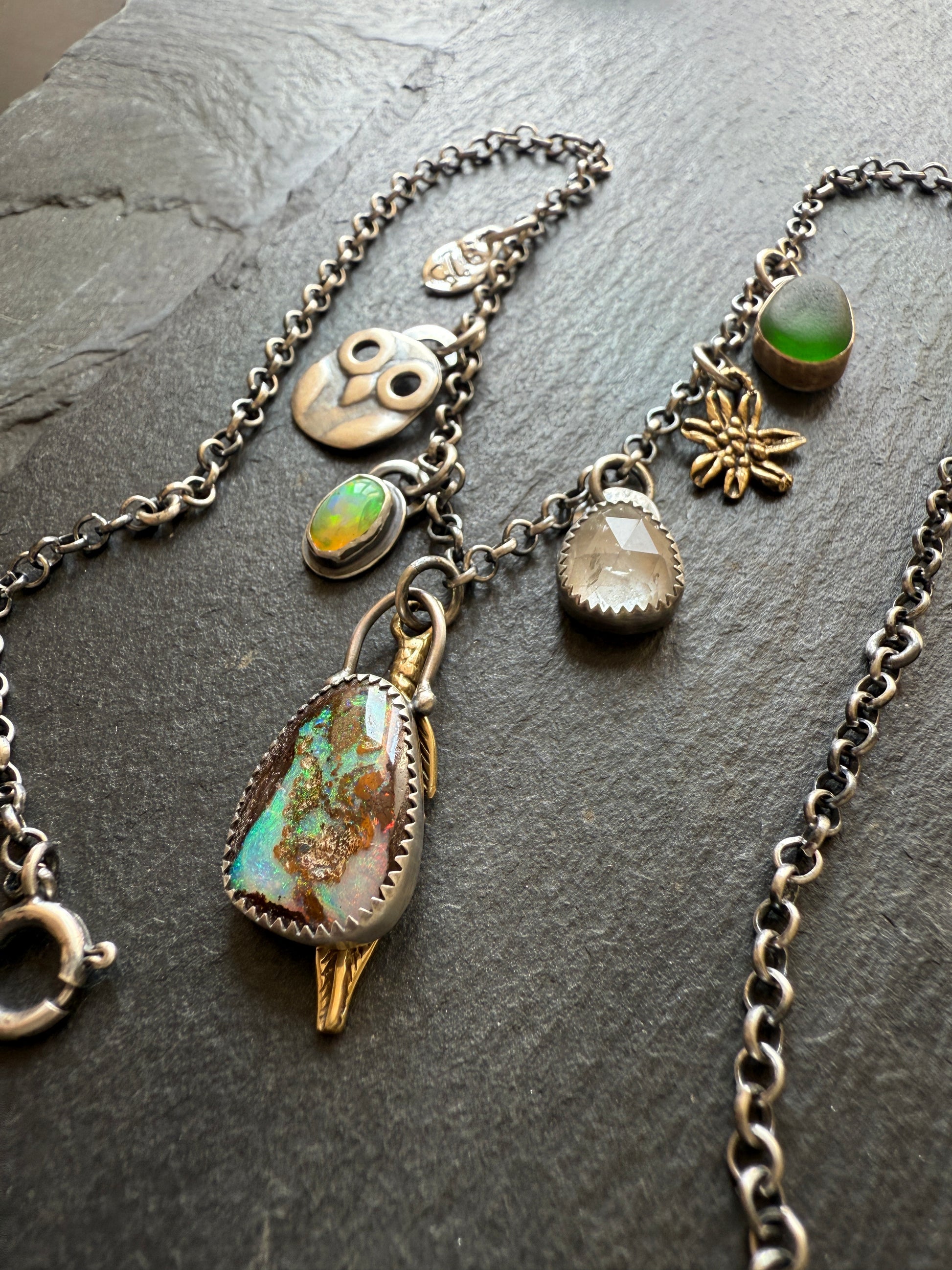 Featuring a multi charm necklace consisting of a boulder opal, green sea glass, tourmaline, Ethiopian opal, gold bronze charms and silver charms. The necklace is mixed metal, 14k gold fill and sterling silver. The chain length is 16”