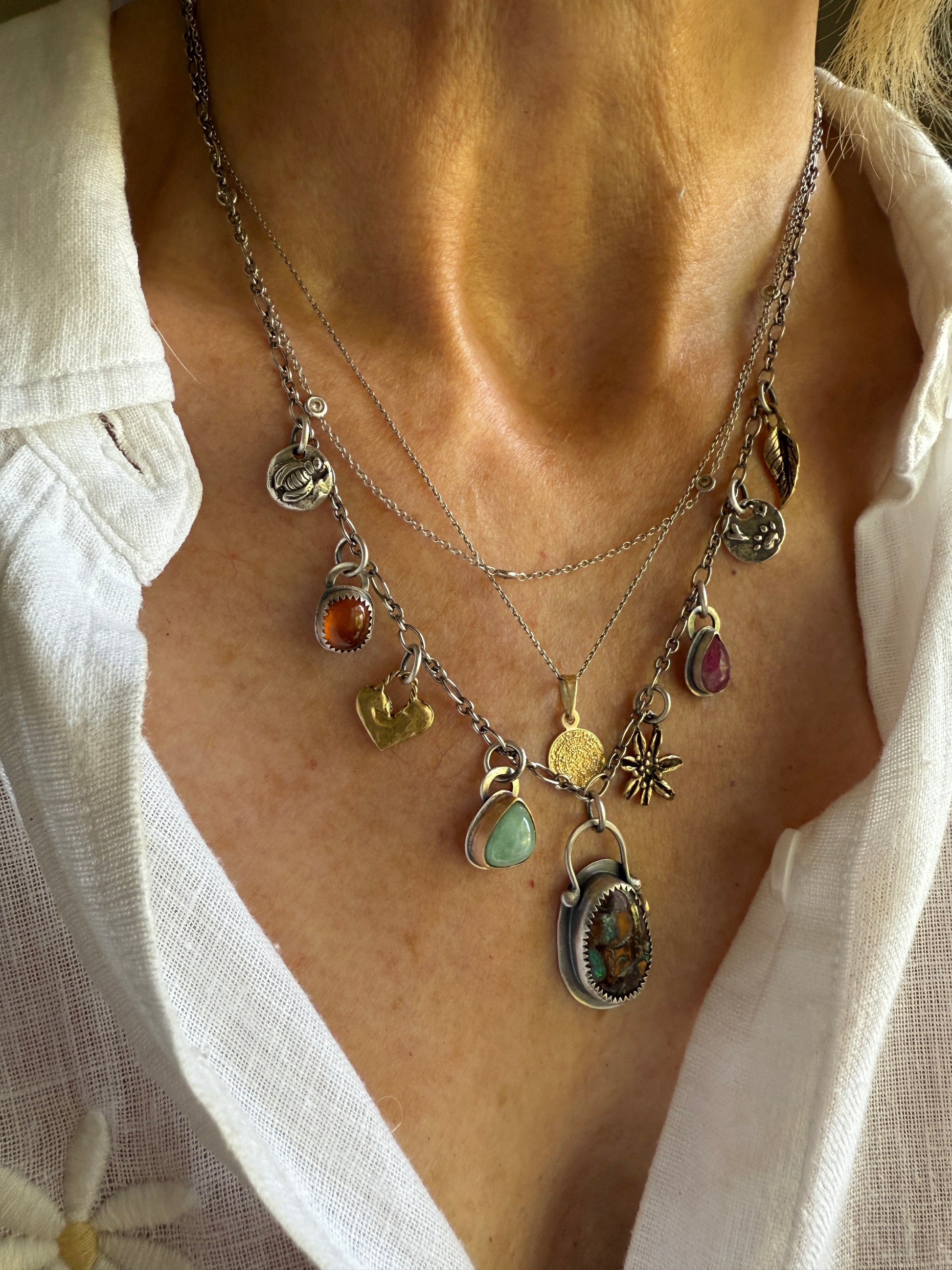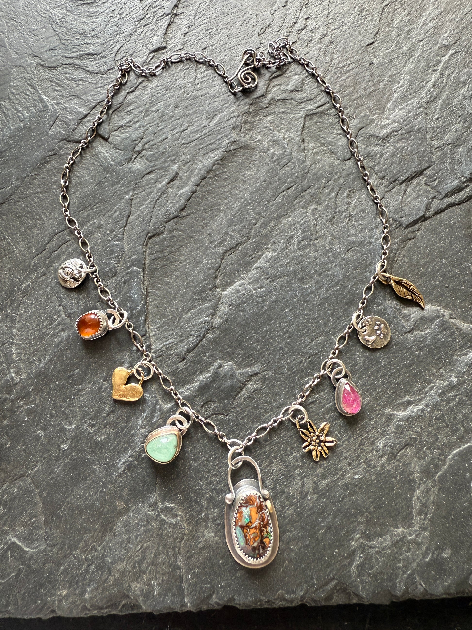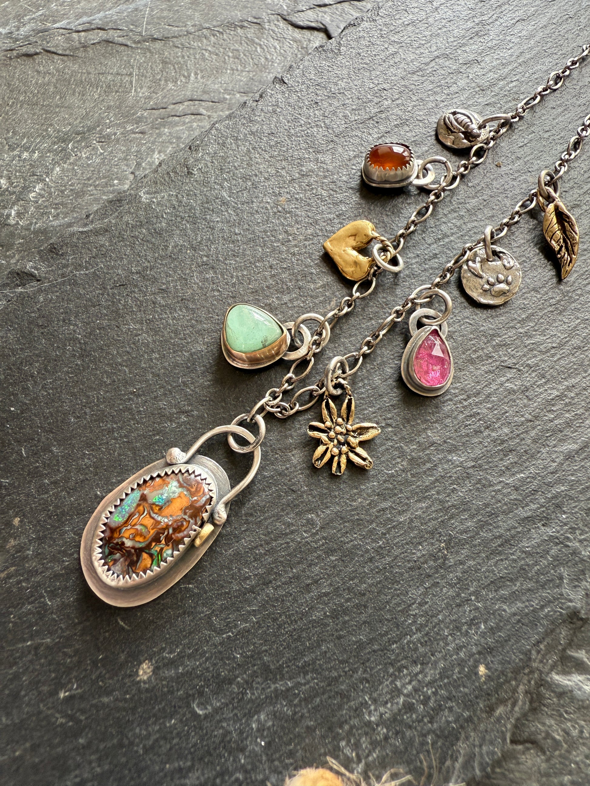 Featuring a multi charm necklace, of a Boulder Opal, green Tourmaline, pink Tourmaline, Hessonite Garnet with gold bronze and sterling silver charms. The gemstones have been set in fine and sterling silver, the green tourmaline is set in 14k gold fill. The chain length is 18”.