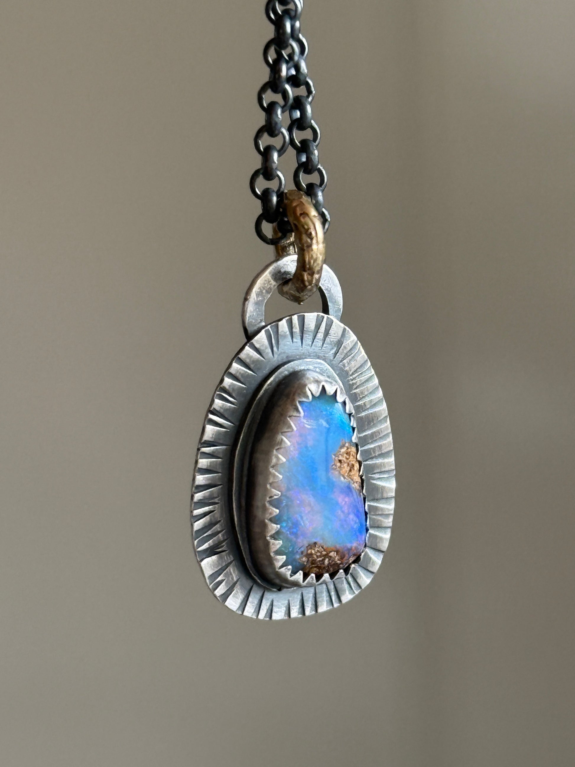 Featuring a lovely blue and pink boulder opal. This beauty is layer set in Oxidised sterling silver, it hangs from a gold bronze link and an 16” dark oxidised sterling silver chain. This beauty is perfect for layering.