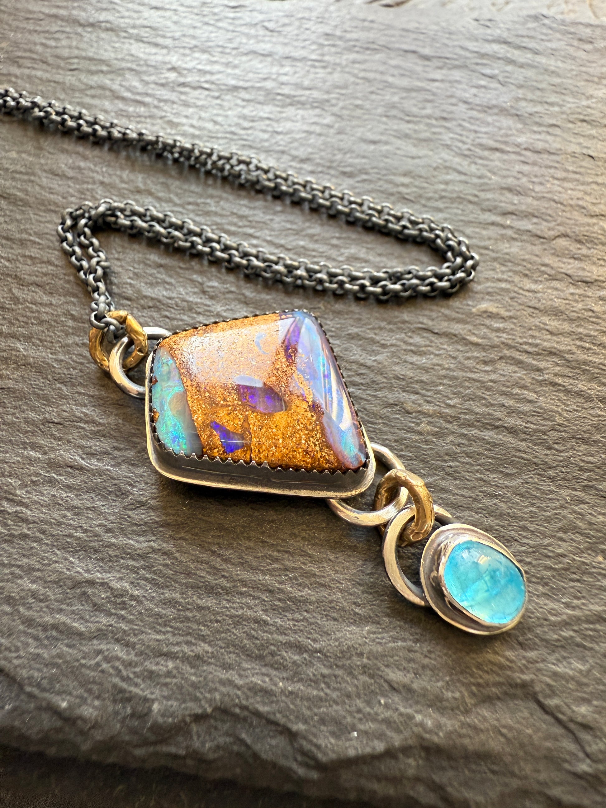 Featuring a stunning blue, green and purple boulder opal bezel set in sterling silver. A dainty apatite dangles from the Opal. The pendants hang from gold bronze links and a dark oxidised sterling 18” chain.