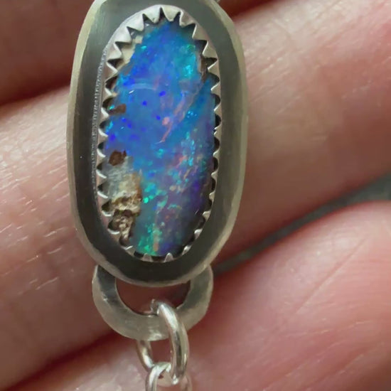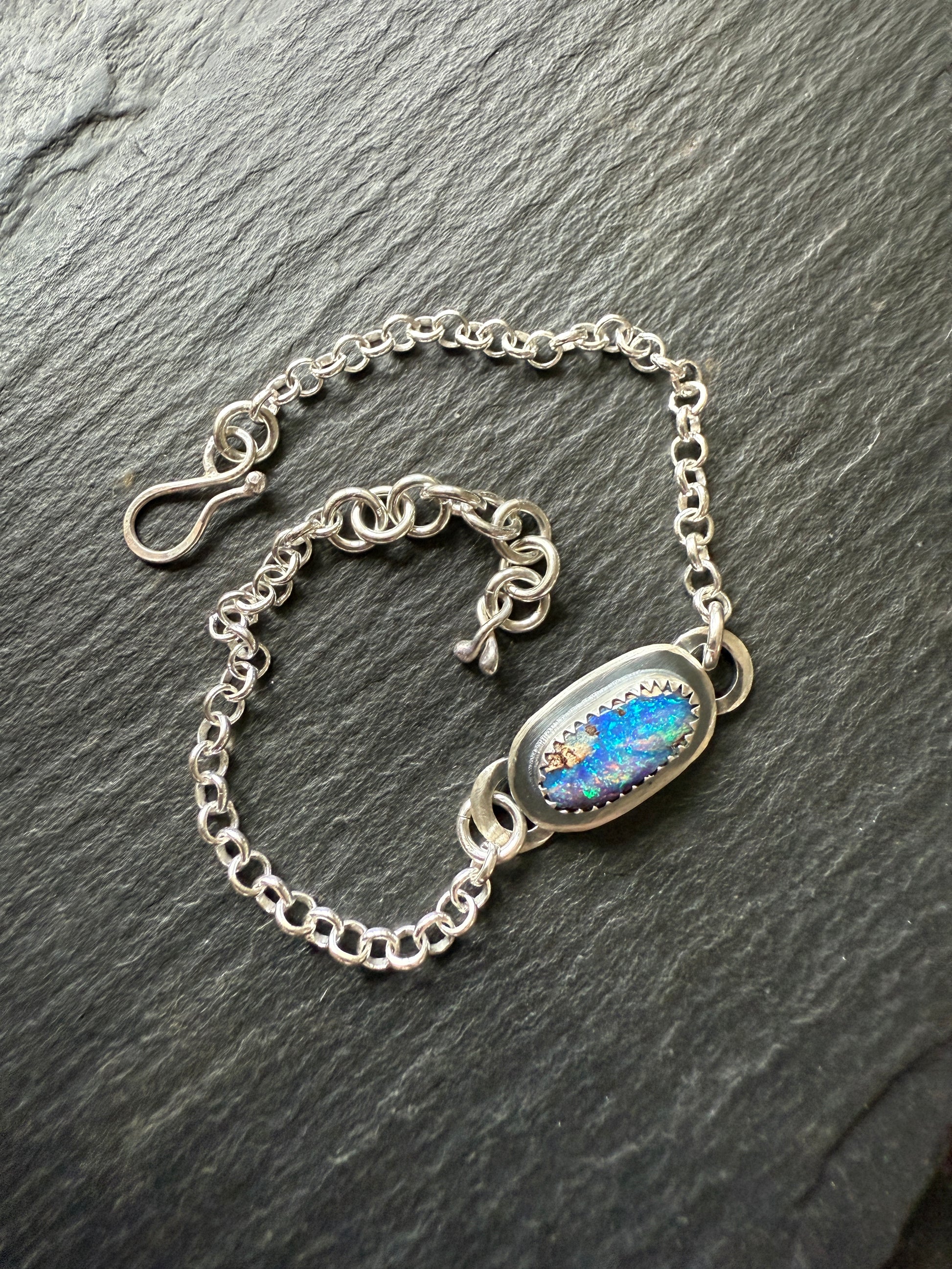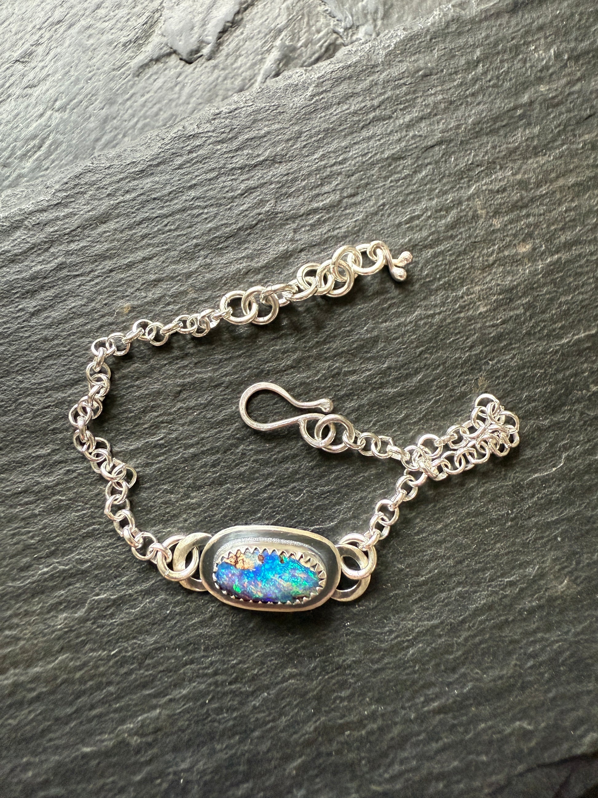 Featuring a beautiful opal set in fine and sterling silver. This bracelet will fit a 6-6.5” wrist. It can be oxidised if you wish. Wear alone or stacked with other bracelets. The pendant measures 22mm x 10mm. The bracelet closes with a hook closure.