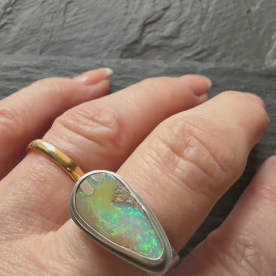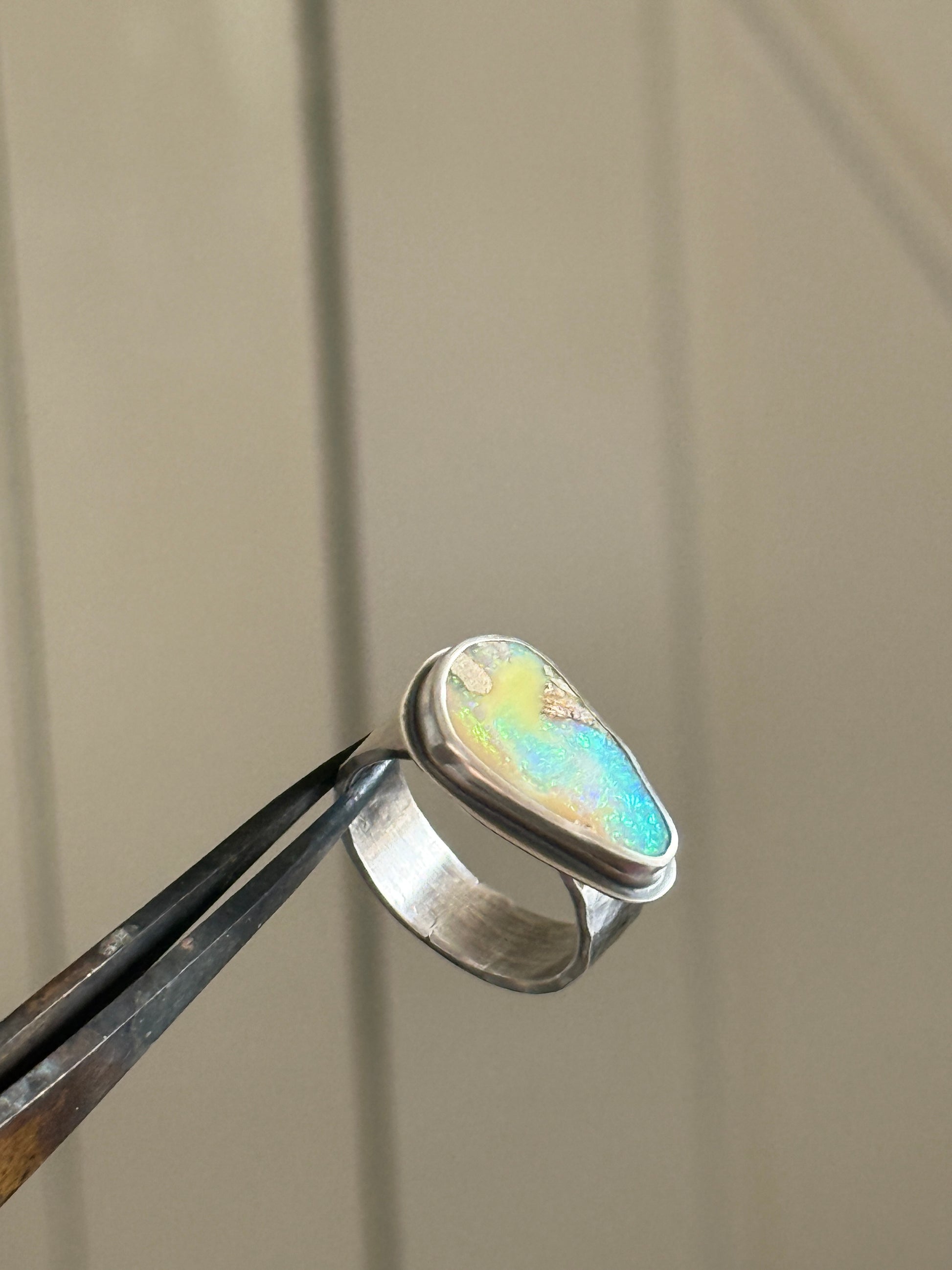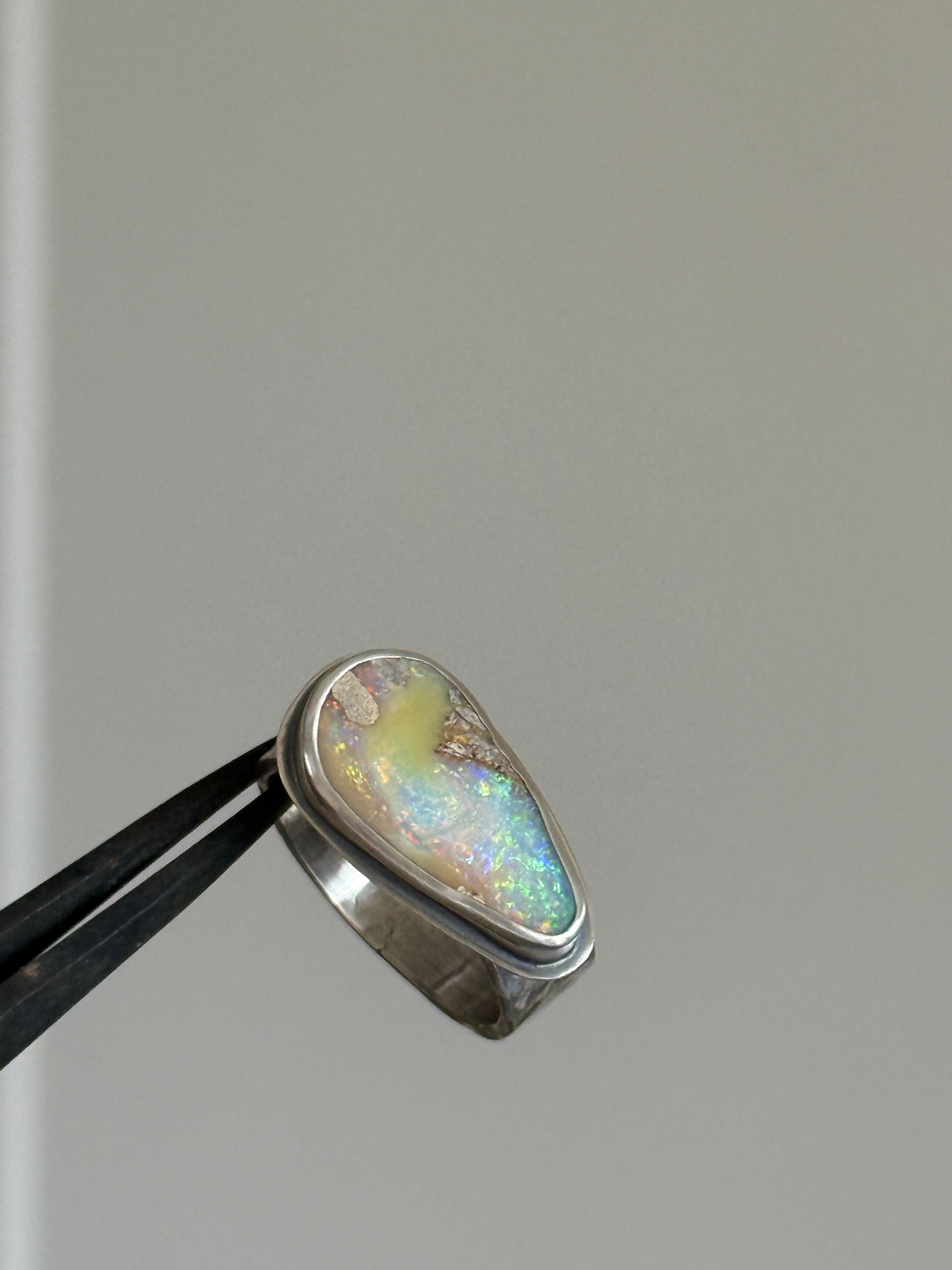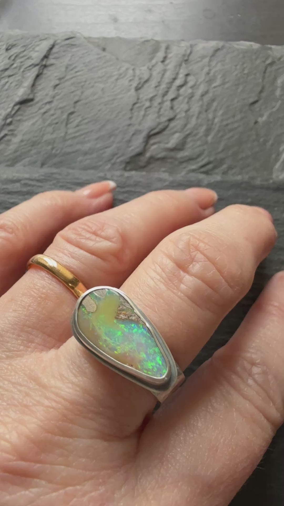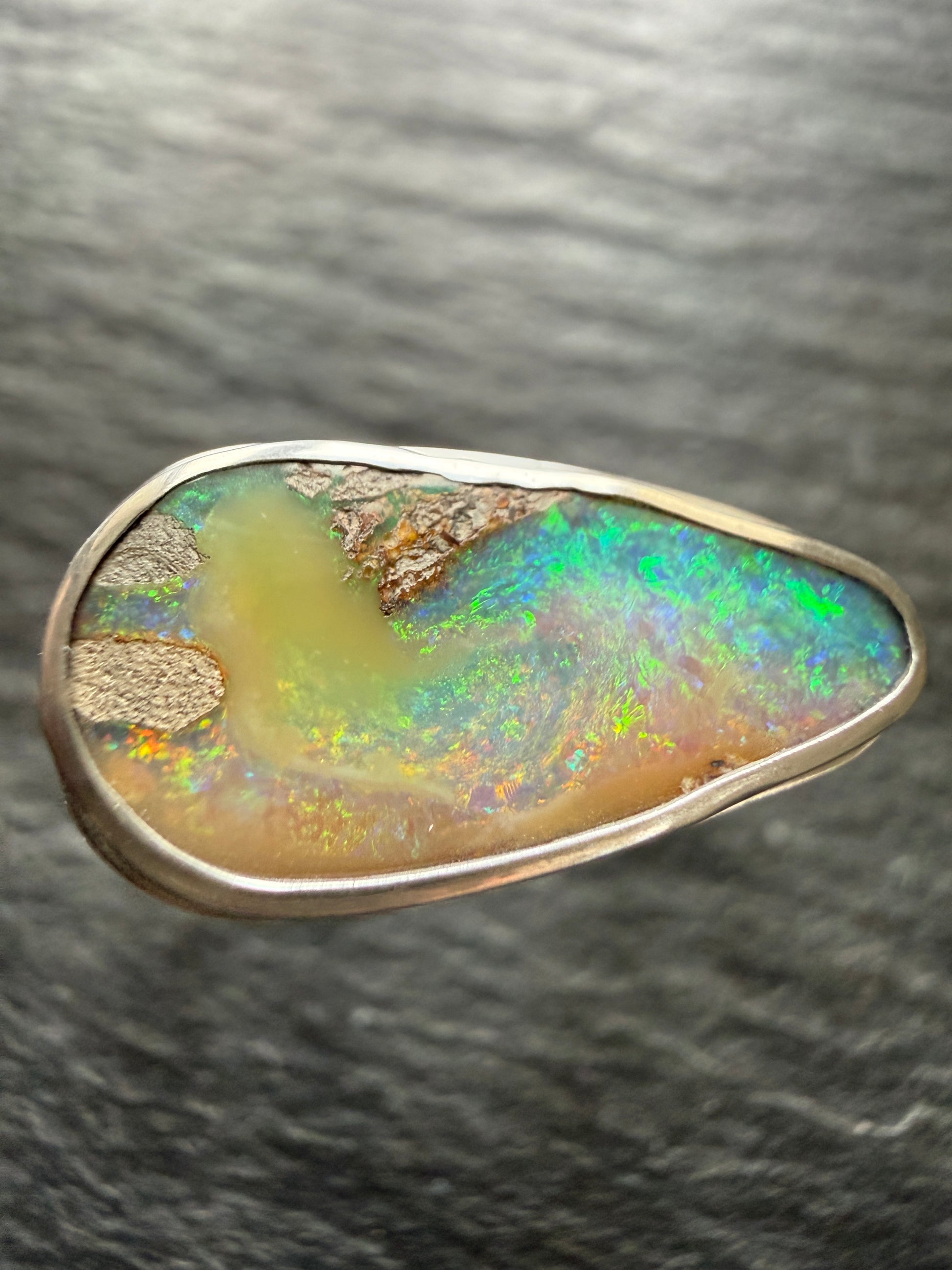 Featuring a striking boulder opal set in fine and sterling silver atop a texturised sterling band. This stone has beautiful colour play amongst its natural formation, ironstone, which gives it its unique character.