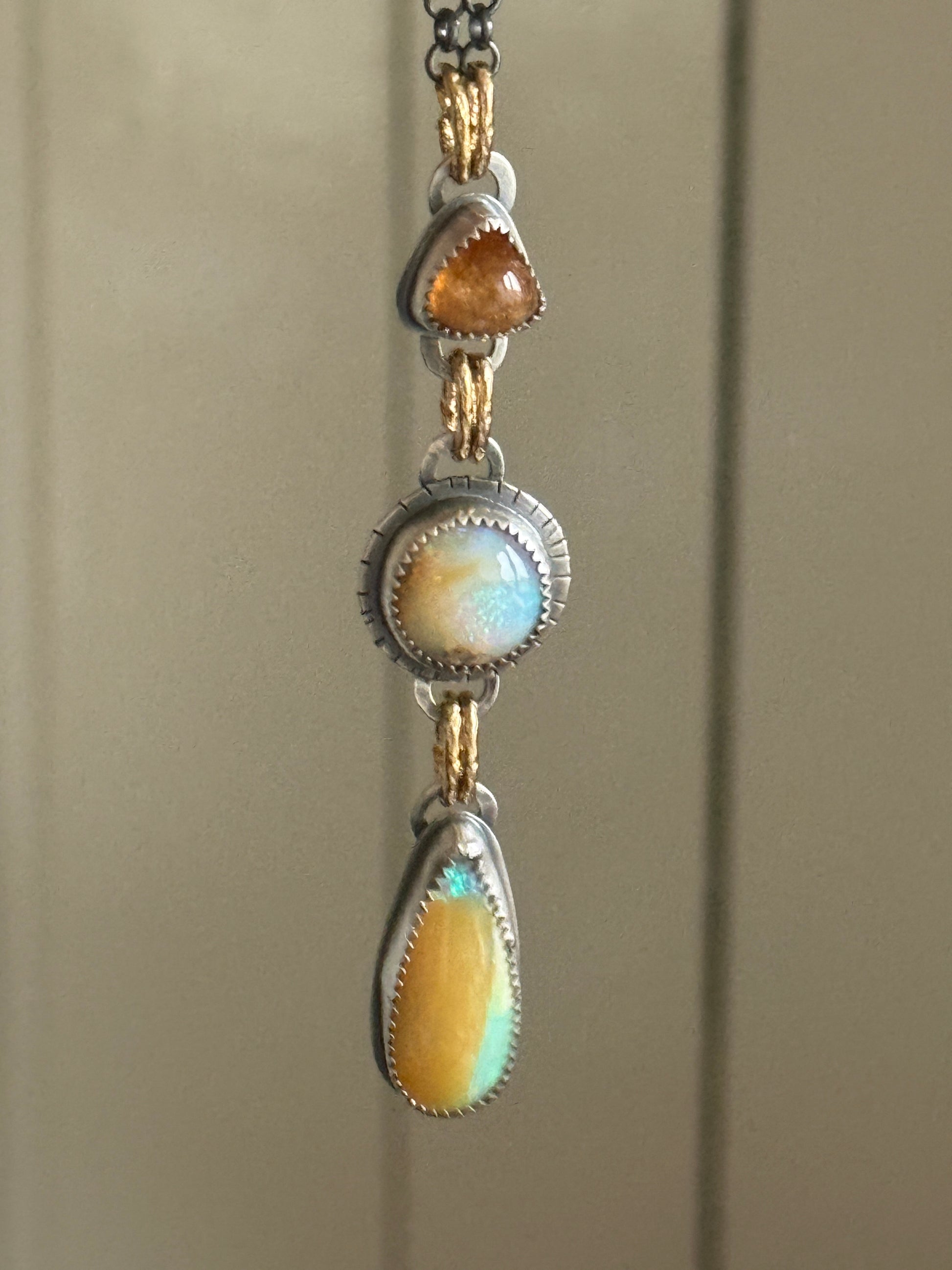 Featuring two beautiful boulder opals and an orange garnet gemstones set in fine and sterling silver, oxidised and lightly polished. The charms hang from gold bronze links and a dark oxidised sterling silver 18” chain.