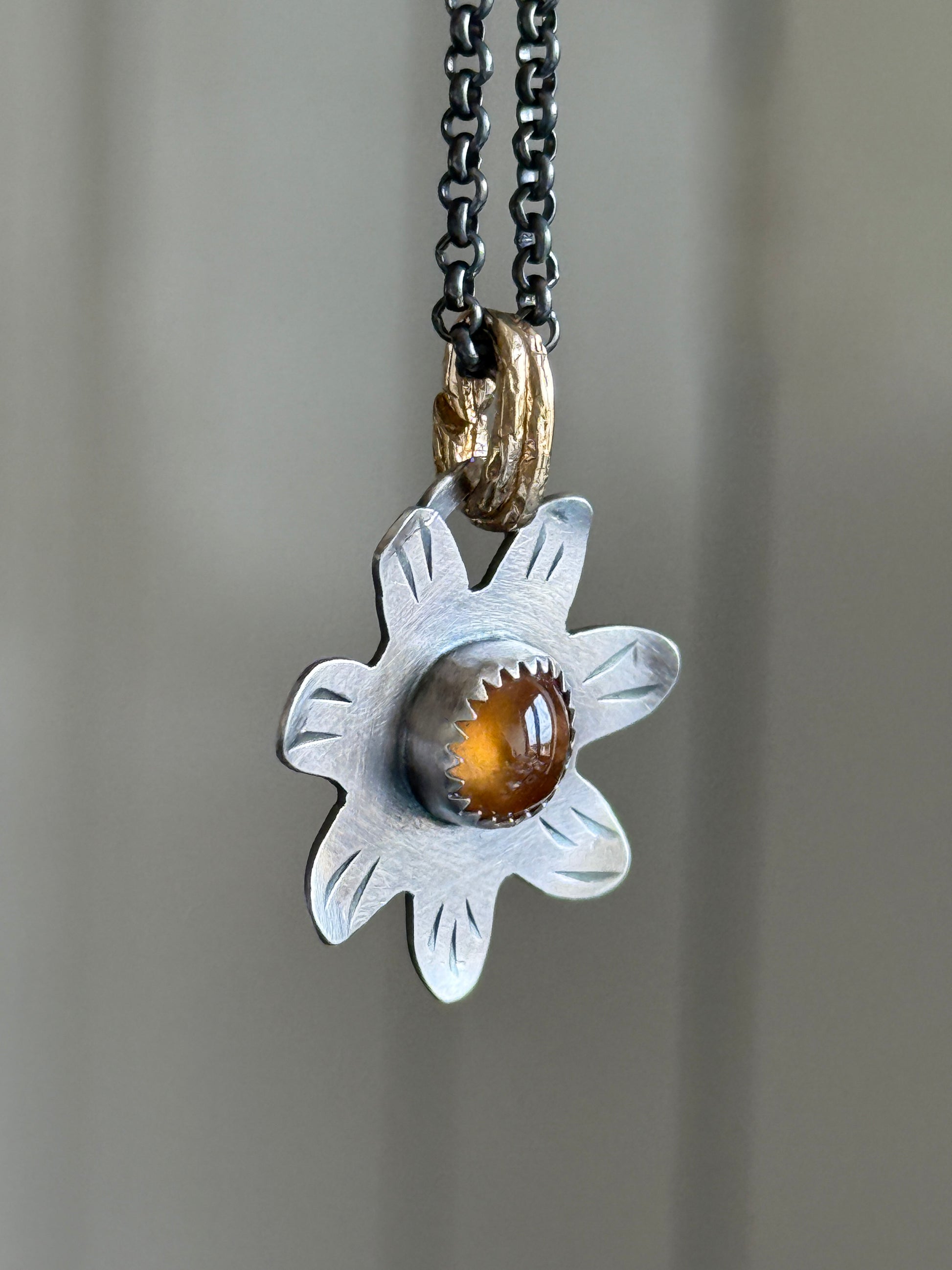 Featuring an orange garnet flower pendant necklace. The gemstone is set in fine silver on sterling silver. The pendant hangs from a dark oxidised sterling chain. The garnet is a dainty 7mm.
