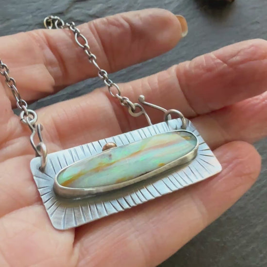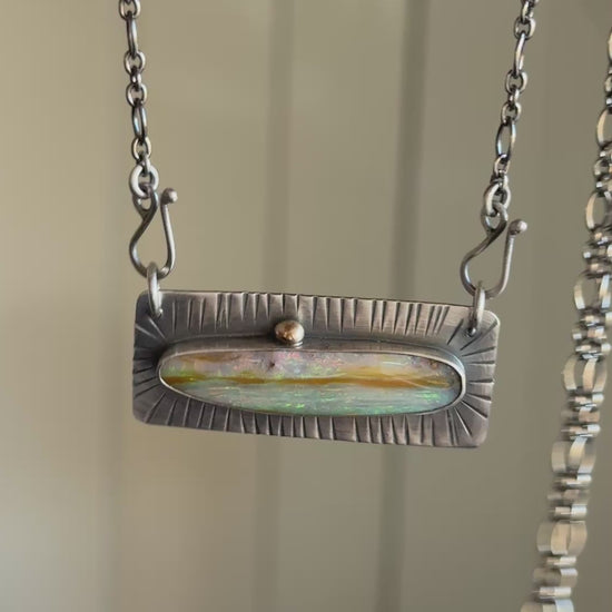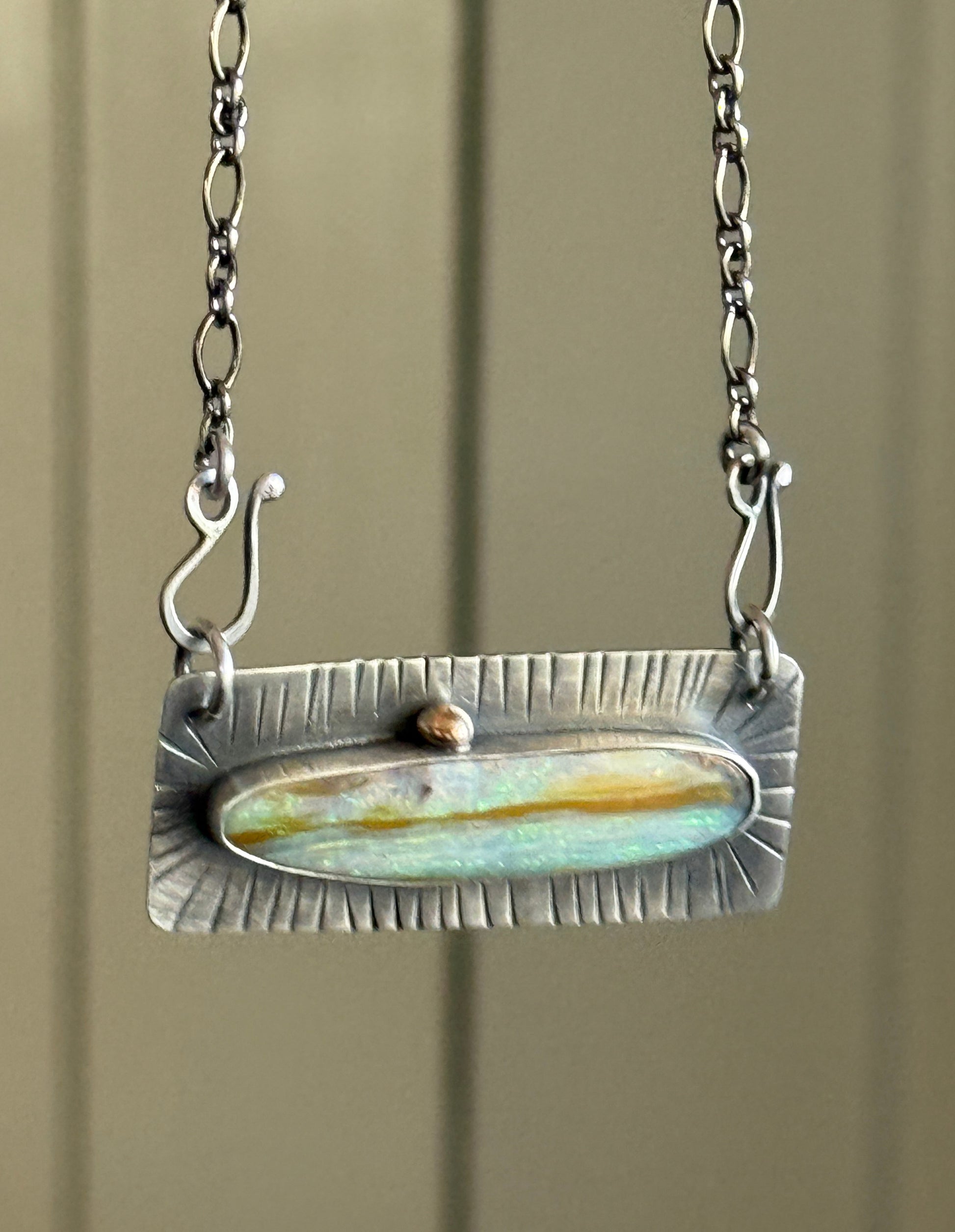 Featuring a sublime boulder opal. The stone is set in fine and sterling silver, with a 9ct gold dot accent. The pendant hangs a 18” lightly oxidised sterling silver with a front hook closure. The stone is 9.16ct and measures 33.34mm x 7.69mm. Lovely pastel green pink and camel colour play.