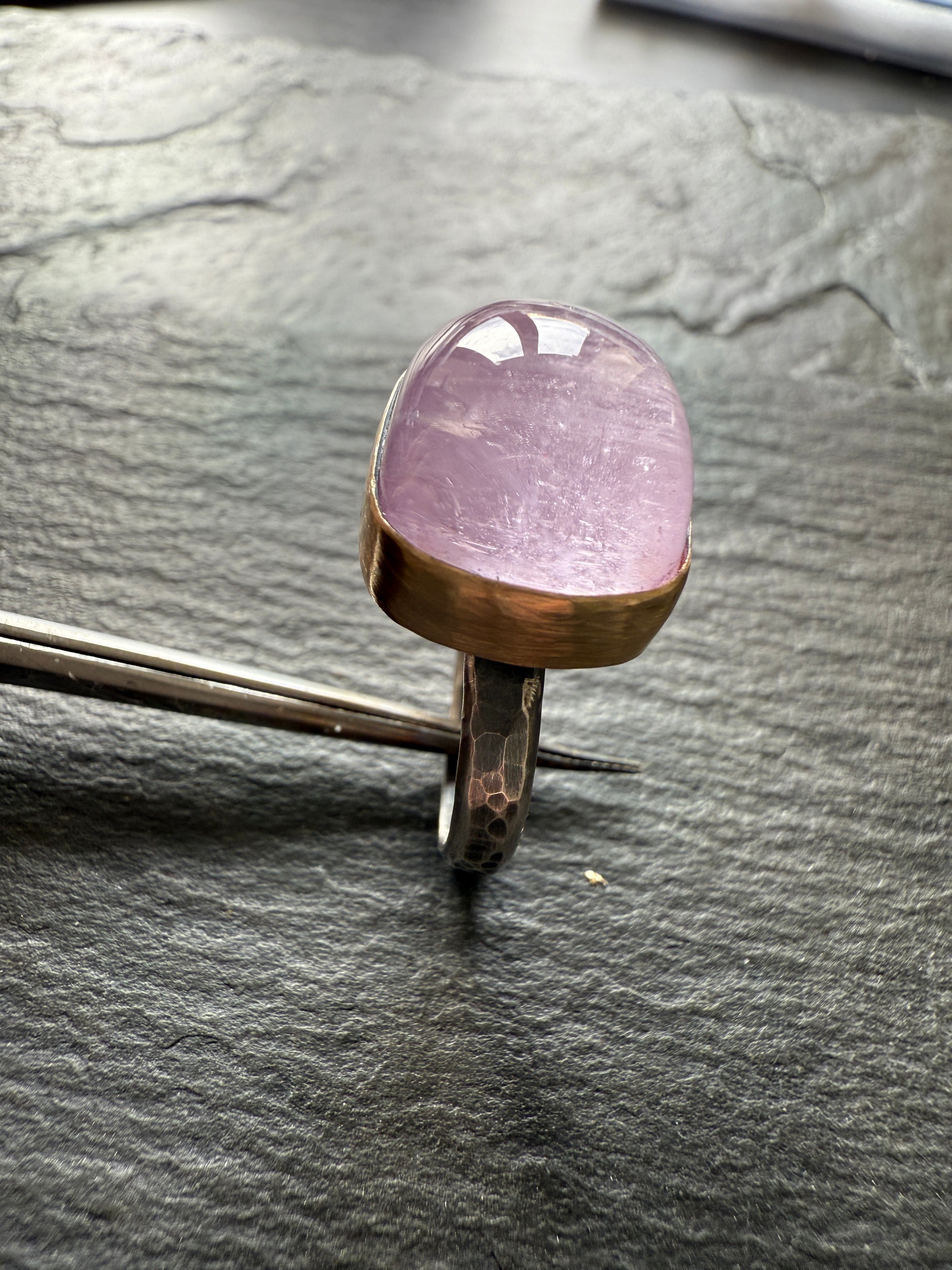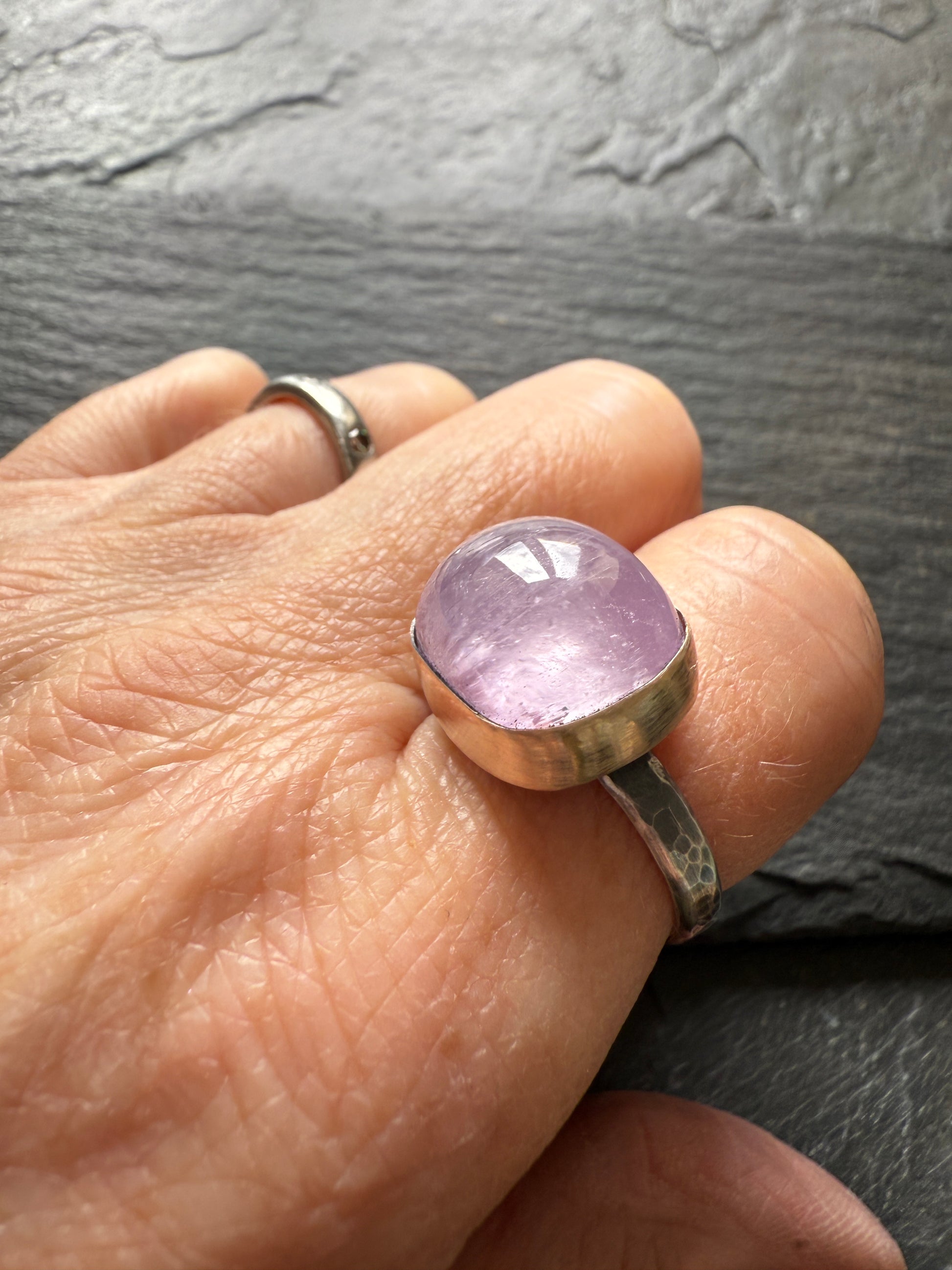 Featuring a delicate pastel pink Kunzite stone which sits atop a sterling silver hammered band. This beauty is set in 14k gold fill and sterling silver. Size is an 8. Ring stone measures 17mm x 15mm.