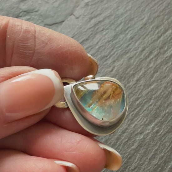 Featuring a unique pear rutile quartz with aurora opal, set in fine and sterling silver and an 18k gold accent. Imagine capturing a sunbeam frozen in time, streaked with threads of gold, and paired with the ethereal dance of the Northern Lights. This extraordinary stone does just that.