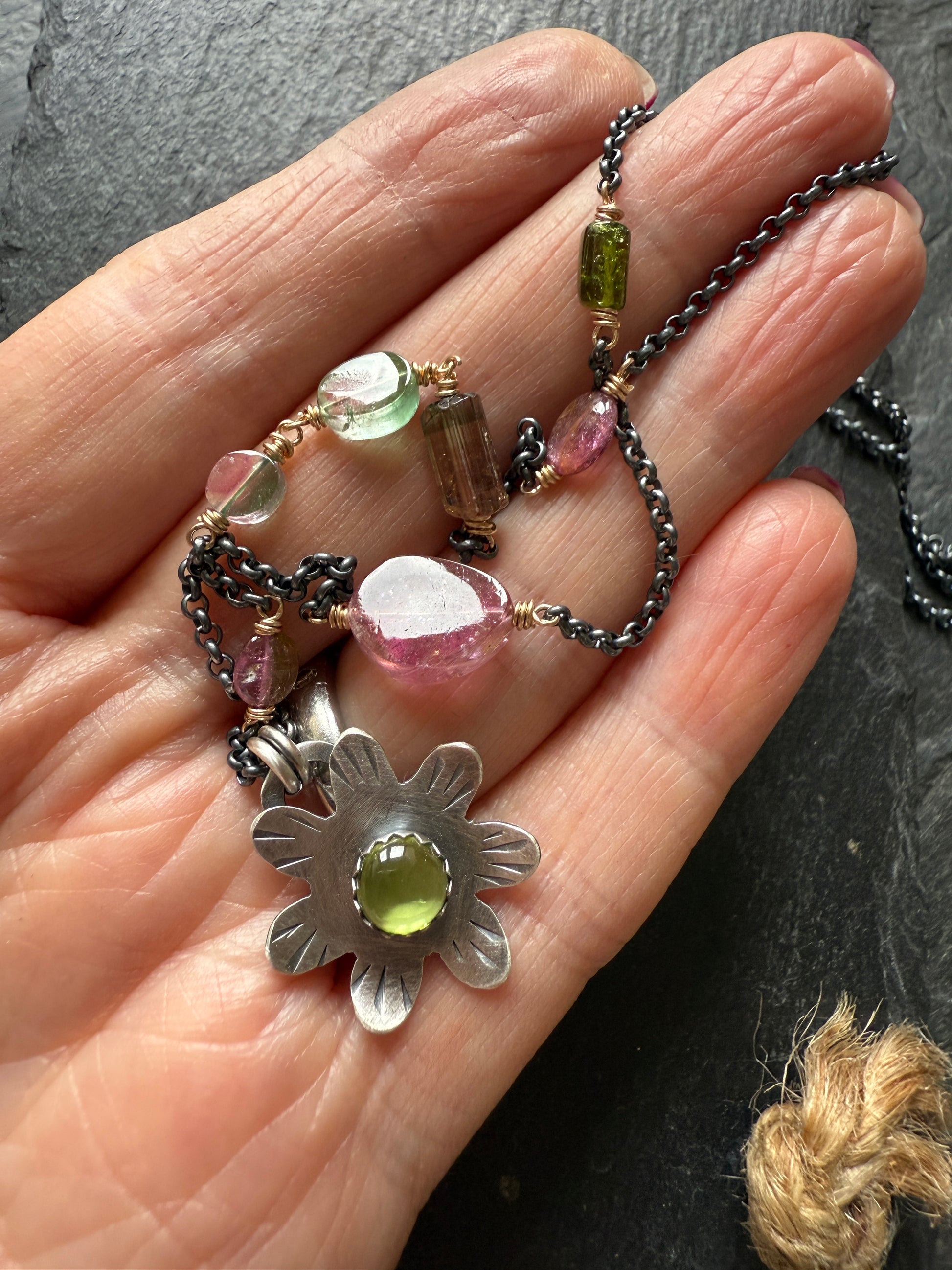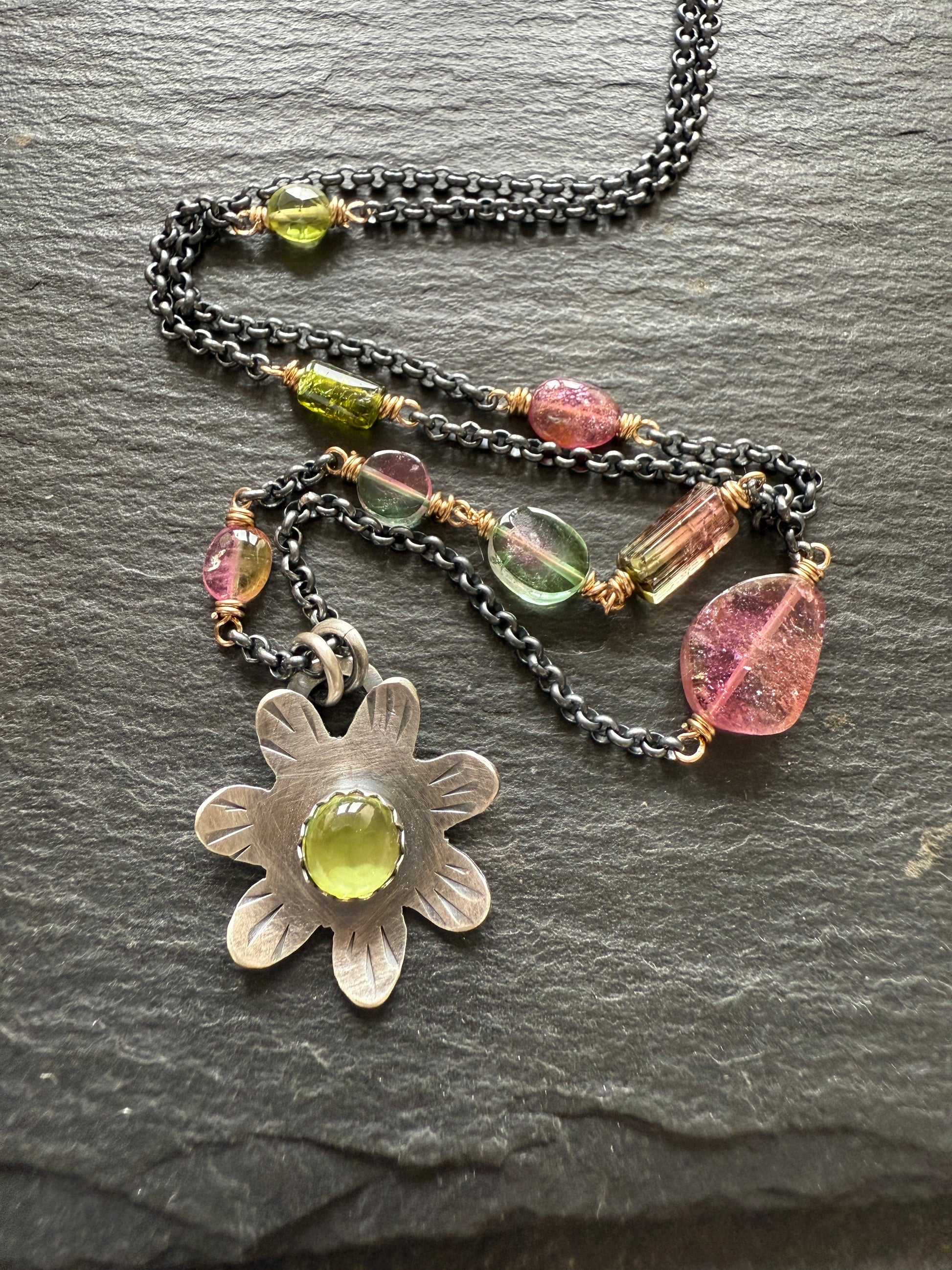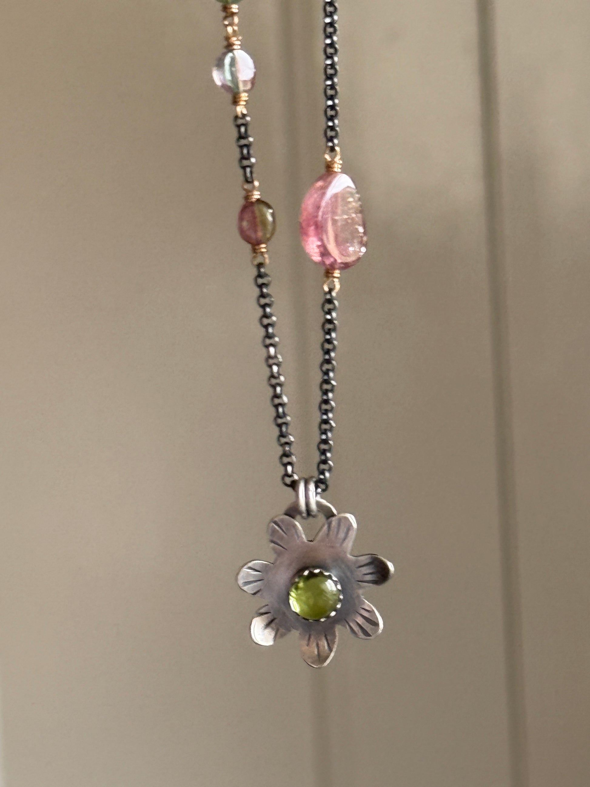 Featuring a peridot flower pendant necklace. The gemstone is set in fine silver on sterling. The pendant hangs from a dark oxidised sterling chain with a mixture of wire wrapped tourmaline gems. The gems are wire wrapped in 14k gold fill wire on the dark oxidised 18” sterling chain. The garnet is a dainty 6mm.