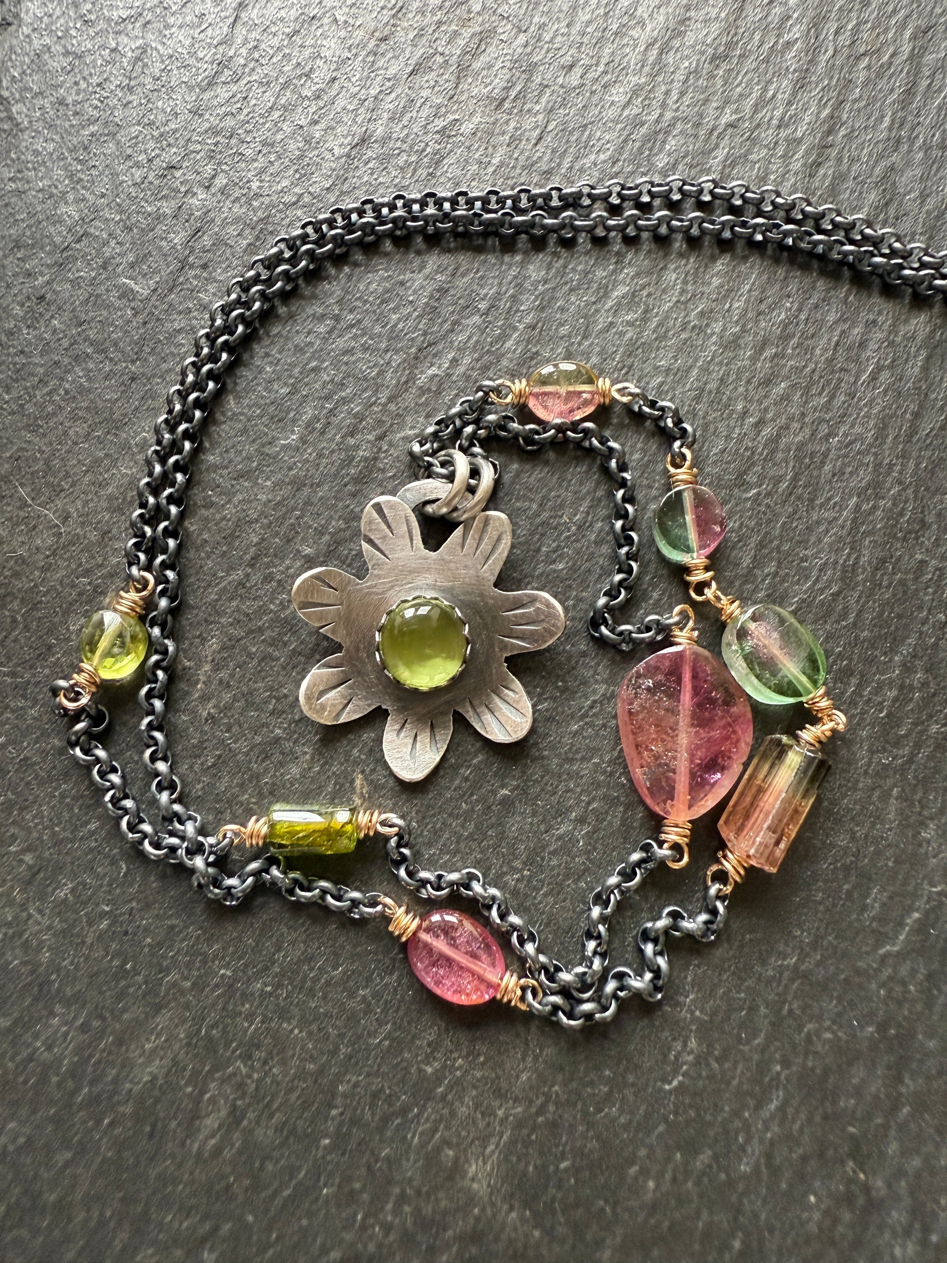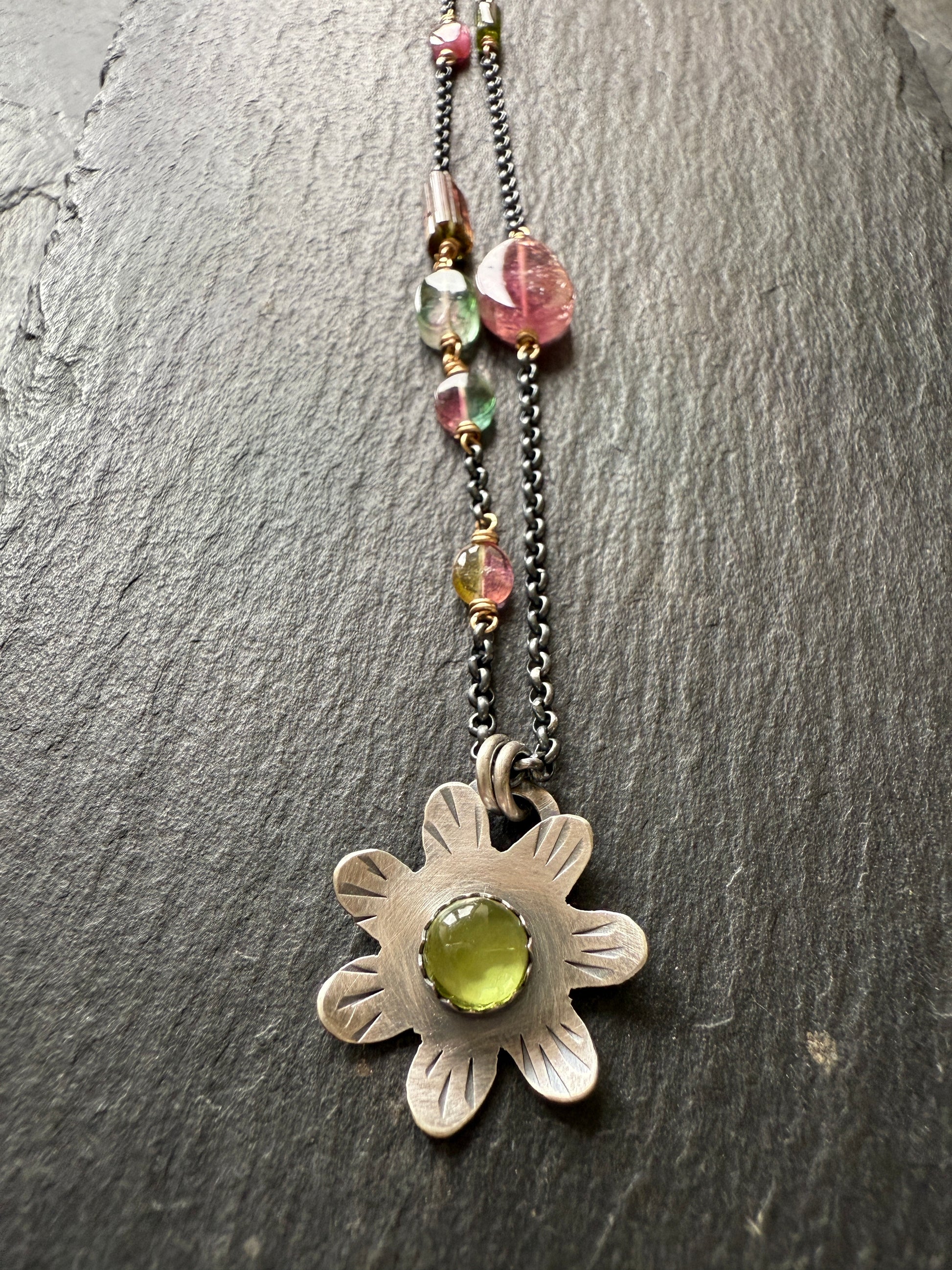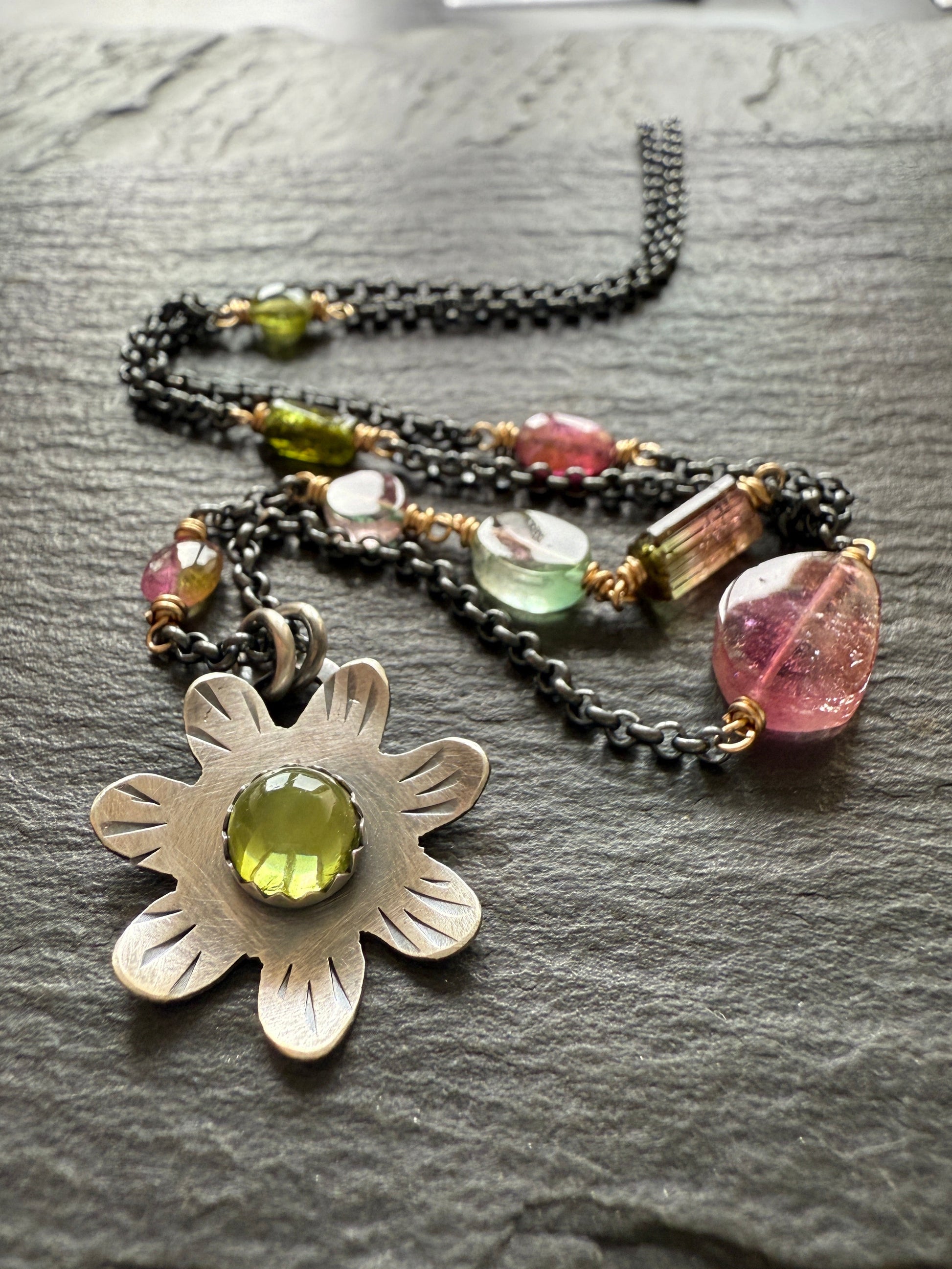 Featuring a peridot flower pendant necklace. The gemstone is set in fine silver on sterling. The pendant hangs from a dark oxidised sterling chain with a mixture of wire wrapped tourmaline gems. The gems are wire wrapped in 14k gold fill wire on the dark oxidised 18” sterling chain. The garnet is a dainty 6mm.