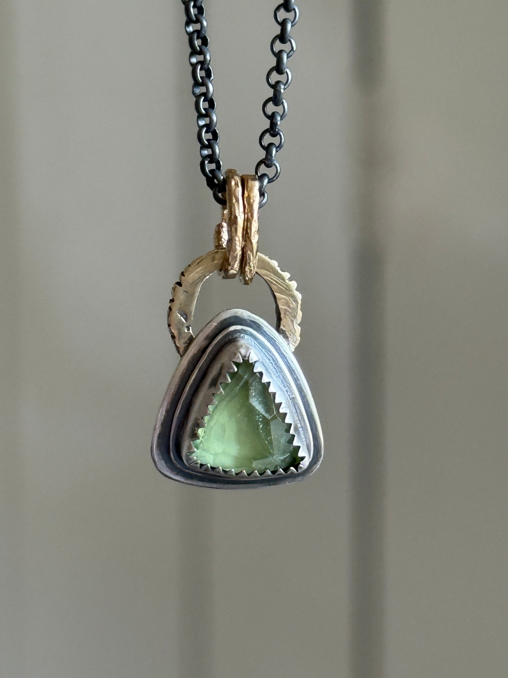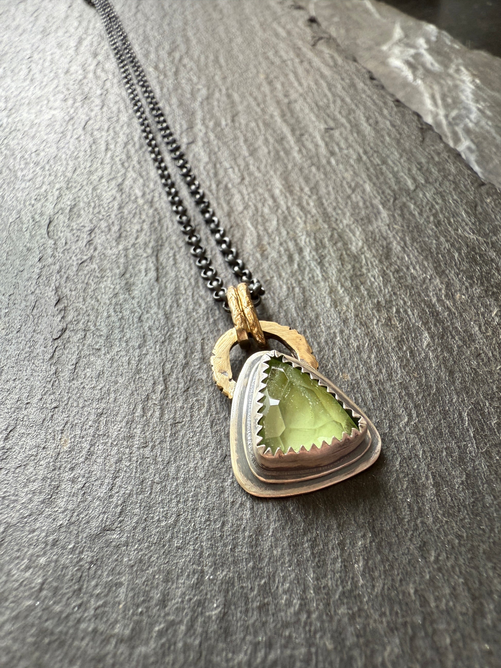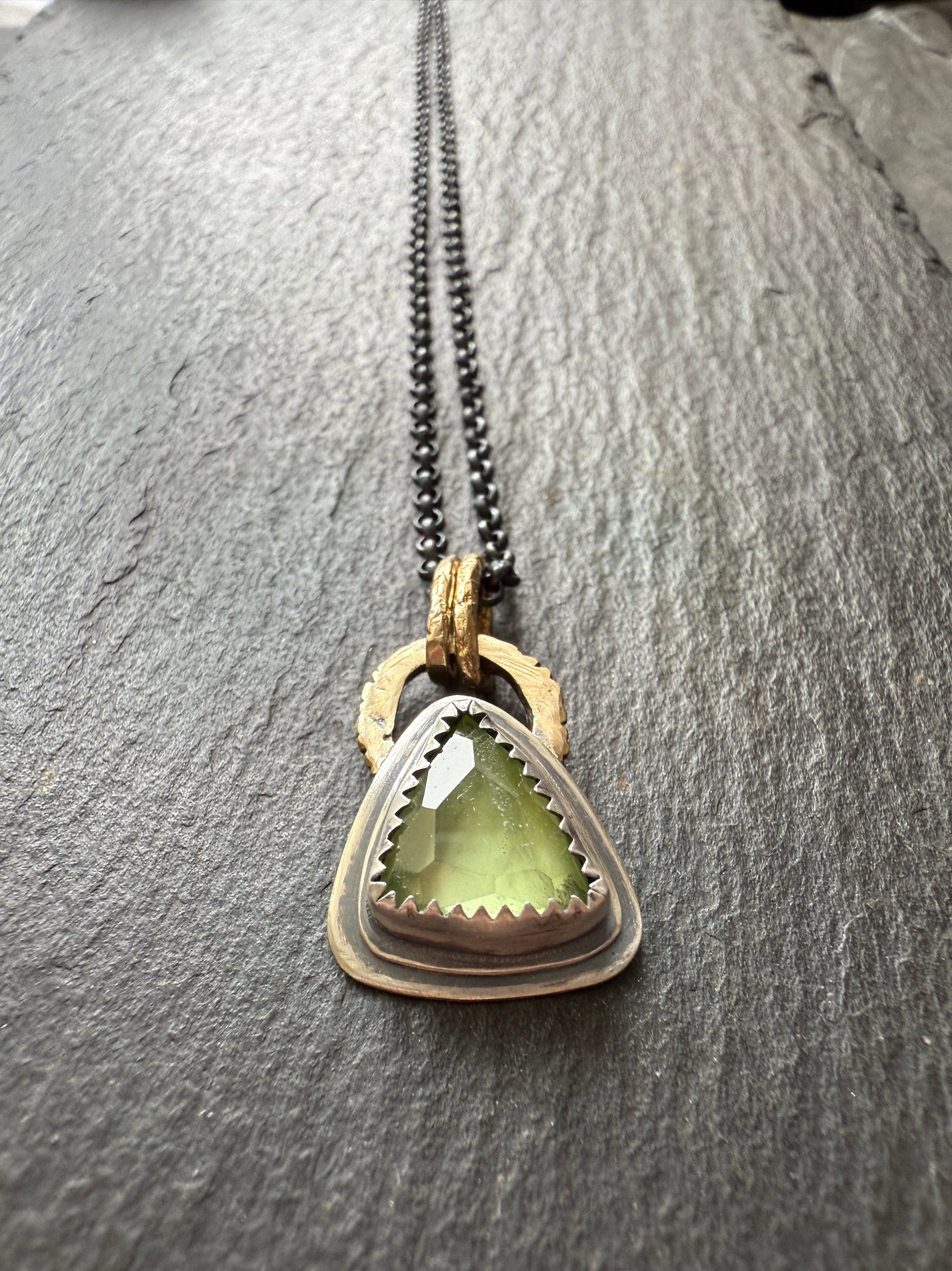 Featuring a dainty peridot gemstone set in fine and layered sterling silver. The pendant hangs from gold bronze links and an 18” dark oxidised chain. The pendant including the bail measures 20mm x 15mm approximately. Peridot is the birthstone month of August.