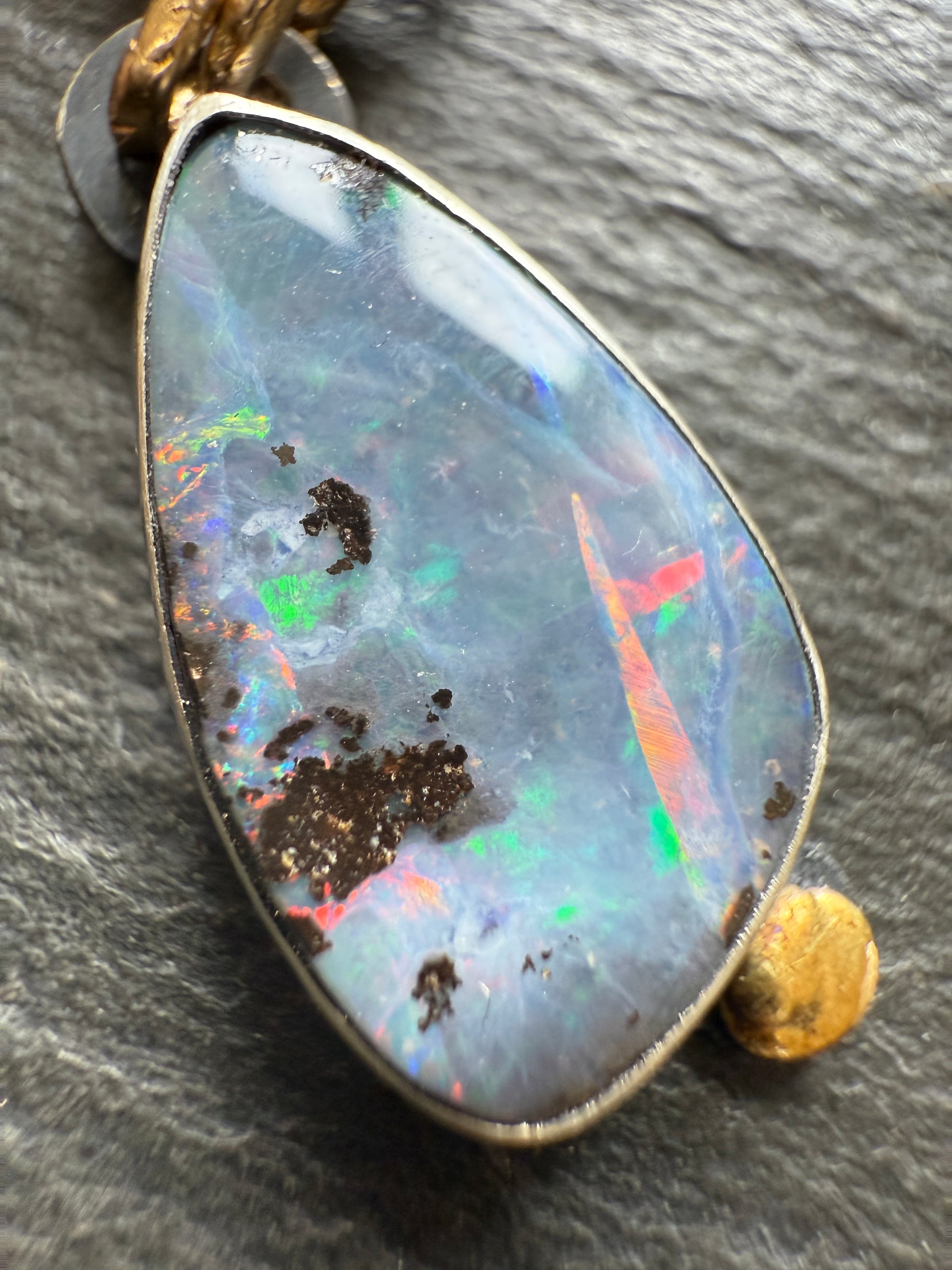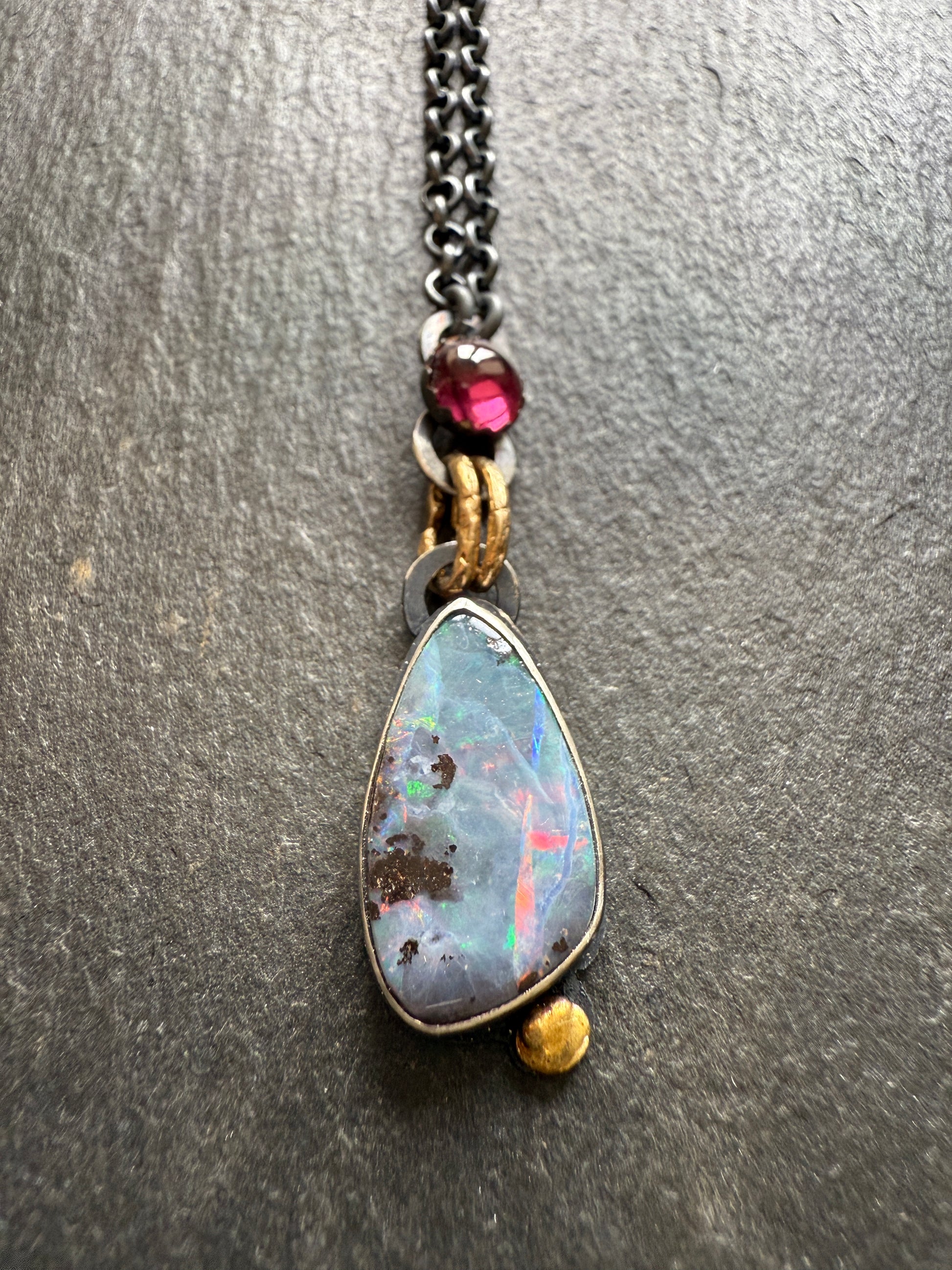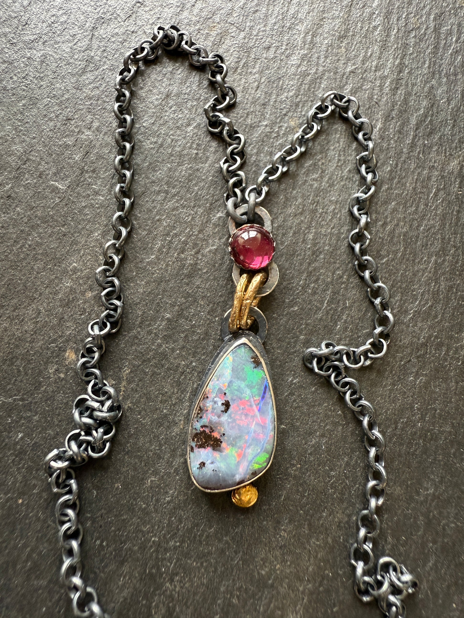 Featuring a gorgeous boulder opal and a pink garnet. These beautiful gems are set in fine and sterling silver with an 18k gold accent. The pendants which I have left dark oxidised, hang from a dark oxidised 18” sterling chain. The opal measures 20mm x 12mm approximately.
