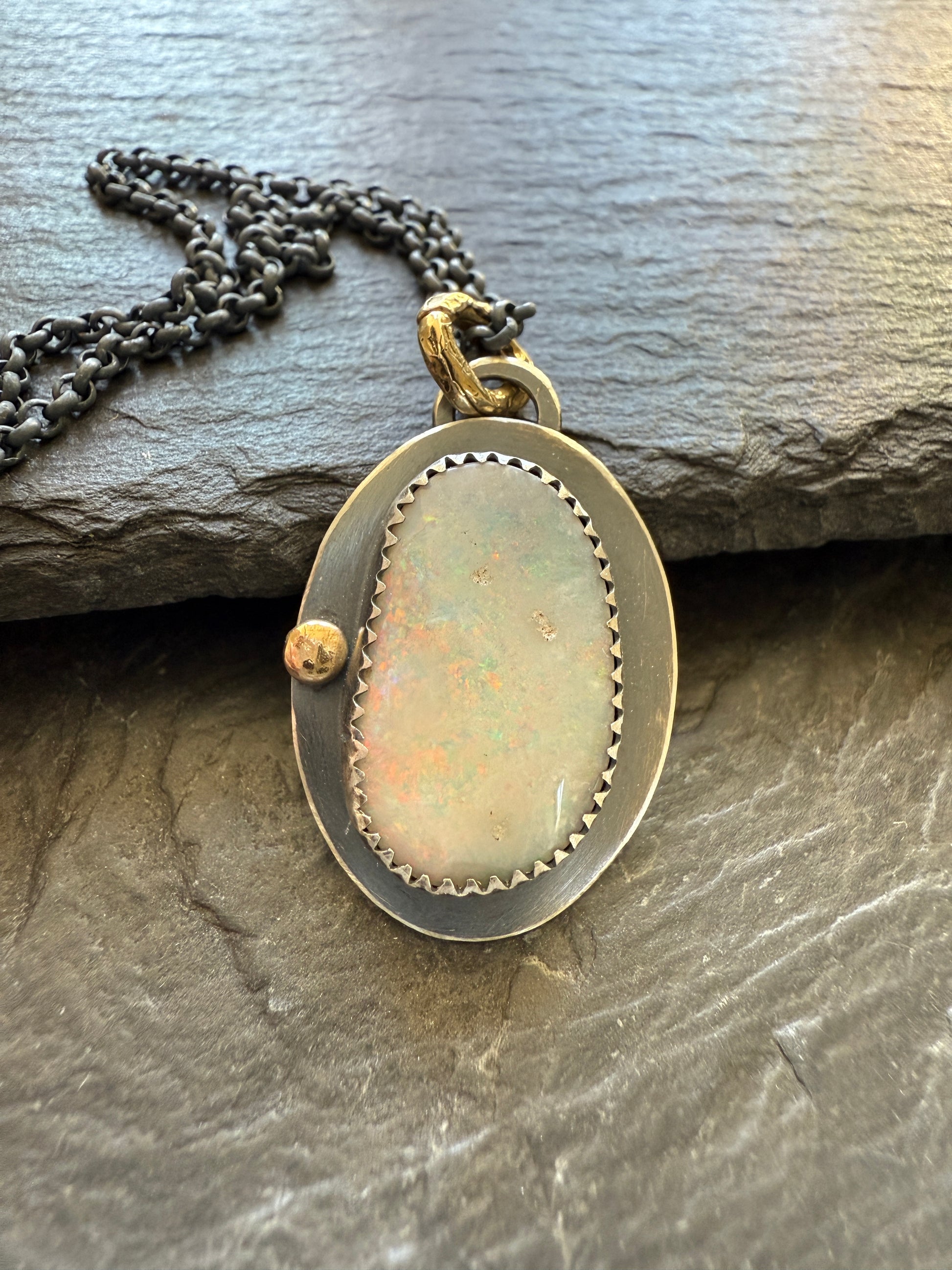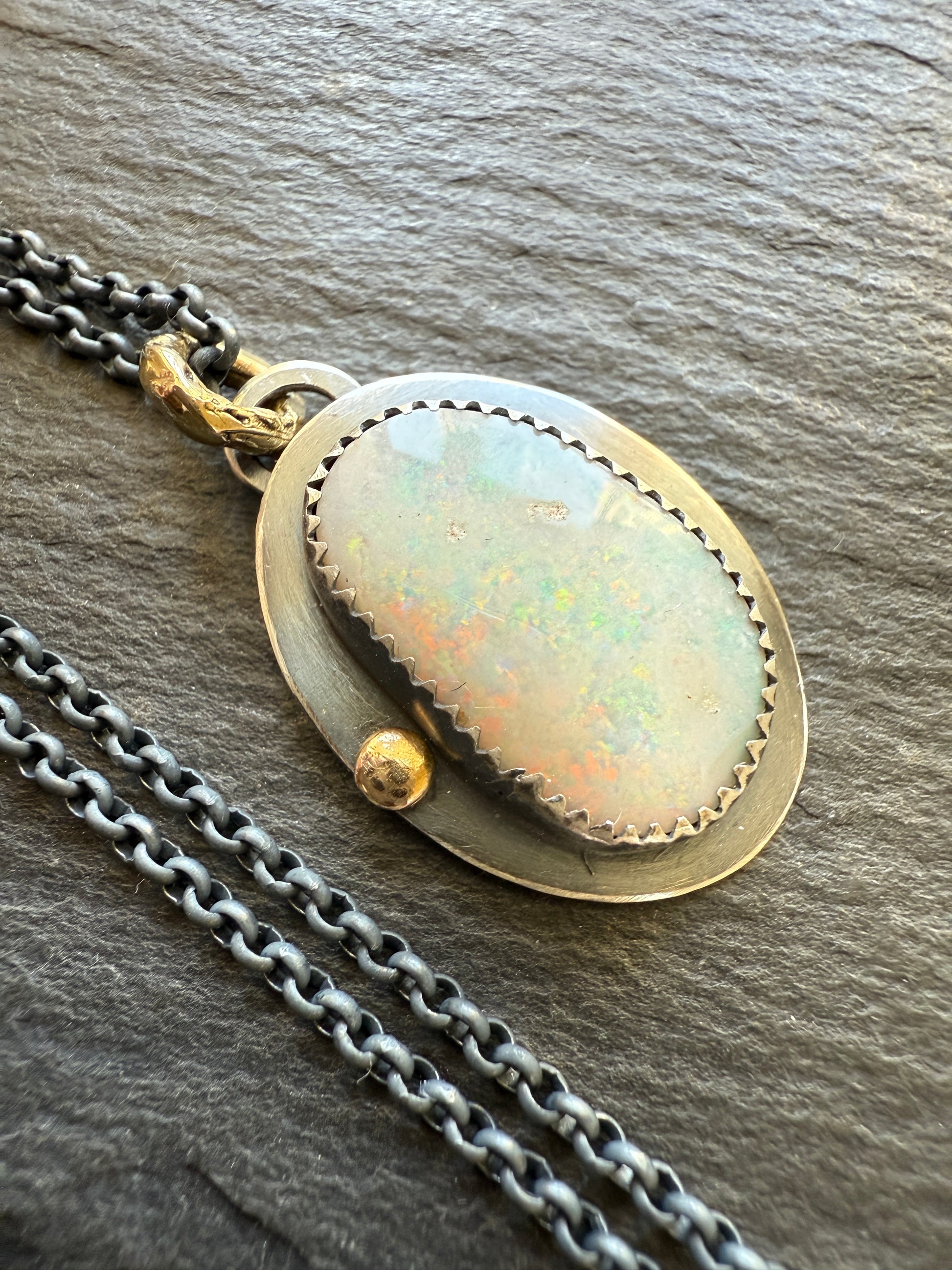 Featuring A lovely pastel opal set in fine and sterling silver with an 18k gold accent. This opal is full colour which is hard to capture in a photograph. The stone measures 20mm x 12mm, the pendant drop is 27mm and it hangs from a gold bronze link and an 18” sterling silver dark oxidised chain.