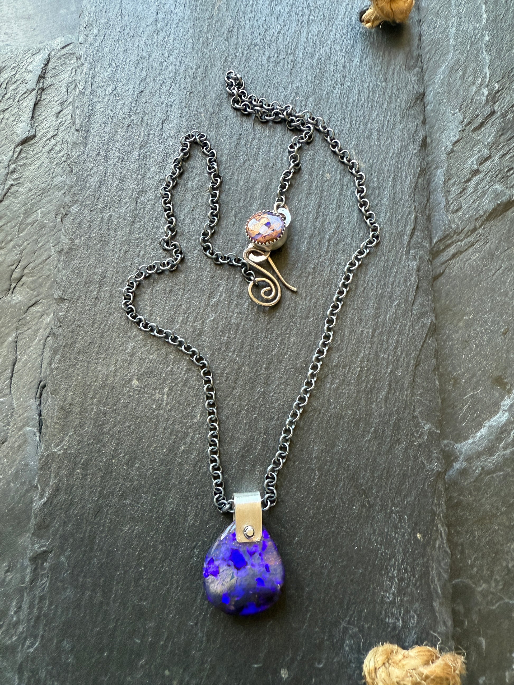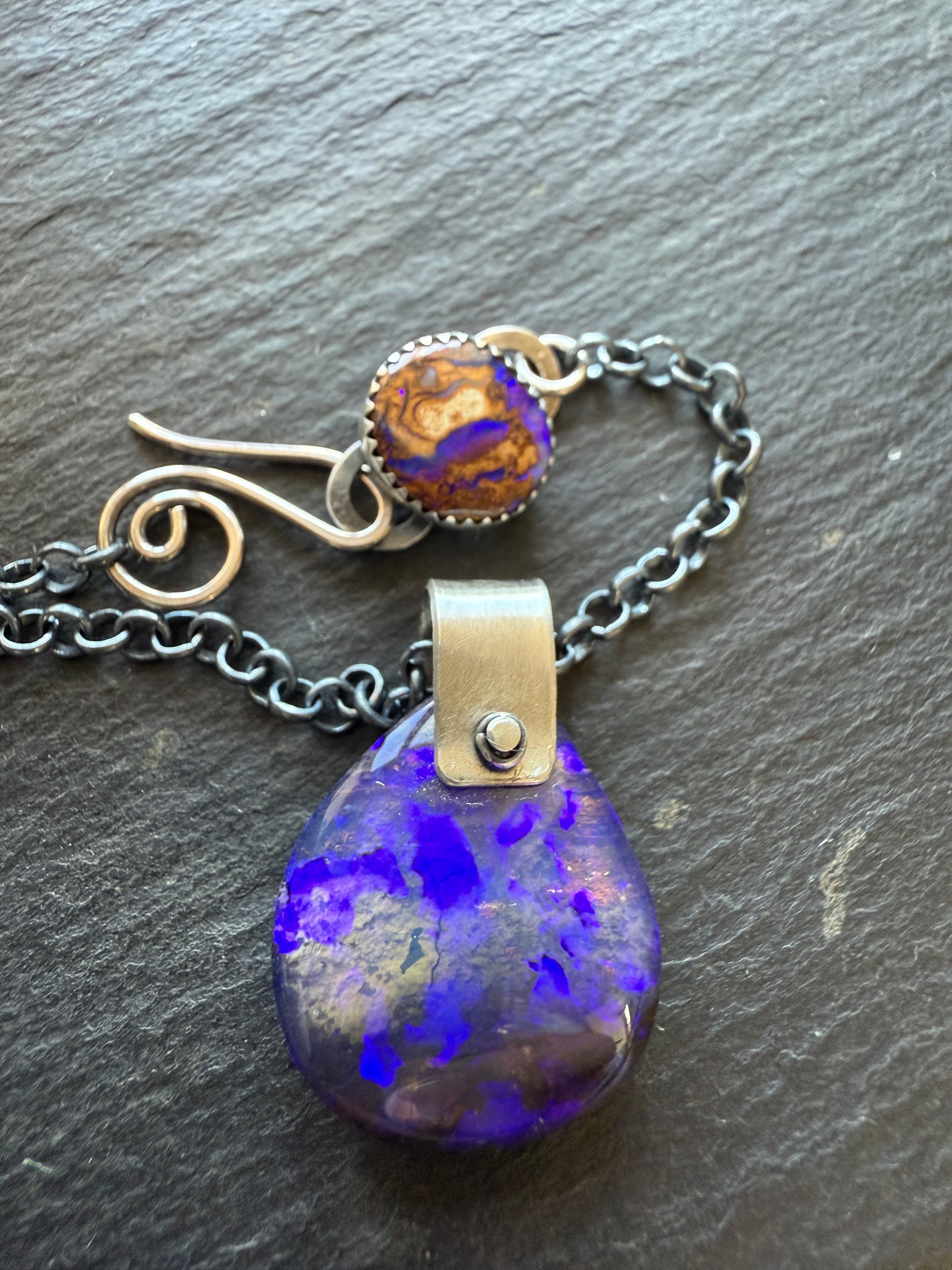 Featuring a beautiful boulder opal with purply blue colour play in this stunning boulder opal. It hangs from a hand forged bail and a 18” dark oxidised sterling silver chain with a lovely bezel set opal clasp. The stone measures 22mm 19mm x 16mm, the clasp is 10mm x 11mm approximately.