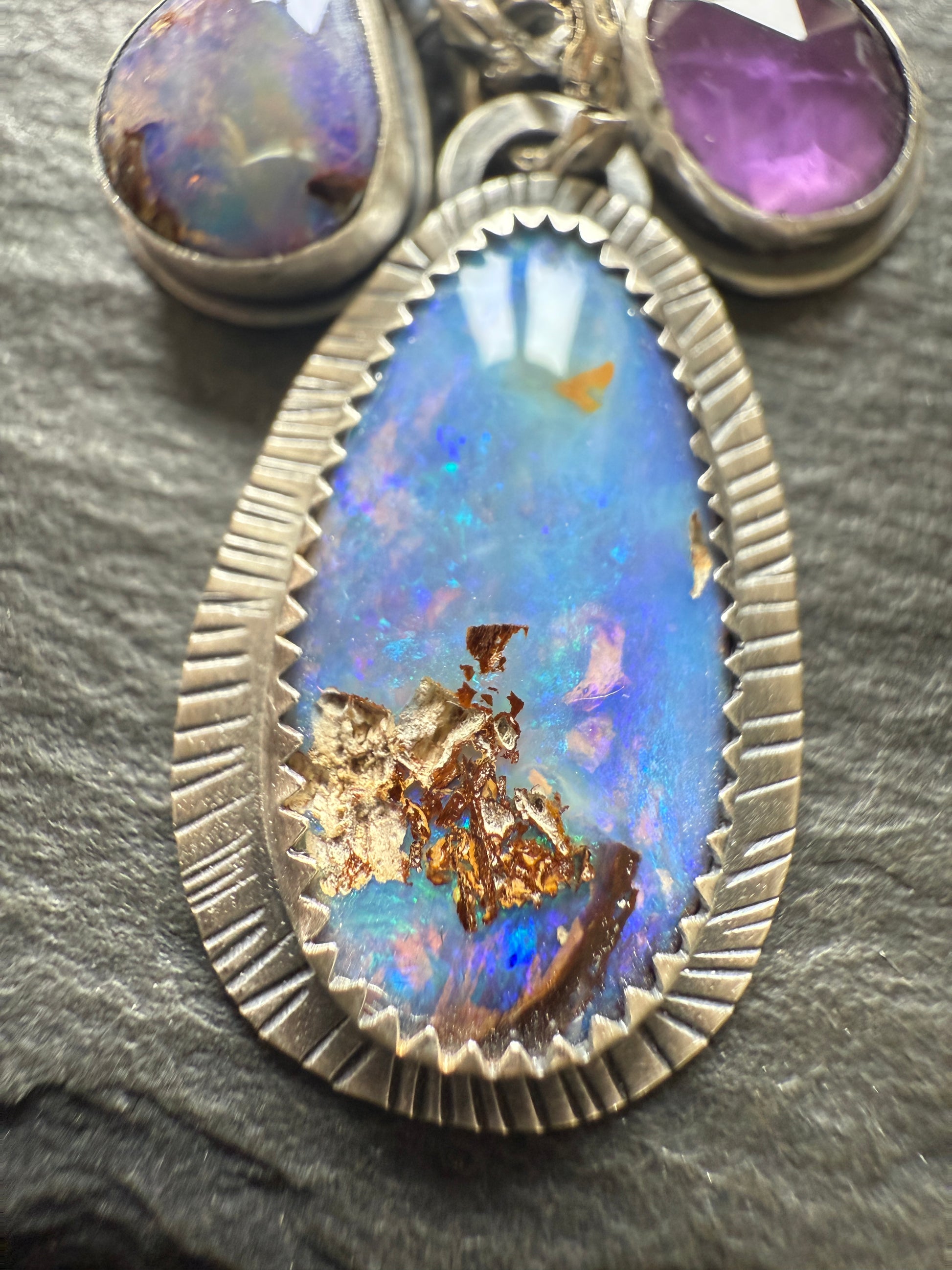 Featuring three gemstones and a sterling heart charm. There are two beautiful boulder opals and an amethyst. The stones are set in fine and sterling silver. The pendants hang from sterling silver links and an 18” sterling silver chain.