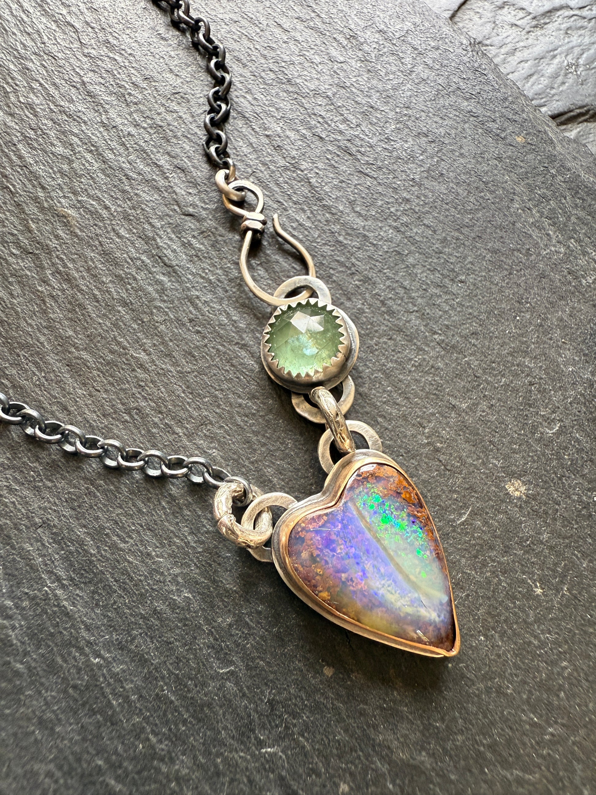 Featuring a beautiful heart opal with a green kyanite. I have bezel set the gorgeous boulder opal in 14k golf fill on sterling silver, and a green kyanite in fine and sterling silver. The pendants hangs from sterling links, a dark oxidised sterling chain with a hand forged hook. The opal measures 18mm x 13mm, the kyanite is 8mm approximately.