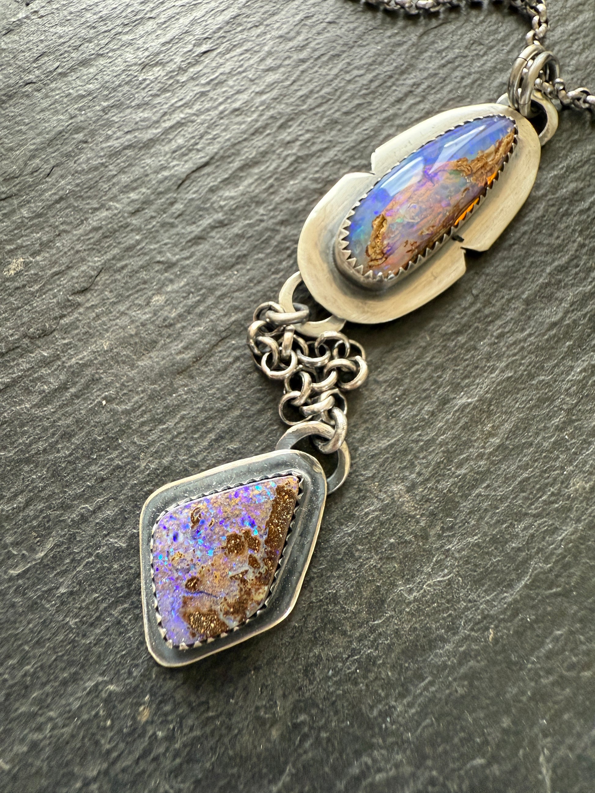 Featuring two beautiful boulder opals. The stones are bezel set in recycled sterling silver and fine silver, oxidised and polished to a rustic patina. The pendants hang from sterling links and a lightly oxidised sterling silver 15.5” sterling chain with a 4” drop.