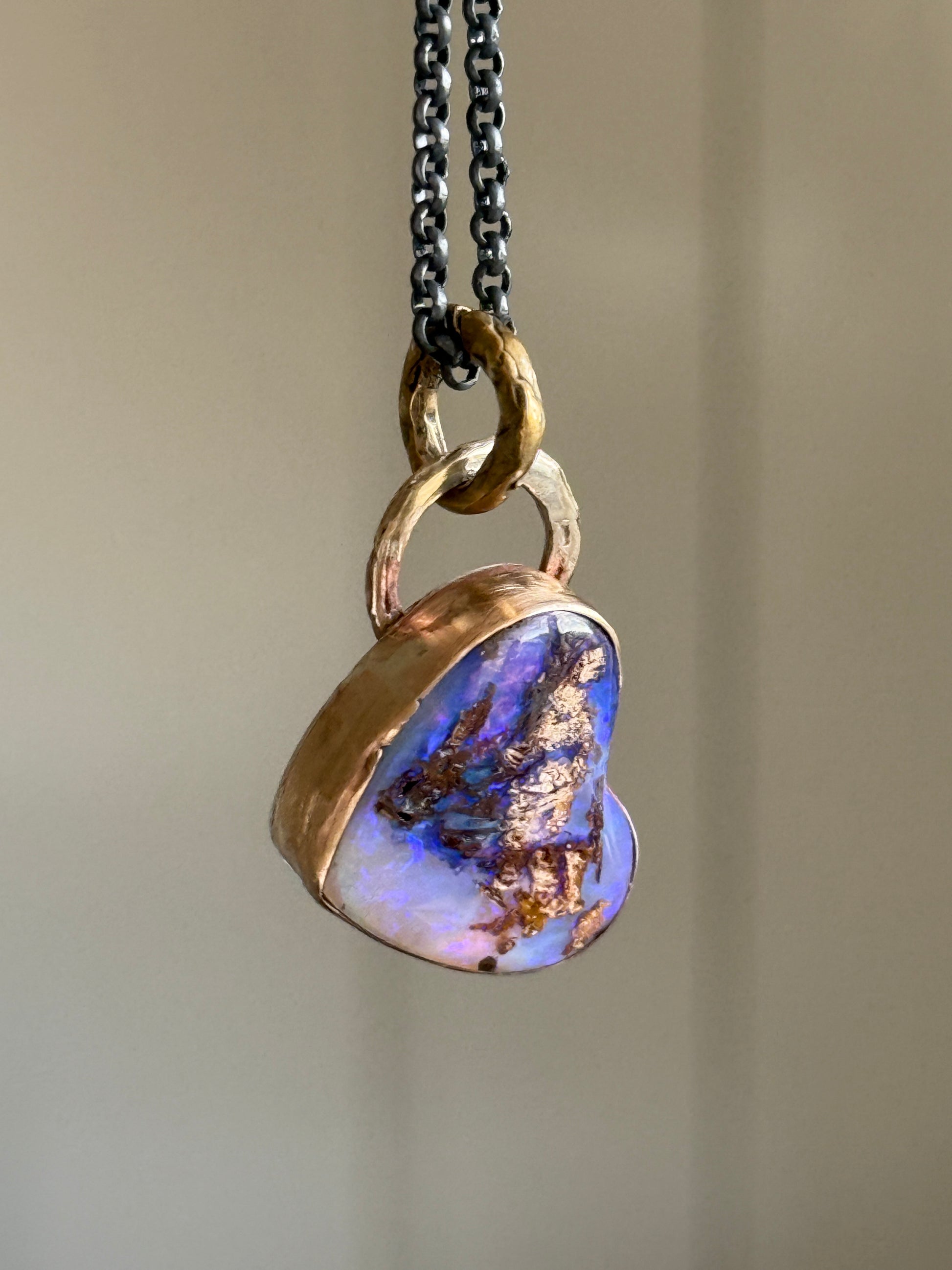 Featuring a gorgeous Boulder Opal heart set in 14K gold fill on sterling silver. This beauty hangs from a gold bronze link and a dark oxidised sterling silver chain of 18 inches. This stone has blue, green and purple colour play.