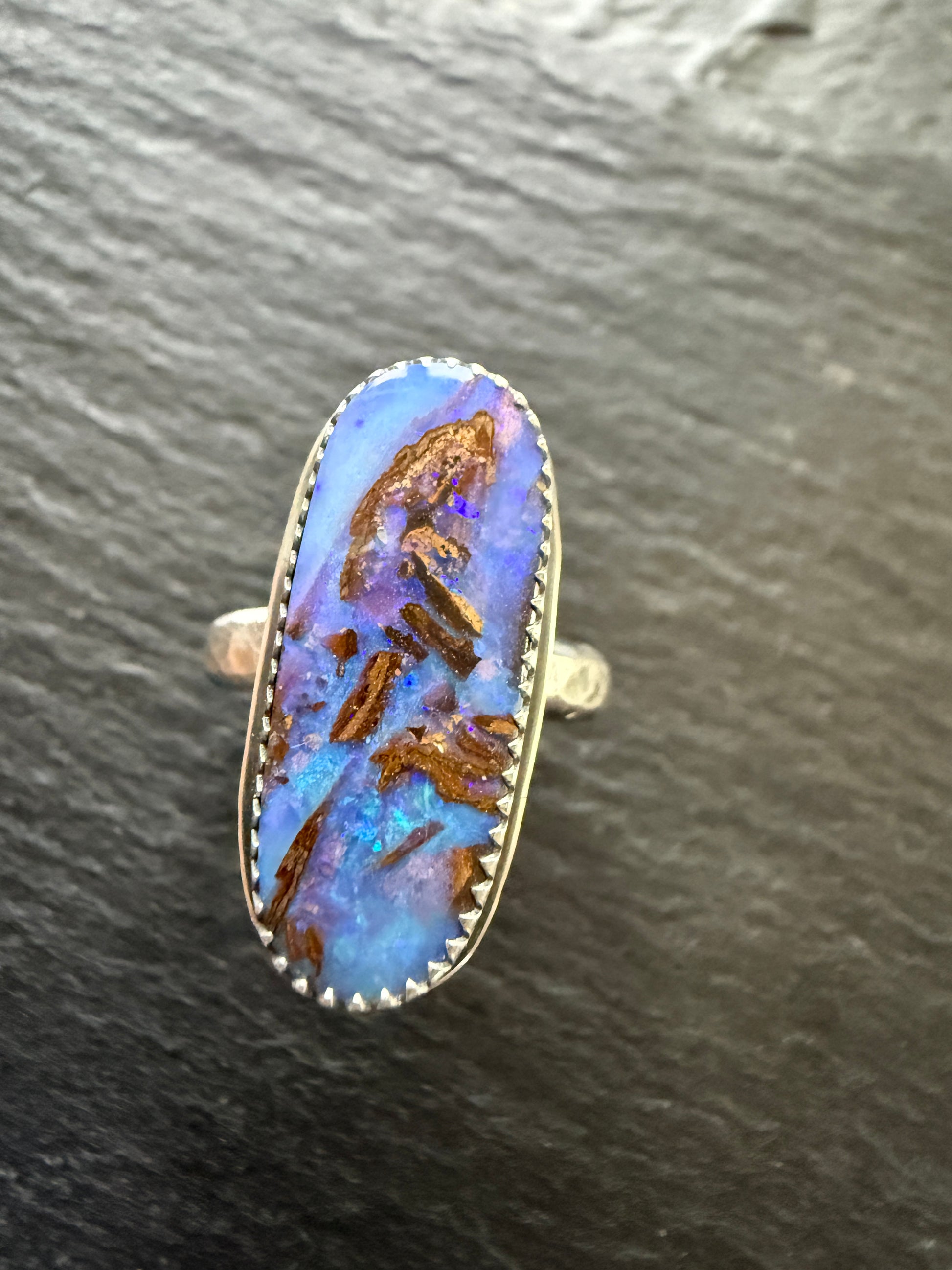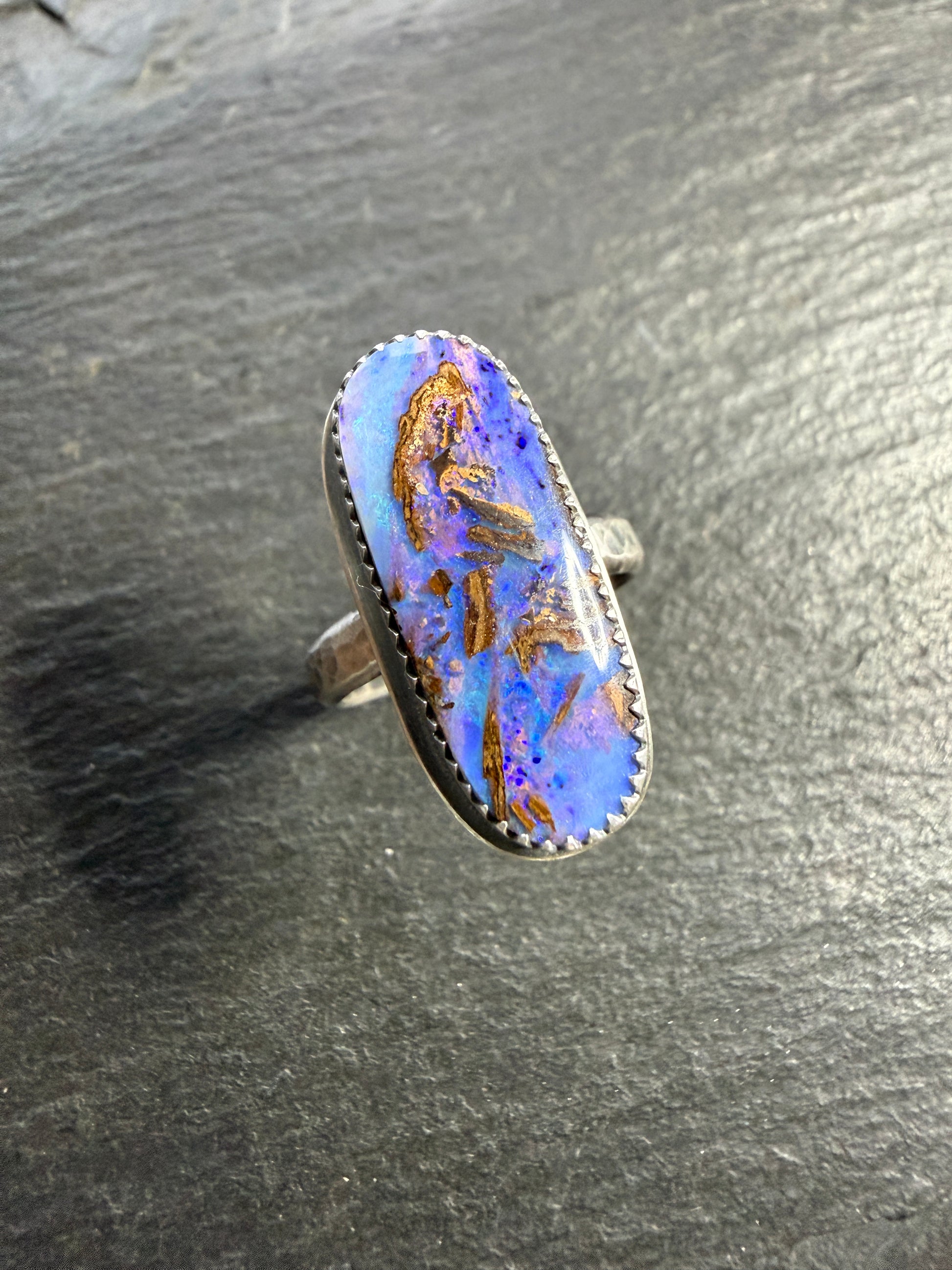 Featuring a beautiful purple boulder opal, set in fine and sterling silver, oxidised and lightly polished to a rustic patina. This ring fits a US 7, UK N 1/2. The stone measures 22mm x 9mm and is 8.60 cts. Boulder opals are rare and desirable, each one is truly unique.