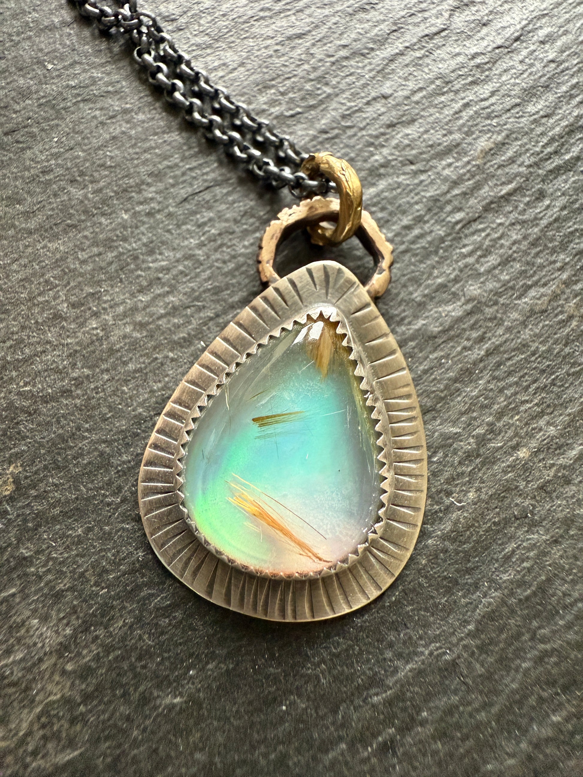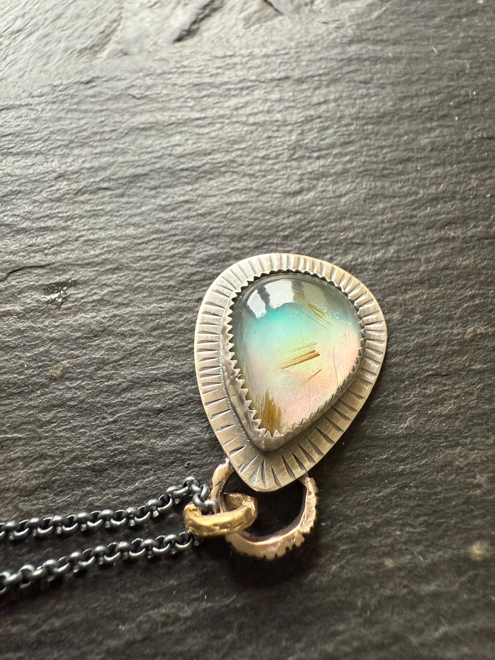 Featuring a unique pear rutile quartz with aurora opal, set in fine and sterling silver. The pear opal measures 18mm x 13mm approximately. Imagine capturing a sunbeam frozen in time, streaked with threads of gold, and paired with the ethereal dance of the Northern Lights. This extraordinary stone does just that.