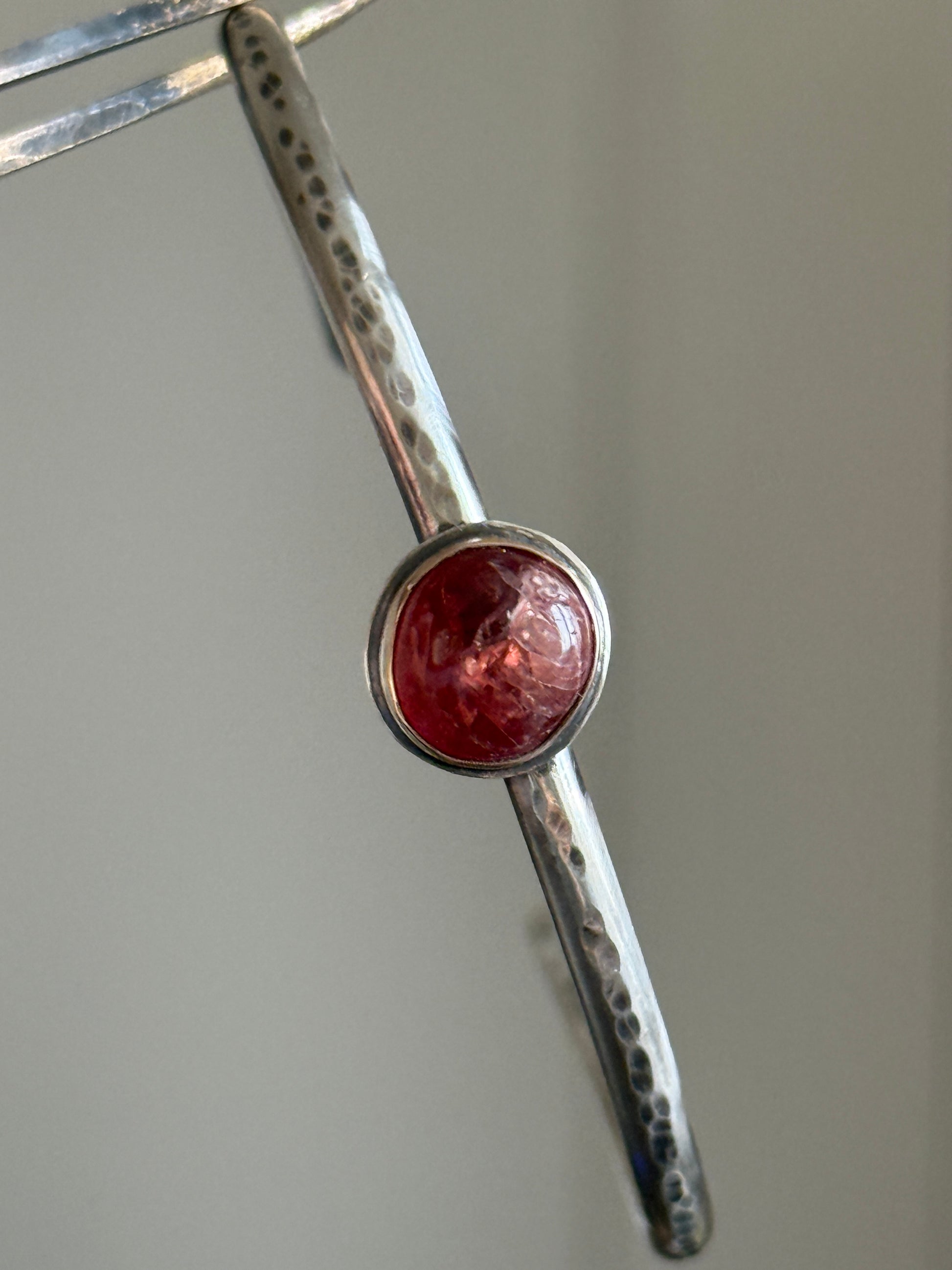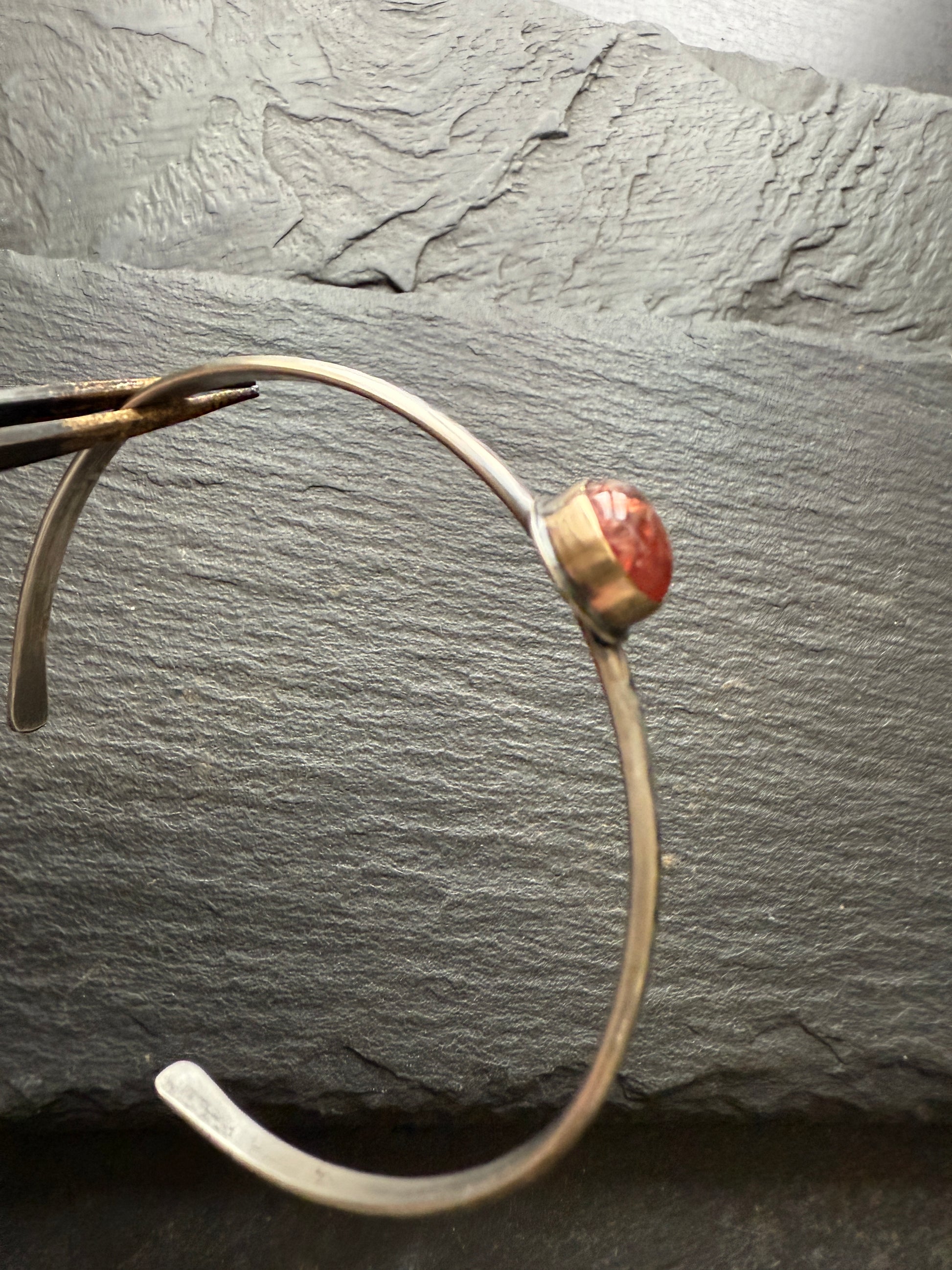 Featuring a sterling silver cuff bangle which has been oxidised and hammered for a texture. Atop sits a pretty orange spinel stone. The gemstone is set in 14k gold fill on sterling silver. The bracelet will fit a 6 - 6.5” wrist. Stone measures approximately 9mm approximately.