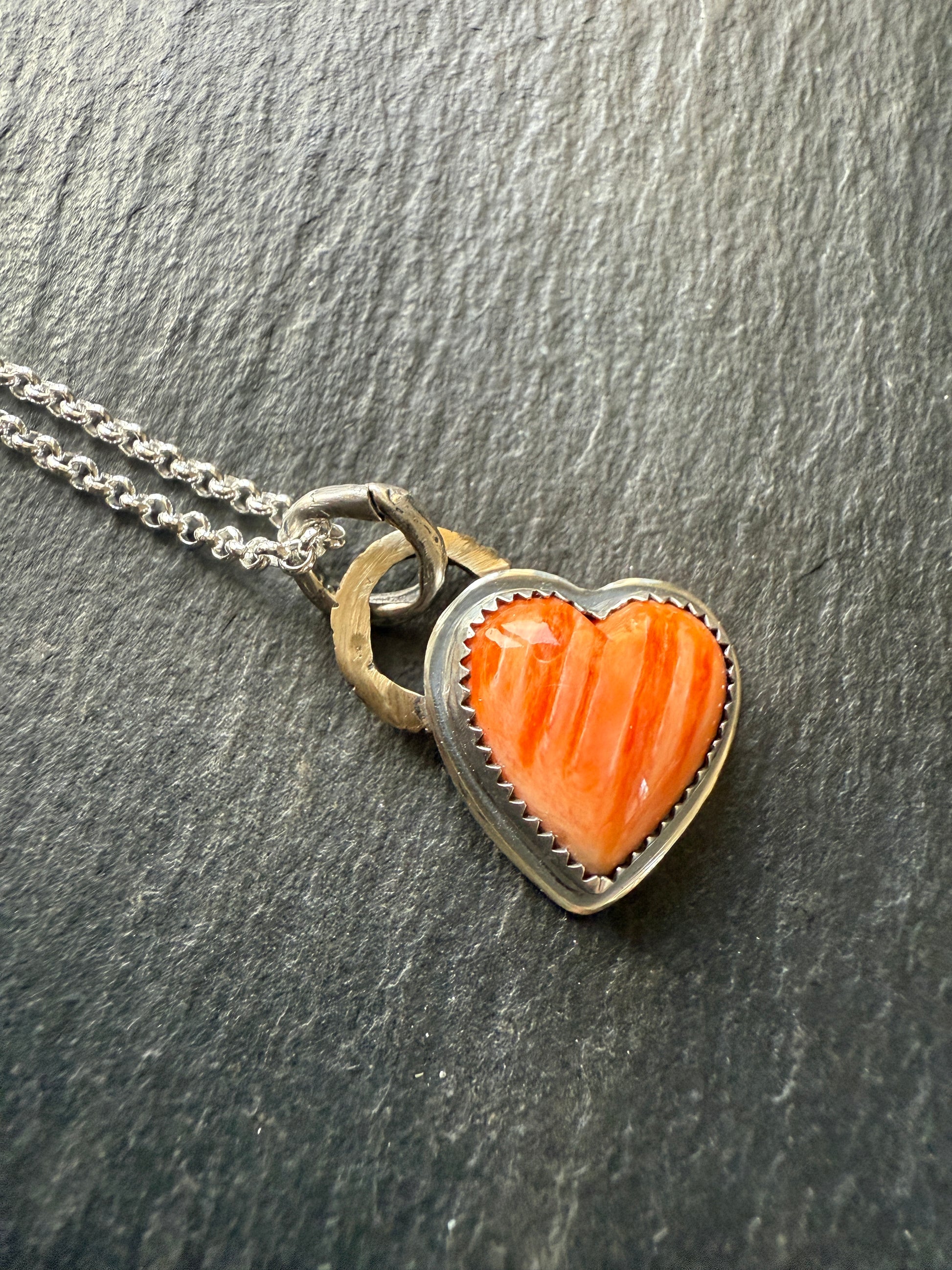 Featuring a Spiney Oyster heart stone set in oxidised fine and sterling silver with a gold bronze links with a shiny silver 18” sterling silver chain. The stone measures 14mm x 14mm excluding the setting. The pendant has been oxidised and given a light polish.