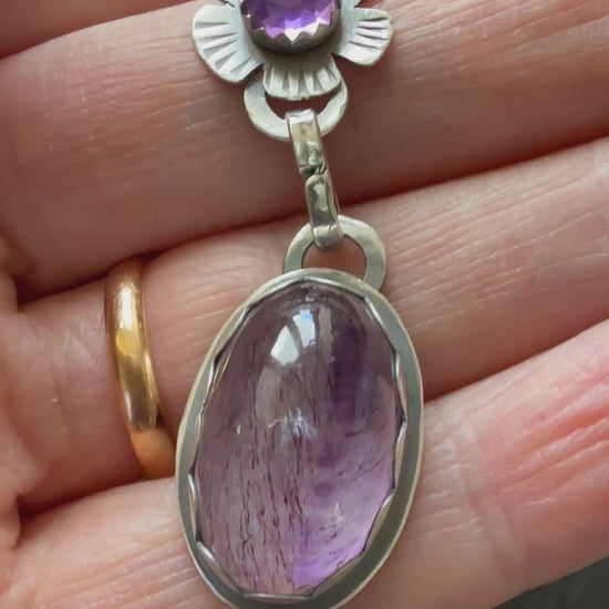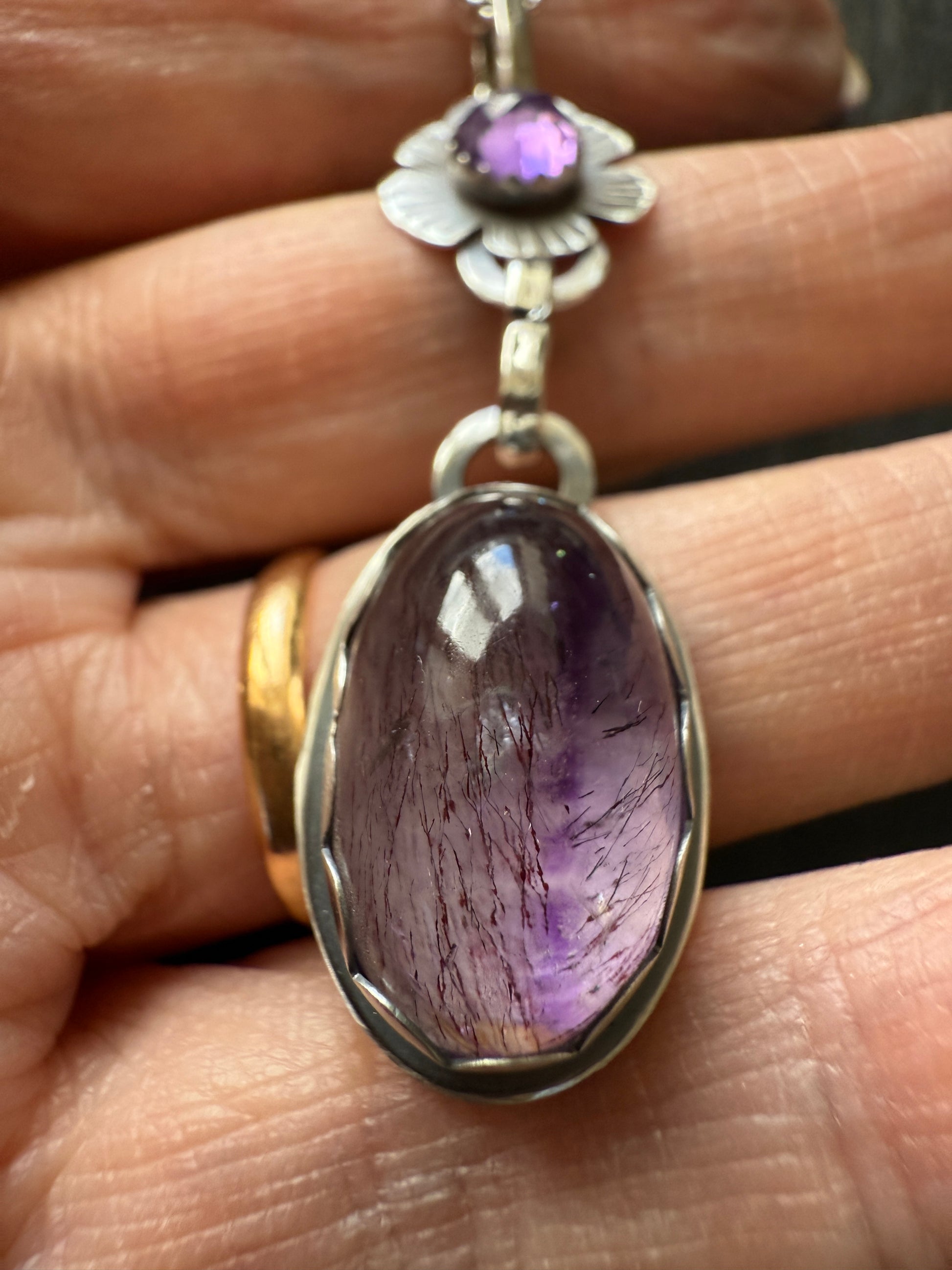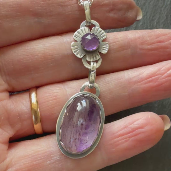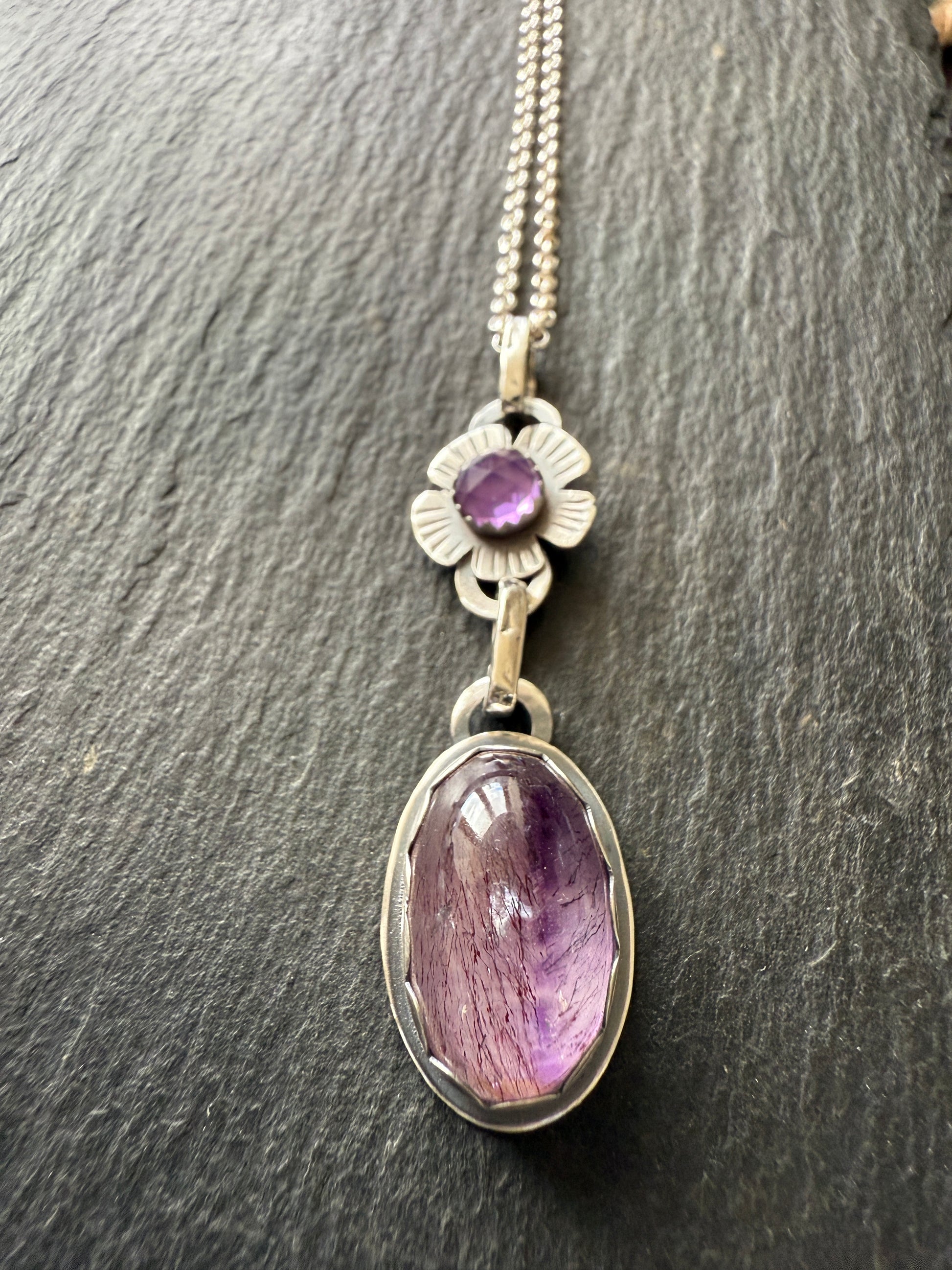 Featuring a Super Seven stone. Exquisite Natural Beauty – This gorgeous oval cabochon features vibrant amethyst infused with golden cacoxenite inclusions, creating a mesmerizing contrast of deep purple and shimmering golden streaks. Each piece is unique, showcasing nature's artistry. I have married this with a dainty amethyst set in a flower design. The pendants hang from sterling links and a bright sterling silver 18” chain.