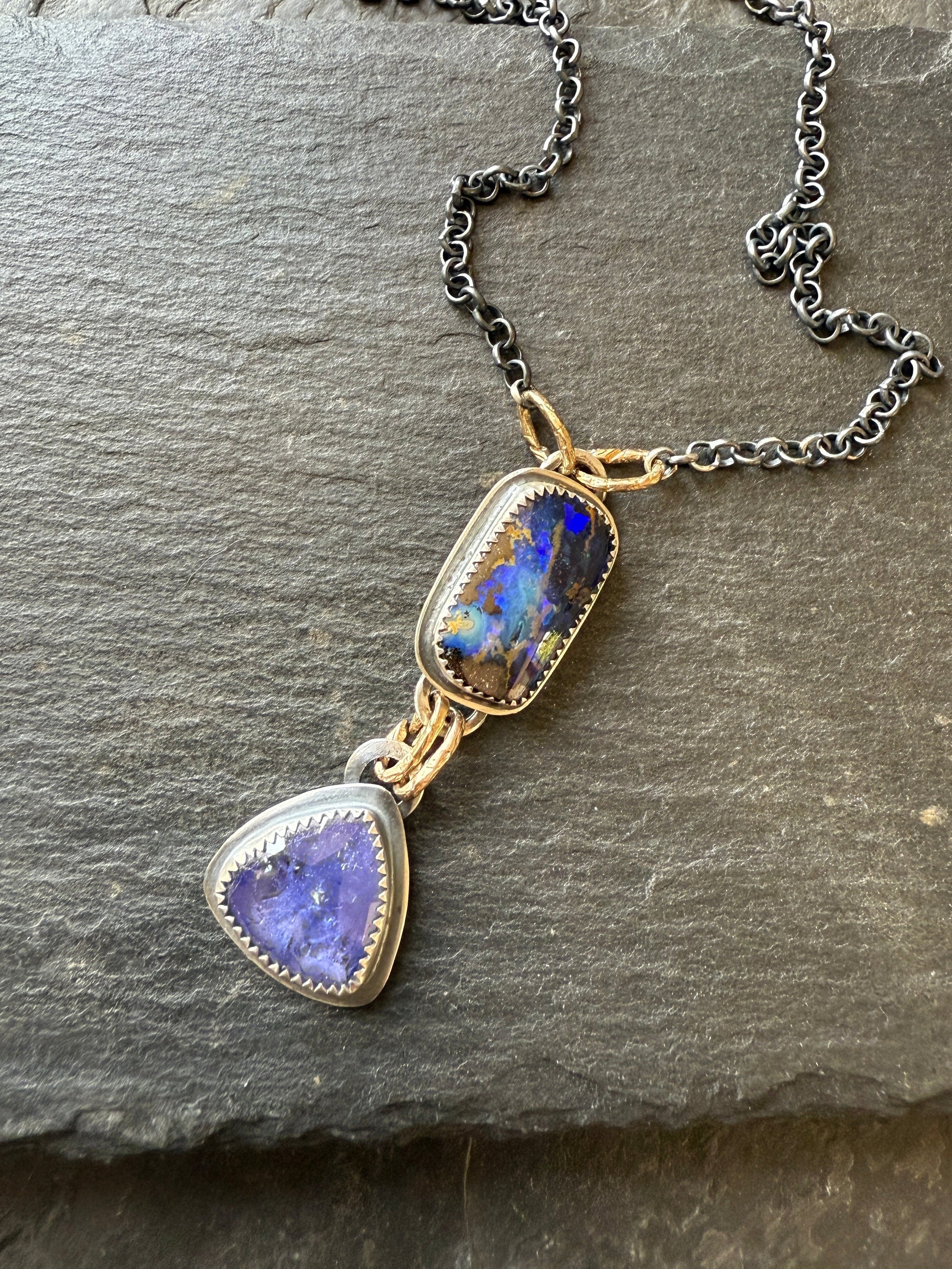 Featuring a stunning blue and purple boulder opal and a tanzanite gemstone. The stones are set in fine and sterling silver. The pendants hang from gold bronze links and an 18” sterling chain.