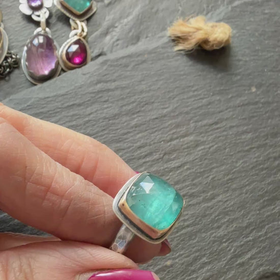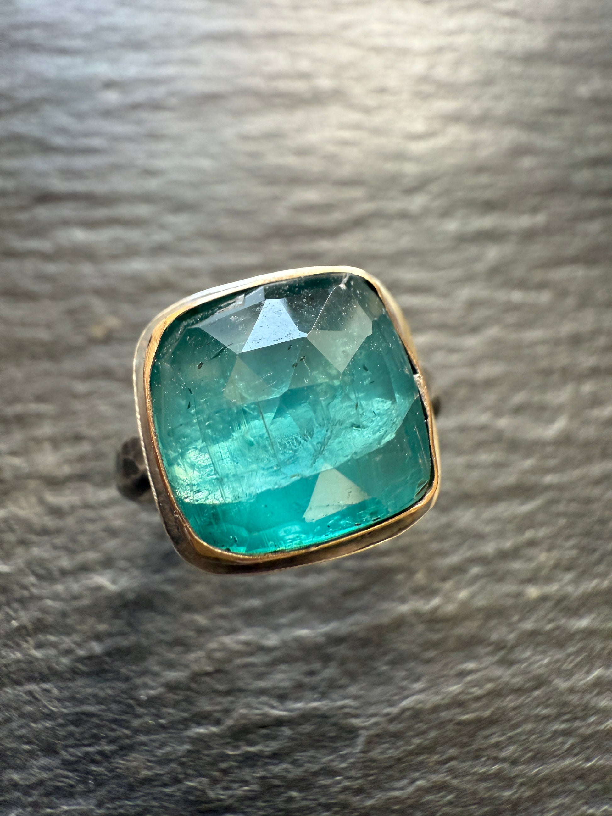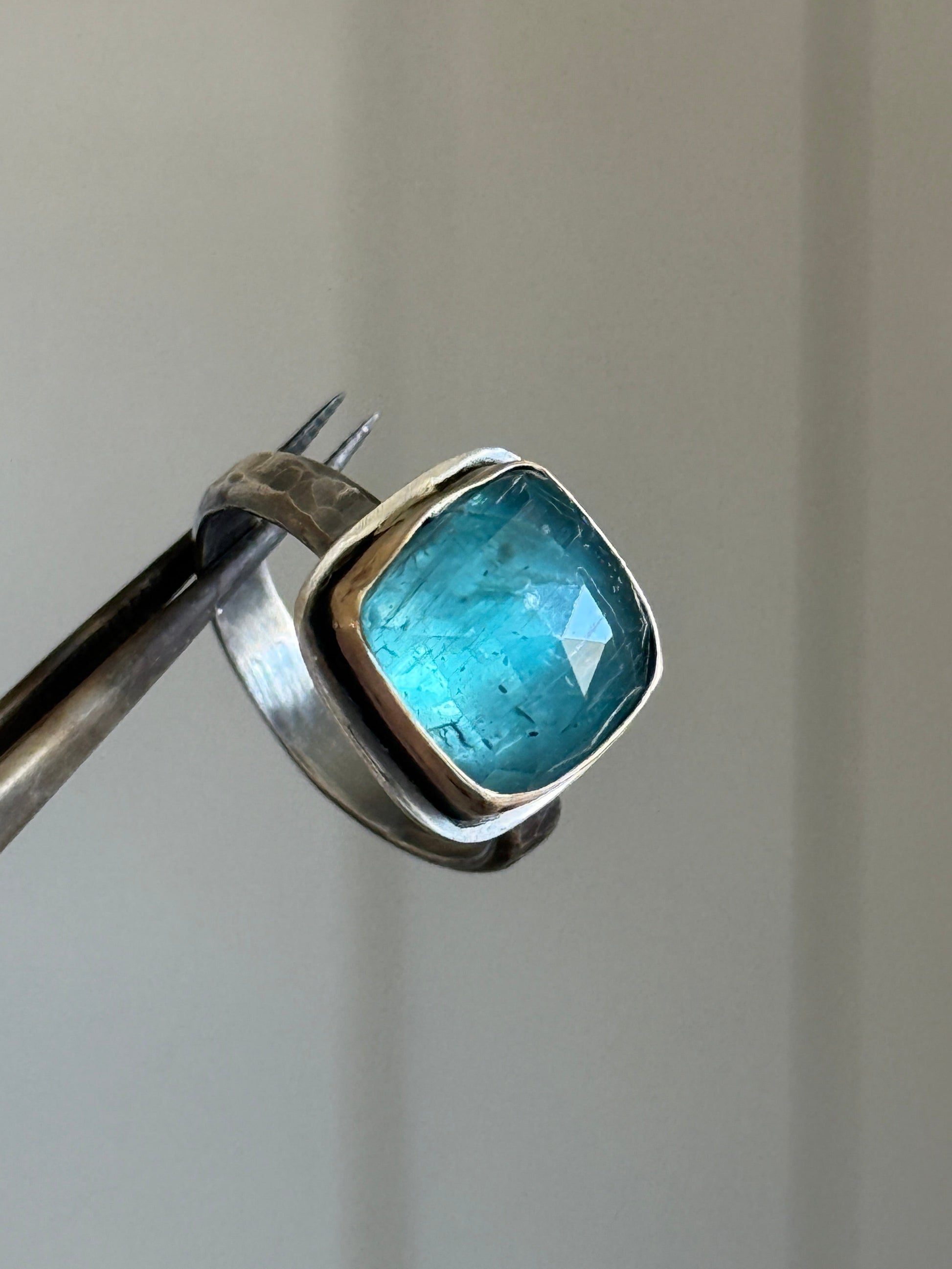 Featuring a teal blue kyanite, faceted for maximum sparkle. This lovely gemstone is set in 14k gold fill and sterling silver. The unique stone sits atop a sterling silver band which has been hammered, oxidised and polished. This ring size is N 1/2 (US 7). The stone measures 12mm approximately, excluding the setting.