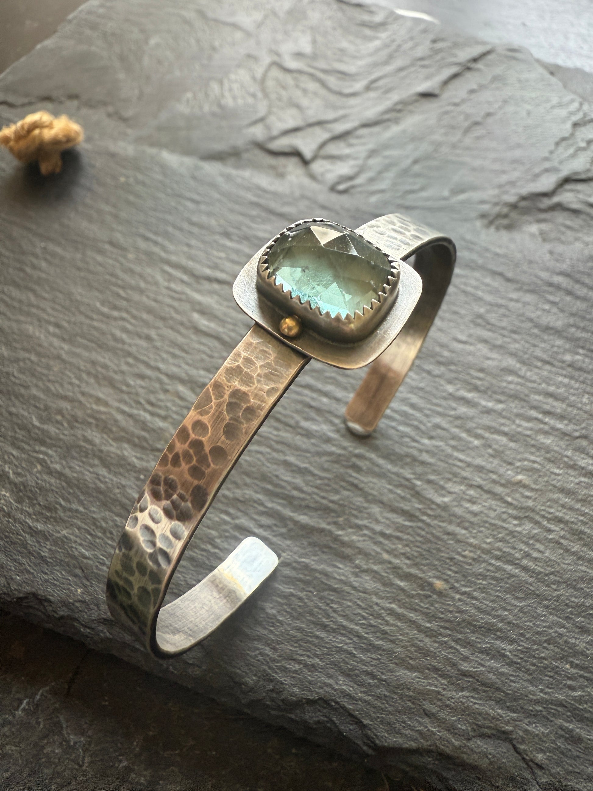 Featuring a sparkly Teal Fluorite gem set in fine and sterling silver with an 18k gold accent, on a hammered cuff bangle. The stone measures 11mm x 9mm. This bangle will fit a 6 - 6.5” wrist as it is slightly adjustable. Please note that this bracelet should be placed side on to your wrist. Looks great worn alone or stacked.