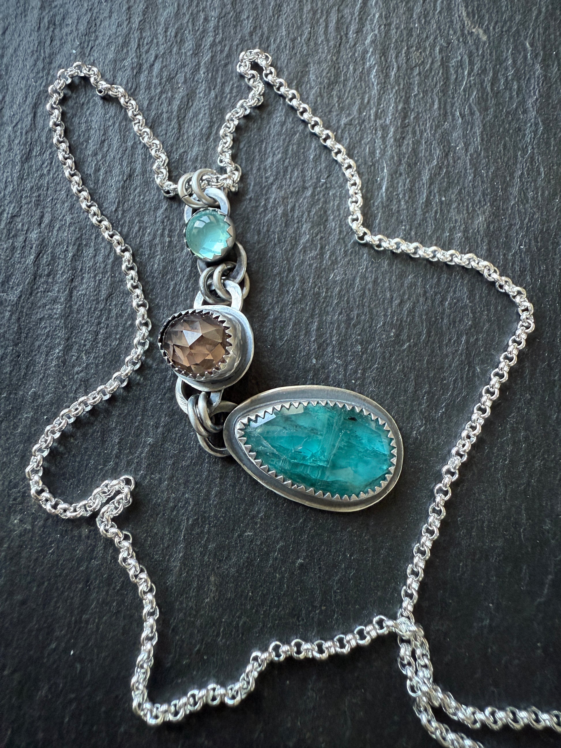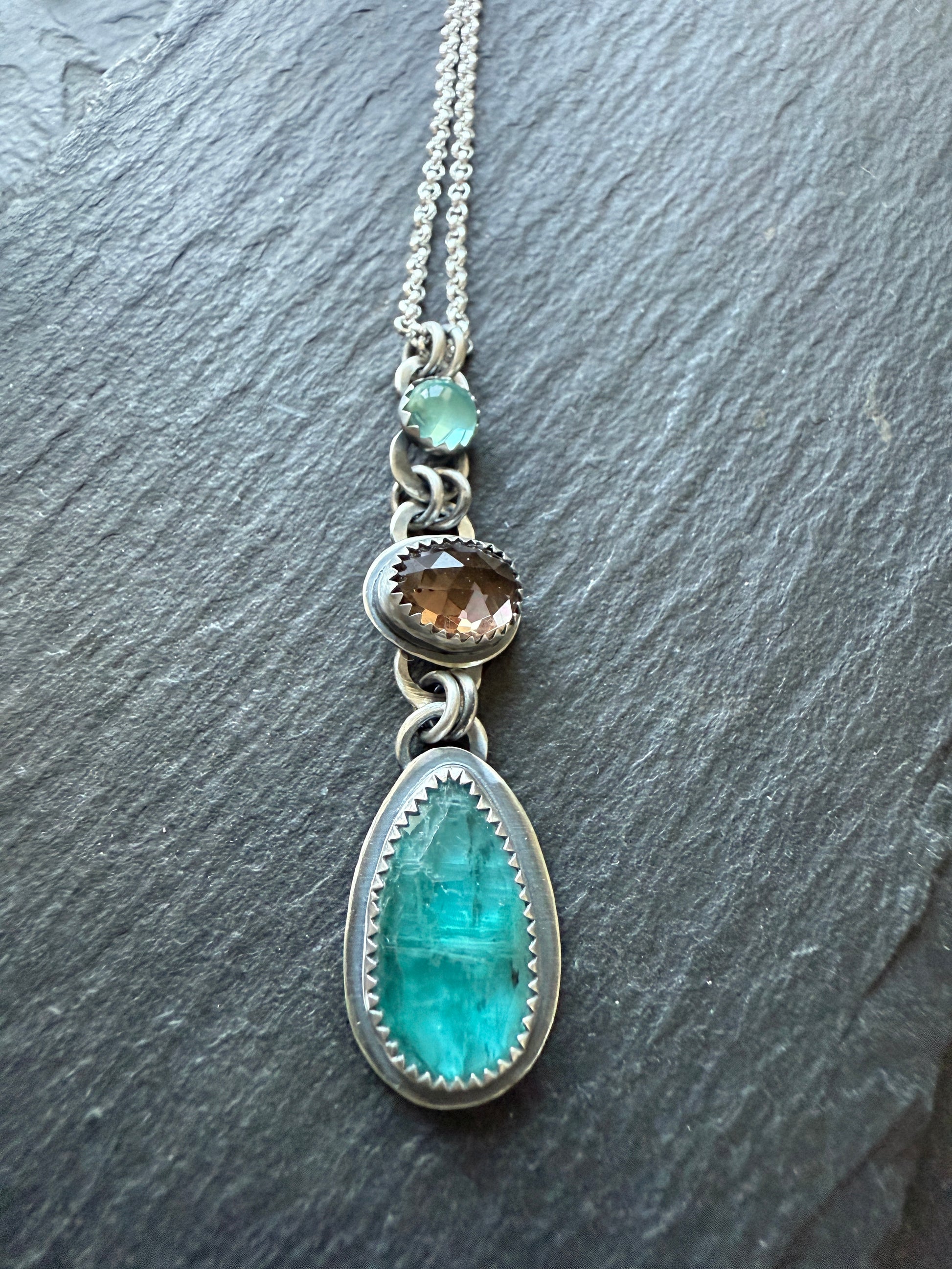 Featuring a lovely soft palette of topaz, smoky quartz and kyanite gemstones set in oxidised fine and sterling silver. The pendants hang from sterling silver links and a sterling shiny 18” chain.