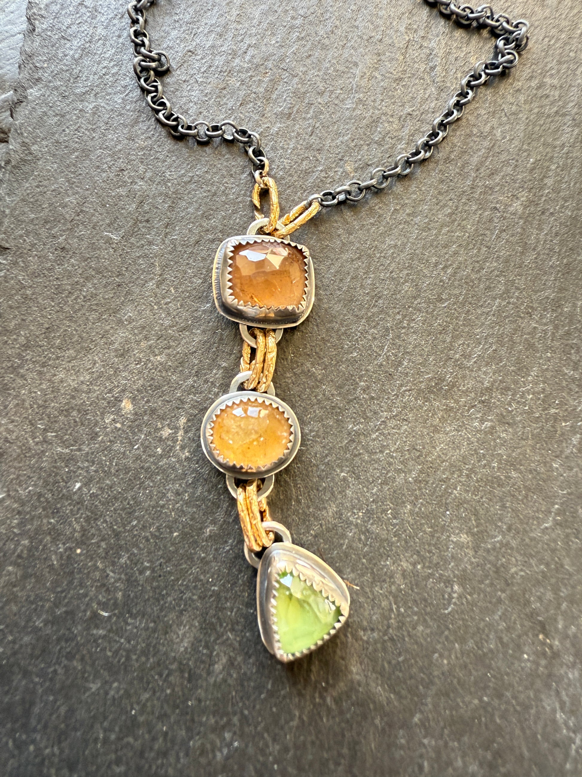 Featuring a triple charm necklace of topaz, peridot and a yellow tourmaline. Each stone has been bezel set in fine and sterling silver, oxidised and polished to a rustic patina. The pendants hang from gold bronze links and an 18” dark oxidised chain.