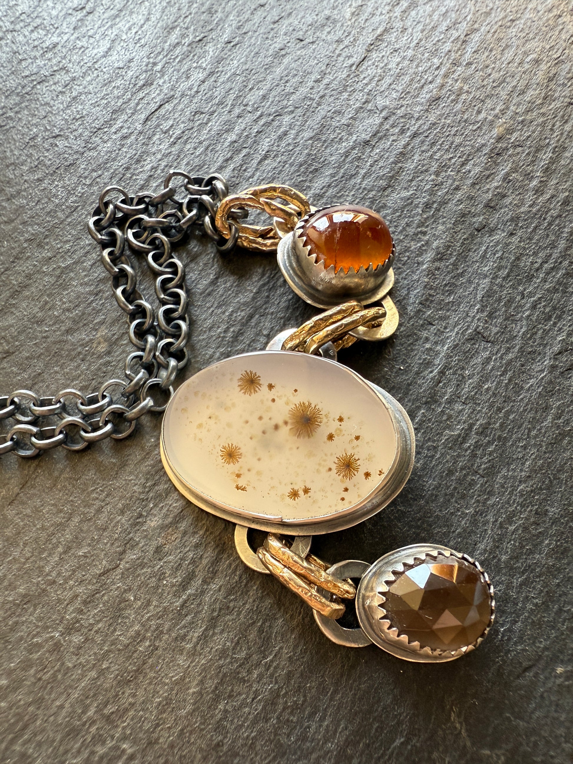 Featuring a triple charm necklace consisting of a Hessonite garnet, a Dentritic Agate and a smoky quartz. Each charm hangs from gold bronze links. The 18” chain is a dark oxidised sterling silver. The drop length of the pendant is approximately 59”.