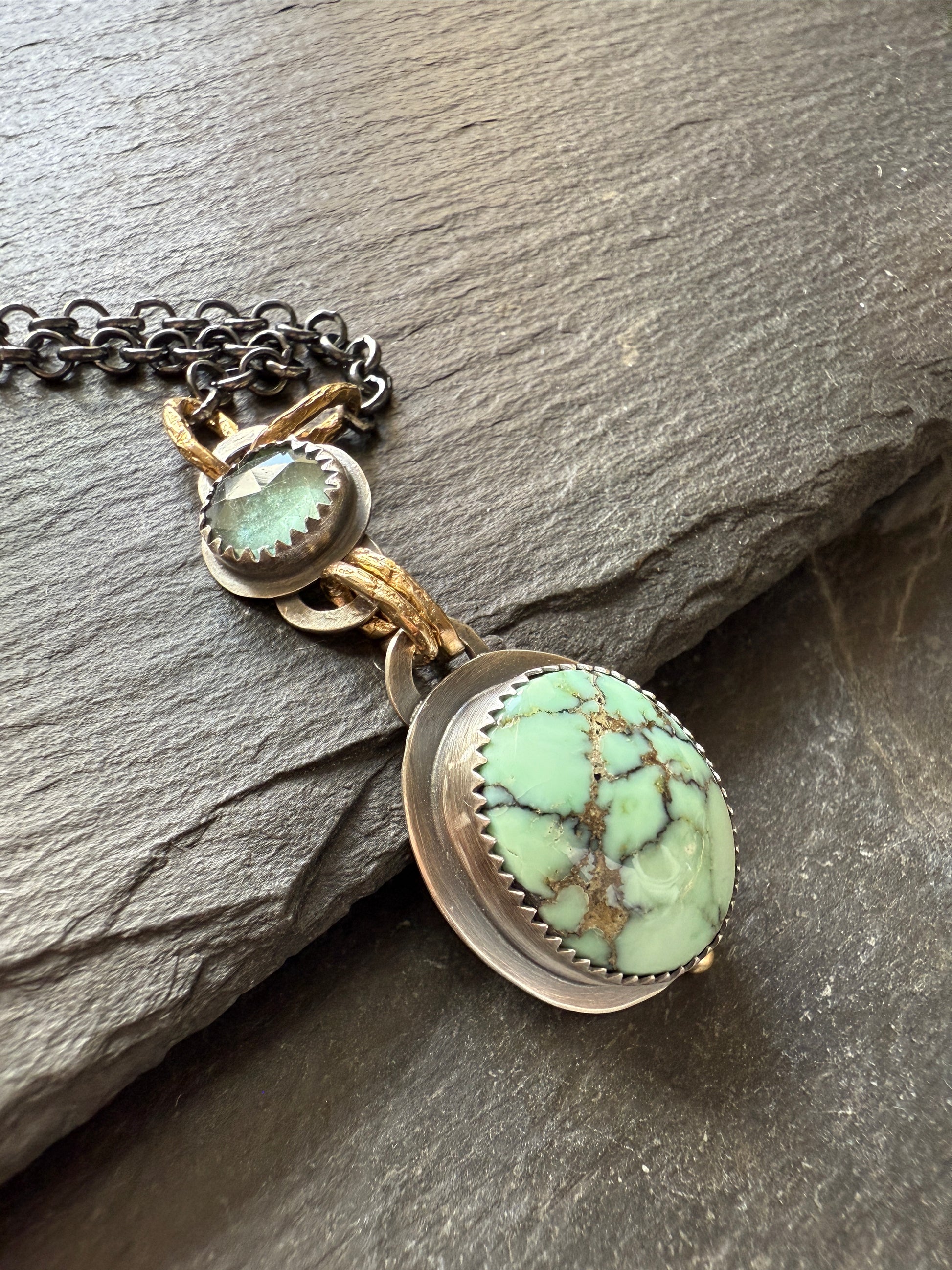 Featuring a turquoise and minty green tourmaline. These beautiful stones are set in fine and sterling silver with a 18k gold accent. The pendants hangs from gold bronze links and a dark oxidised sterling chain. The turquoise measures 116mm x 15mm. The Sterling chain is measures 18” approximately.